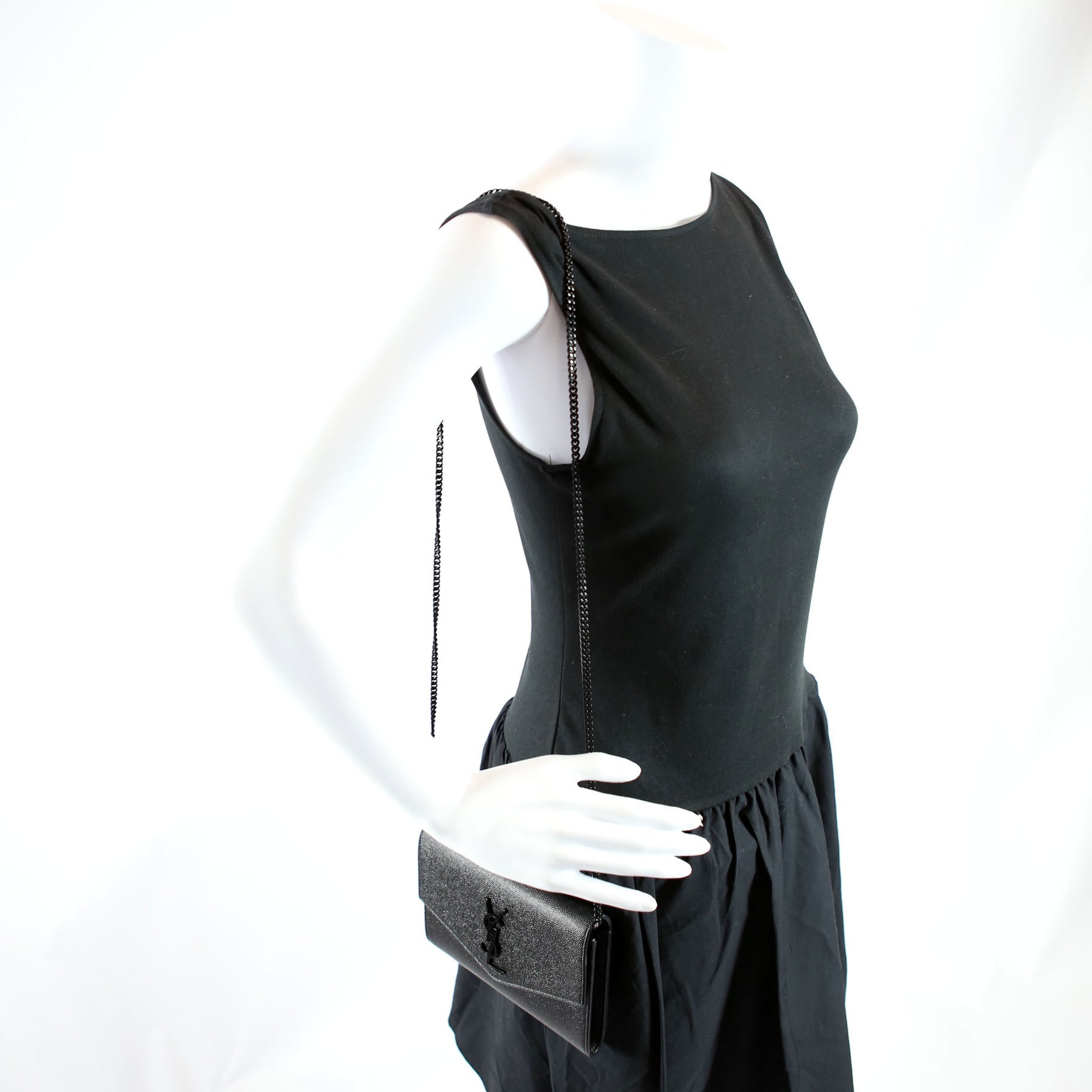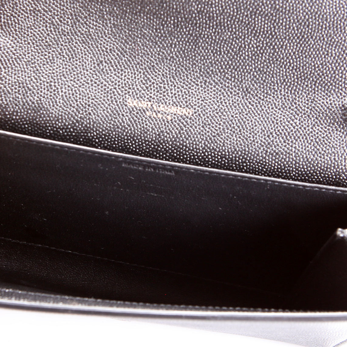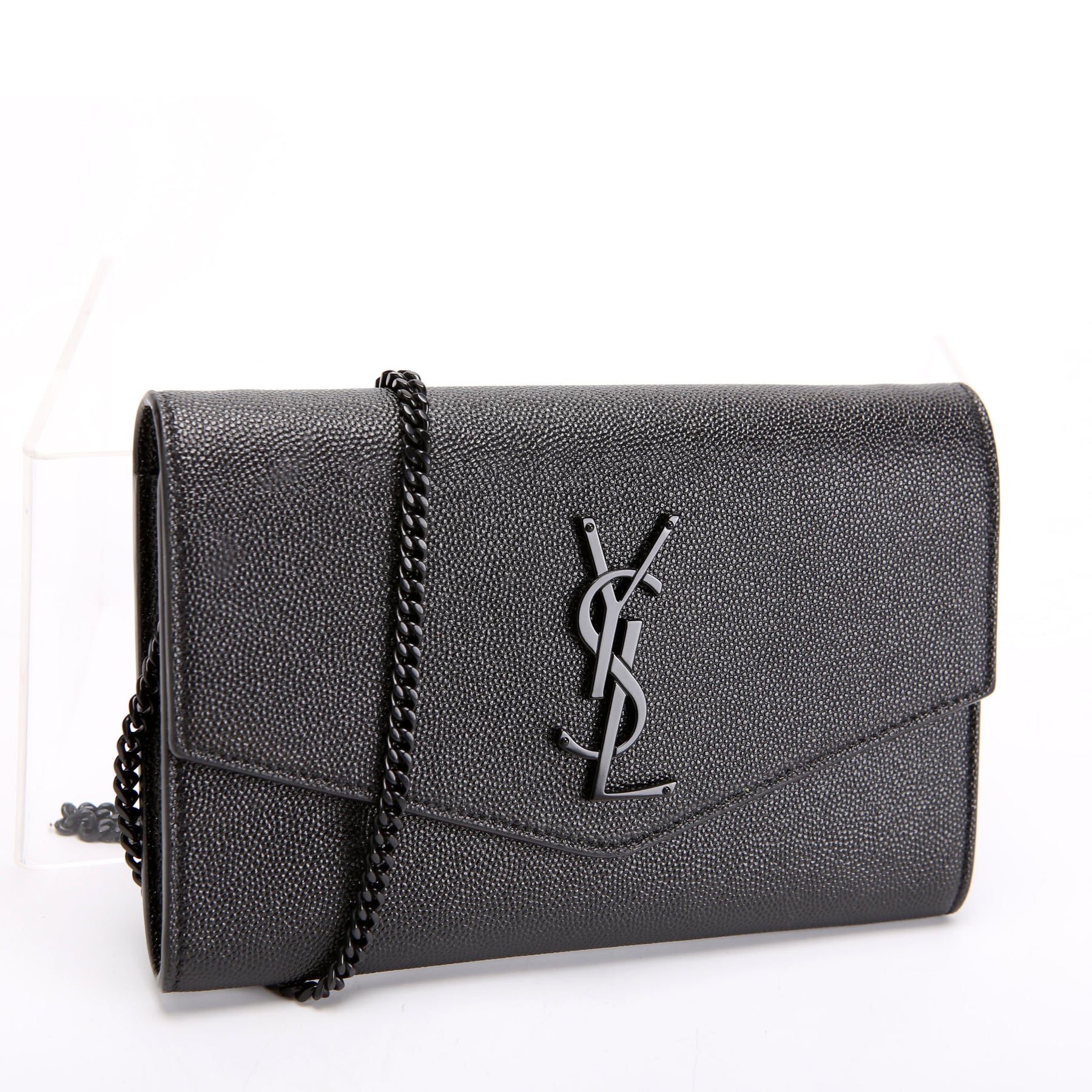 This pre-owned Saint Laurent Uptown Chain Wallet is guaranteed 100% authentic. The exterior is in the classic Grain De Poudre leather.