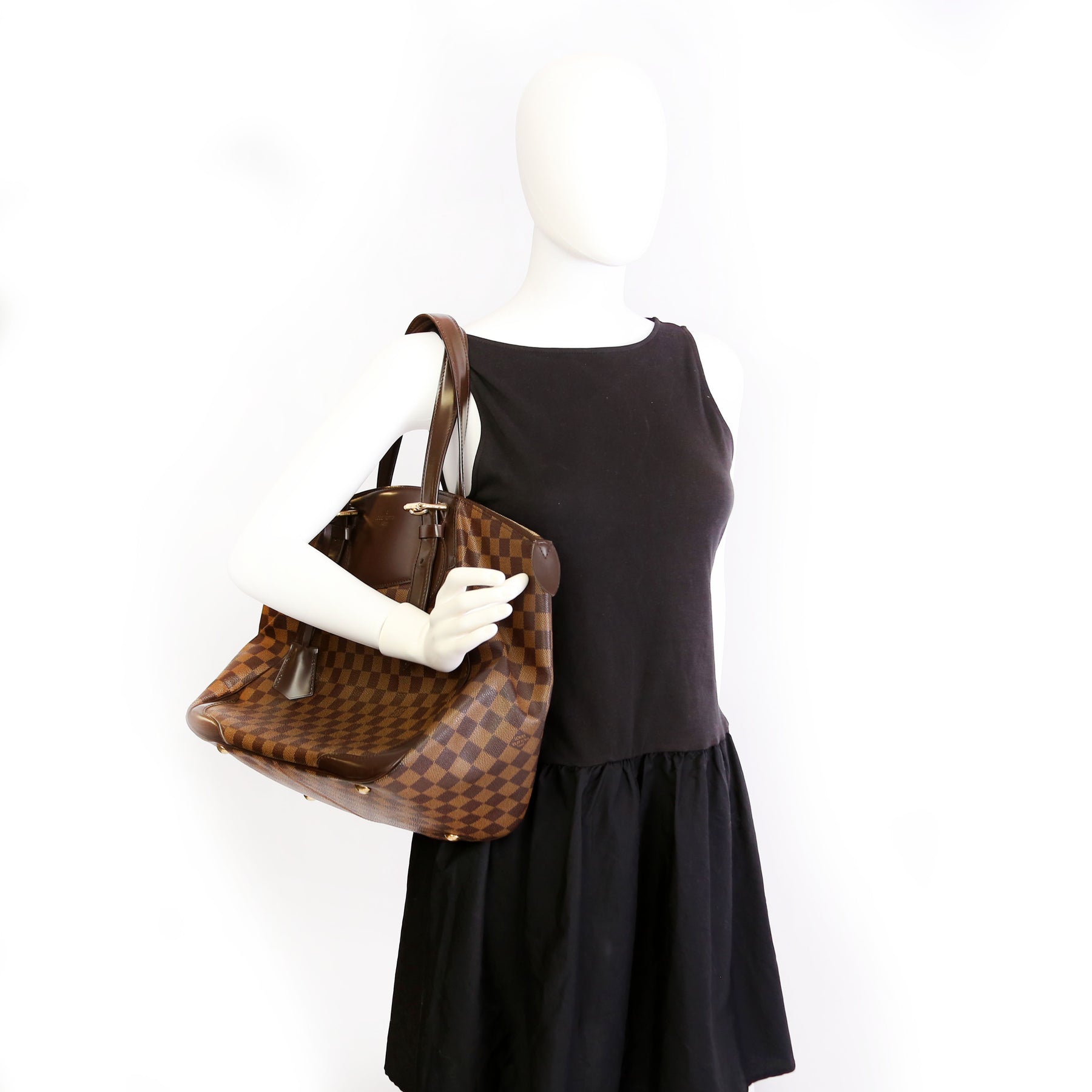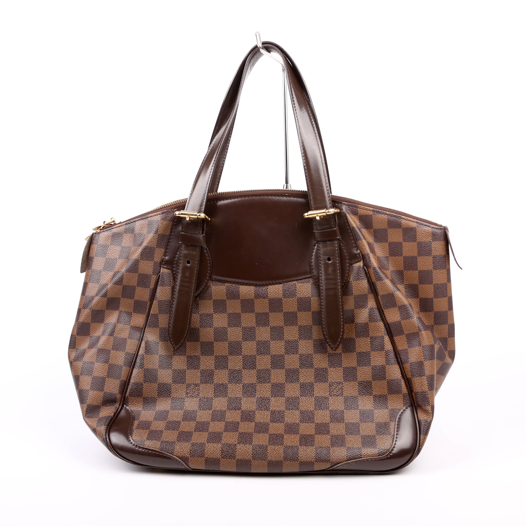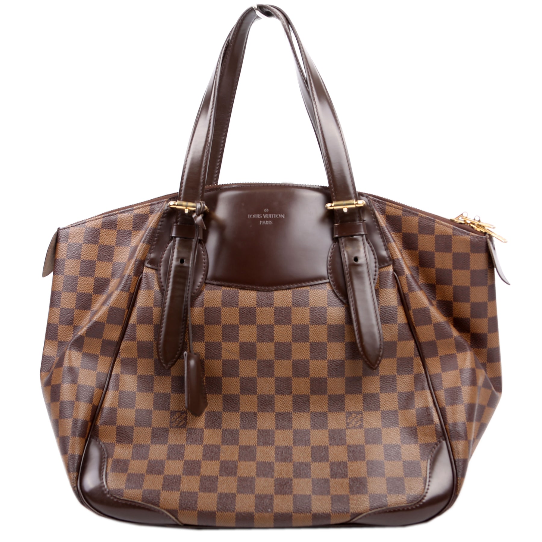 This pre-owned Louis Vuitton Verona GM is guaranteed 100% authentic. The exterior is in the classic Louis Vuitton Damier Ebene coated canvas.
