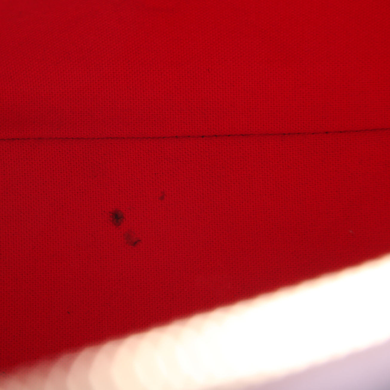 Interior: The base of the bag features marks, stains, and wear. The interior features two open pockets.