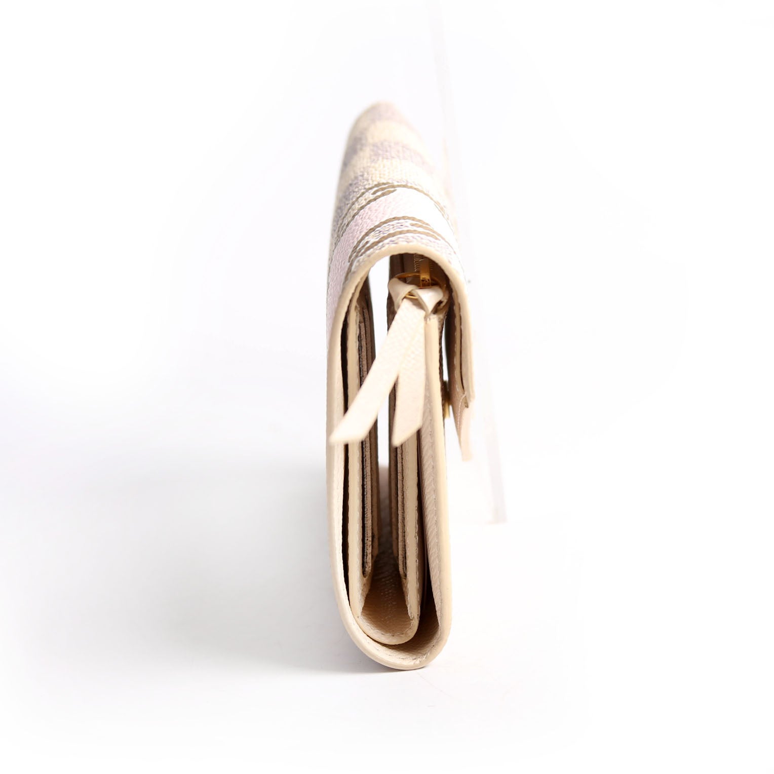 Interior: The interior is free from wear. It features eight card slots, one bill slot, and one zip closure pocket.