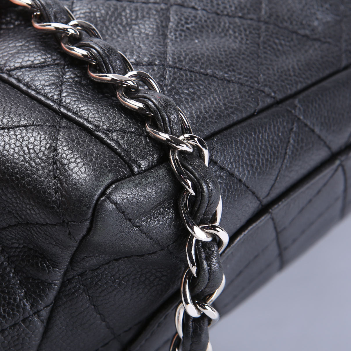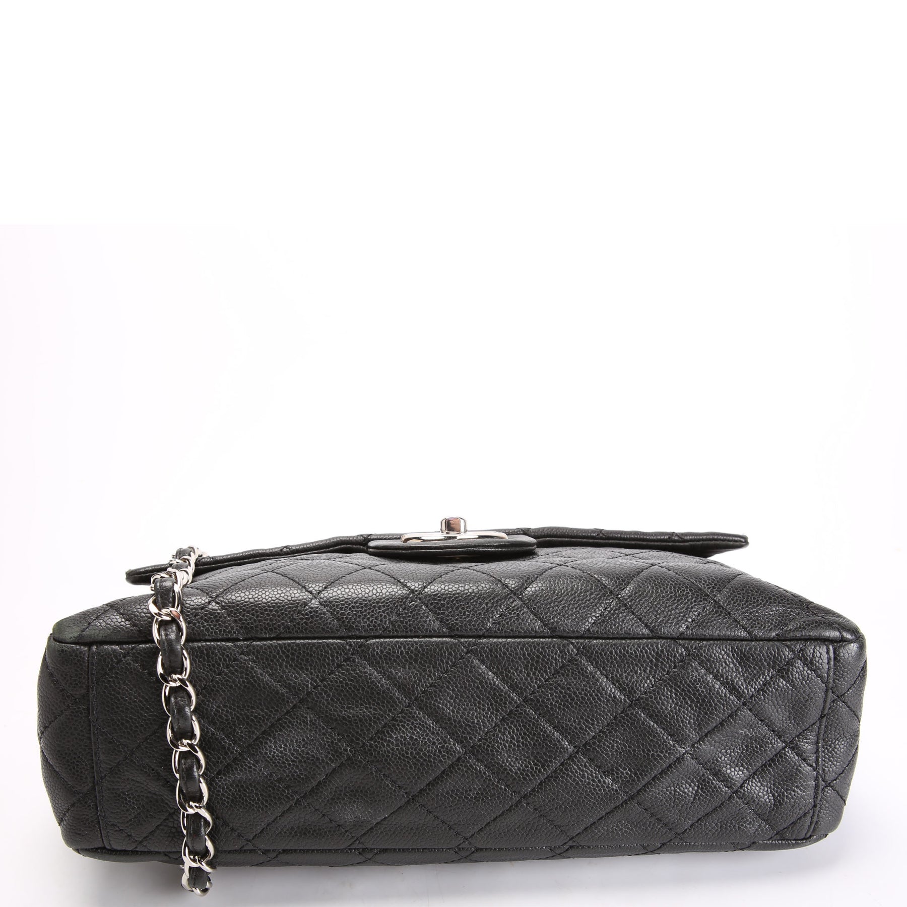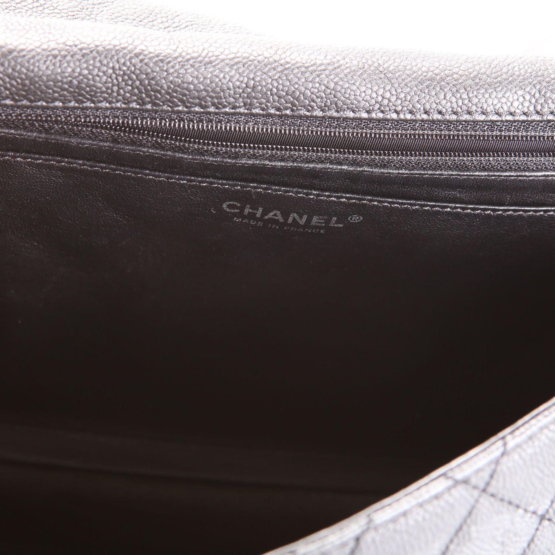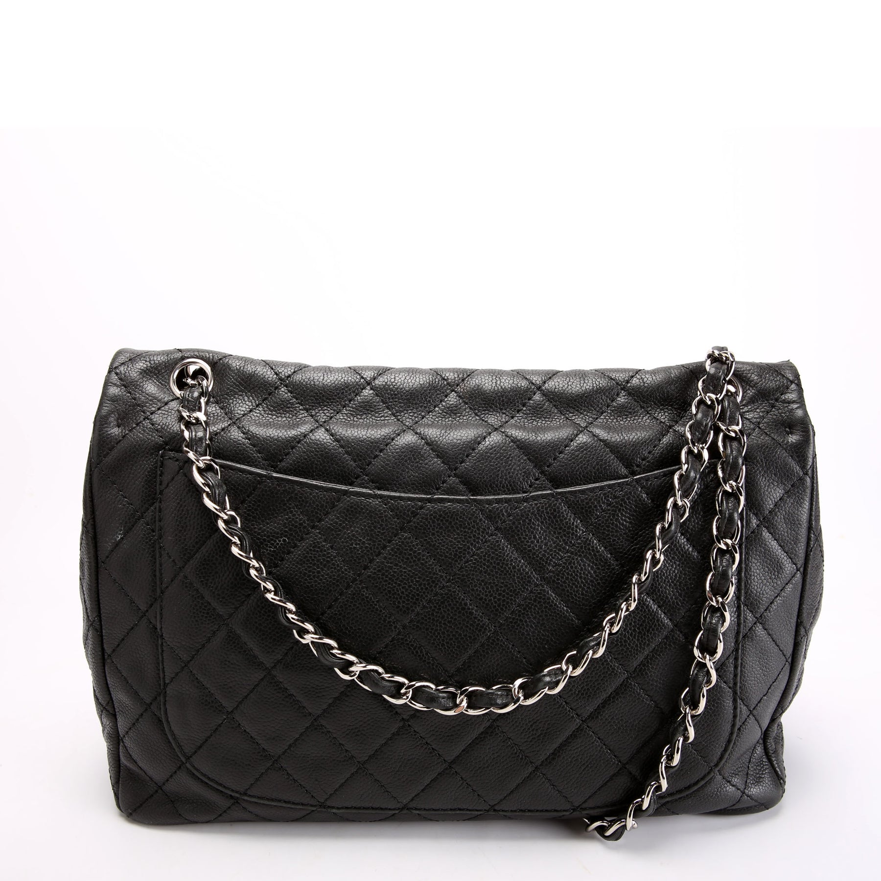 This pre-owned Chanel Jumbo Single Flap is guaranteed 100% authentic. The exterior is in the classic Chanel Washed Caviar leather.