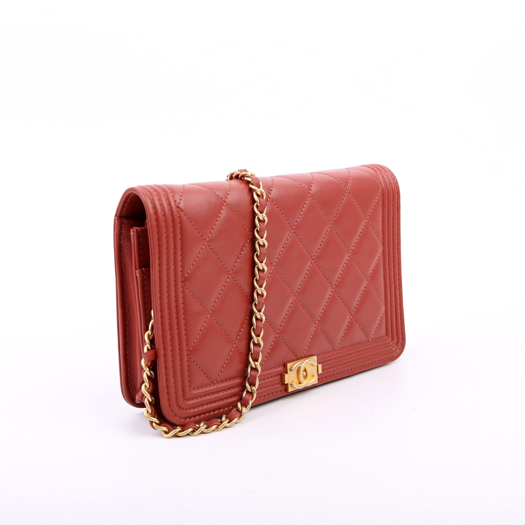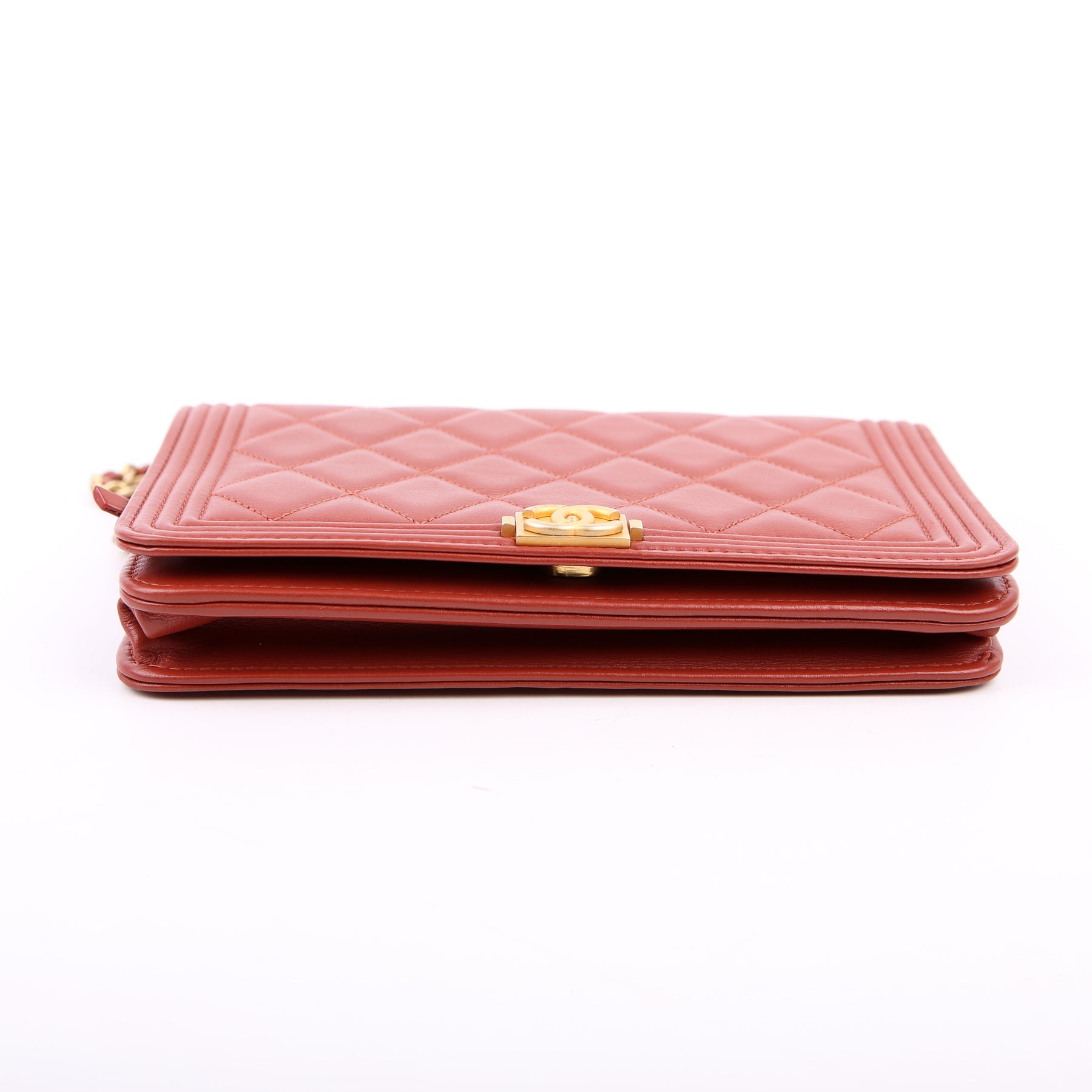 This pre-owned Chanel Boy Flap is guaranteed 100% authentic. The exterior is in the classic Chanel Lambskin leather.