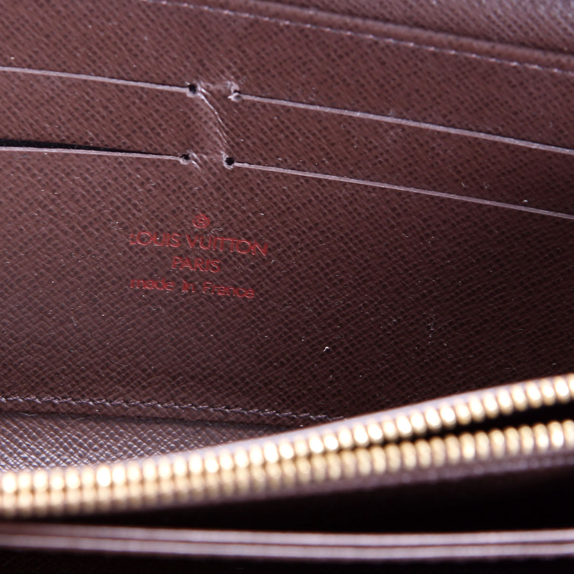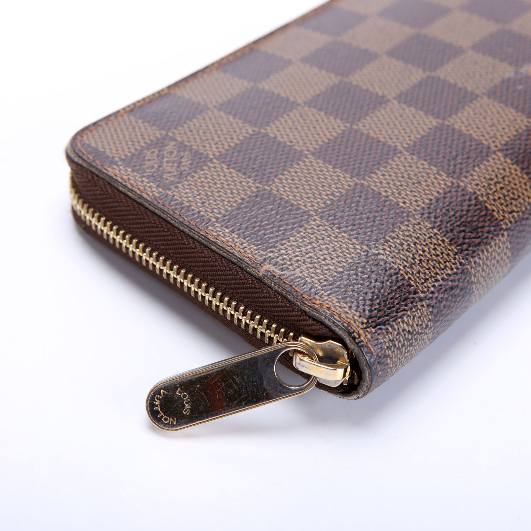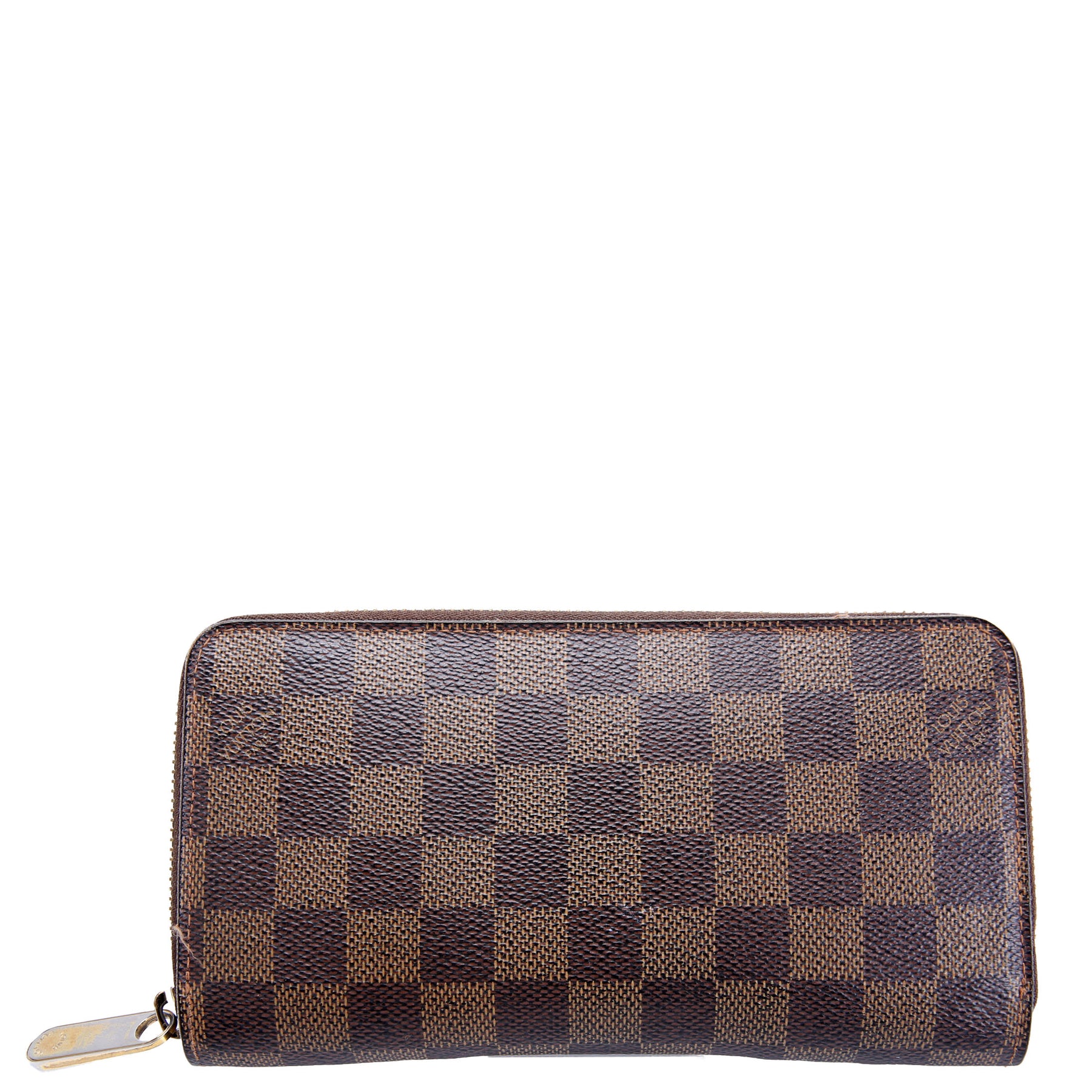 This pre-owned Louis Vuitton Zippy Wallet is guaranteed 100% authentic. The exterior is in the classic Louis Vuitton Damier Ebene coated canvas.