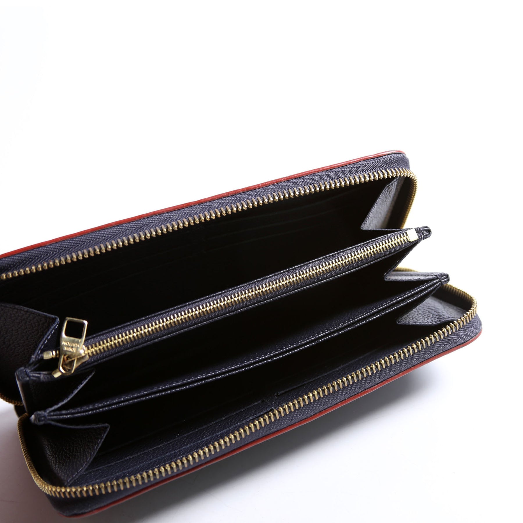 Interior: The interior is free from wear. It features twelve card slots, three open pockets, two open sections, and one zip closure section.