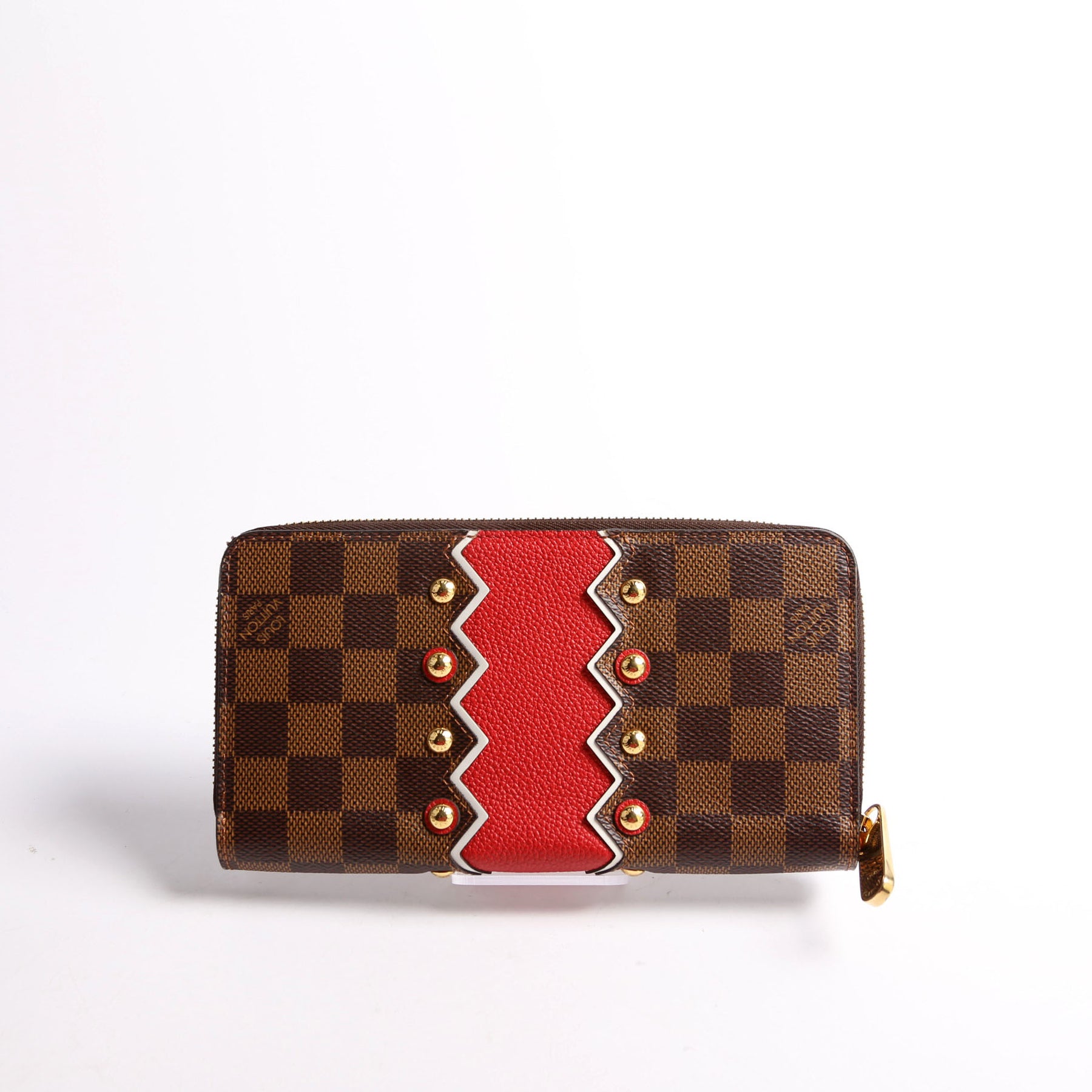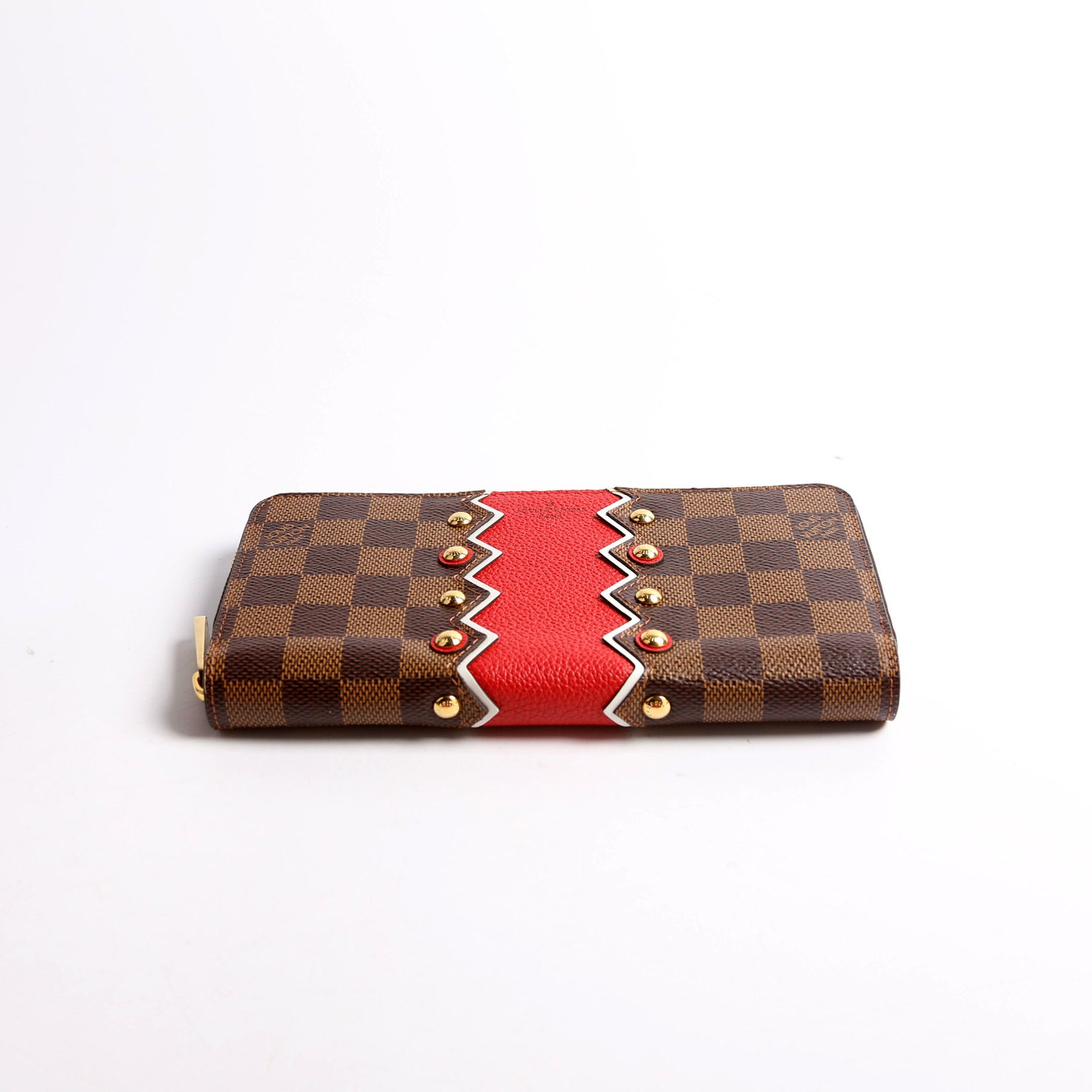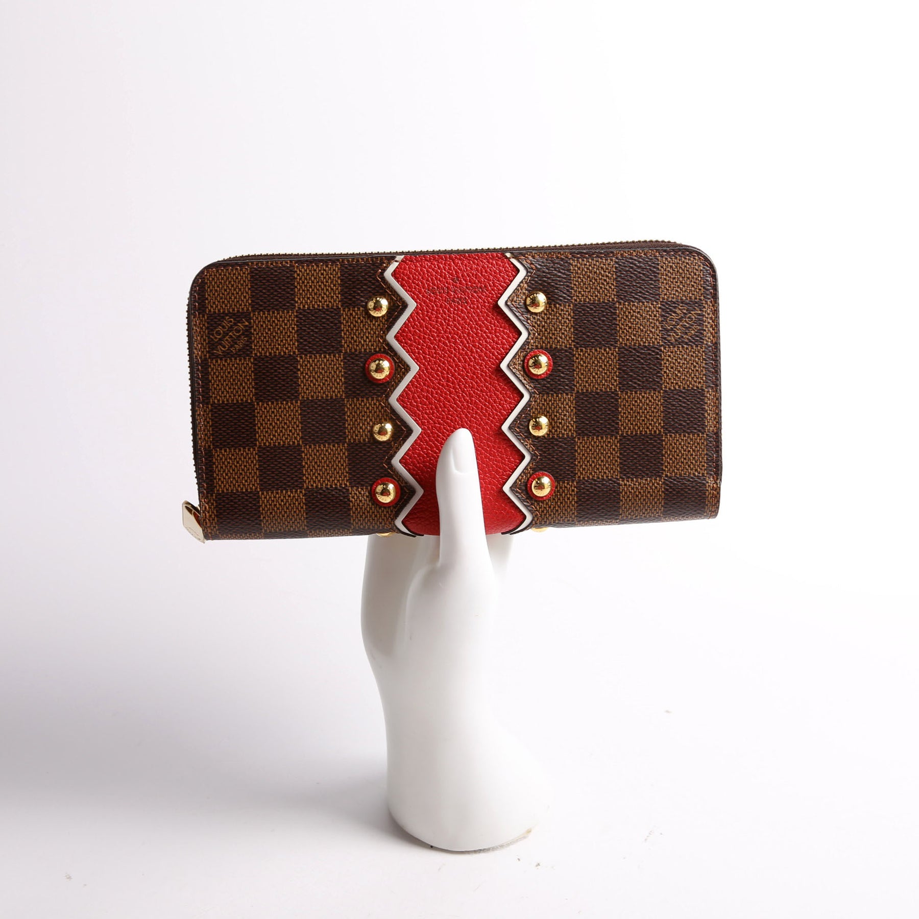 This pre-owned Louis Vuitton Zippy Wallet Karakoram is guaranteed 100% authentic. The exterior is in the classic Louis Vuitton Damier Ebene coated canvas.