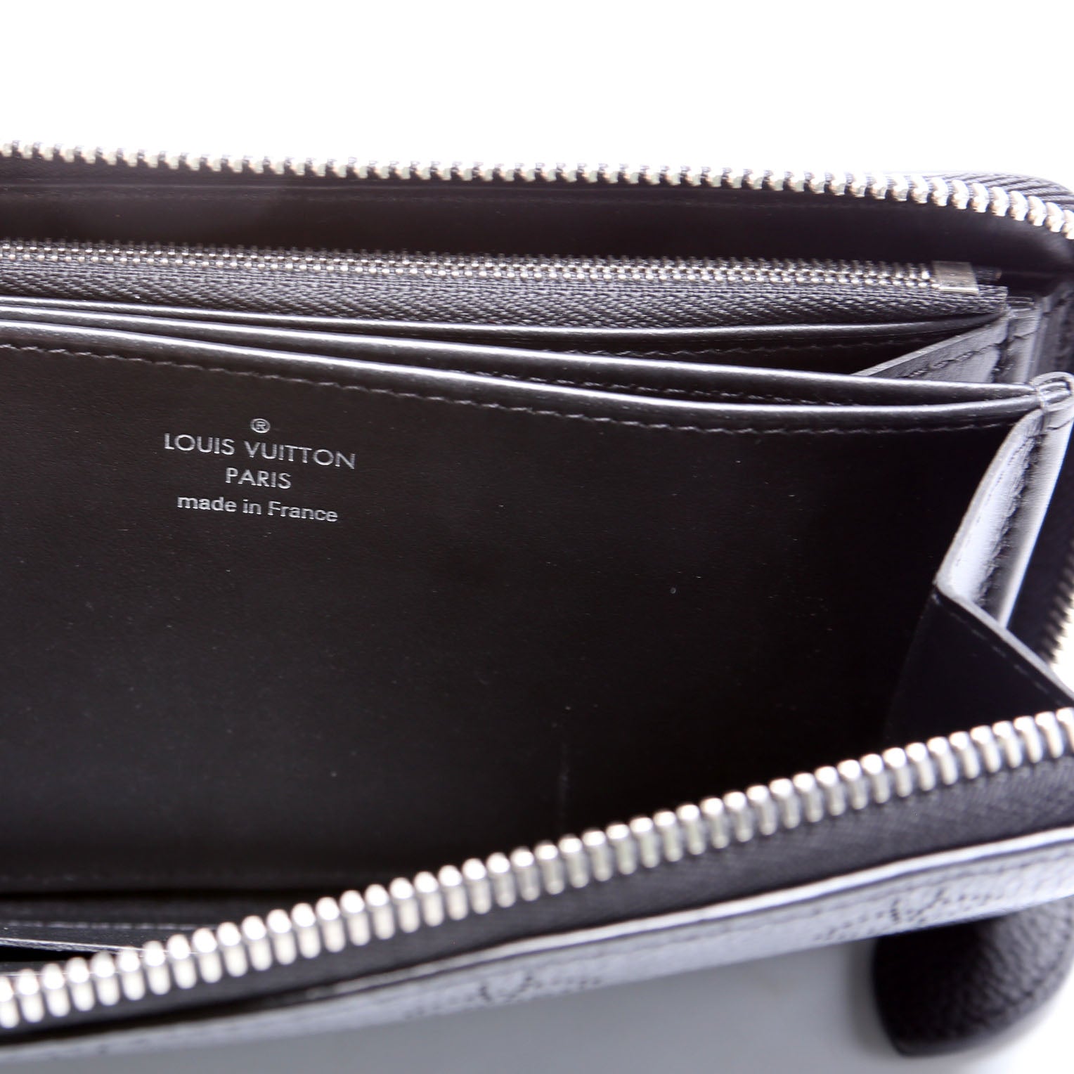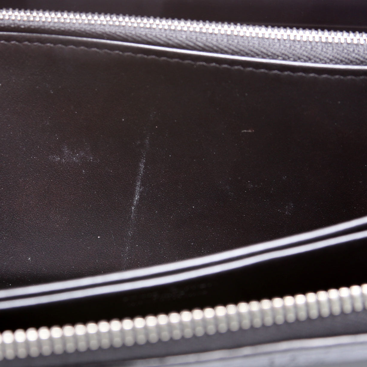 Interior: The interior is clean and free of rips or tears. The interior features one zip closure coin pouch, six bill slots, and twelve card slots.