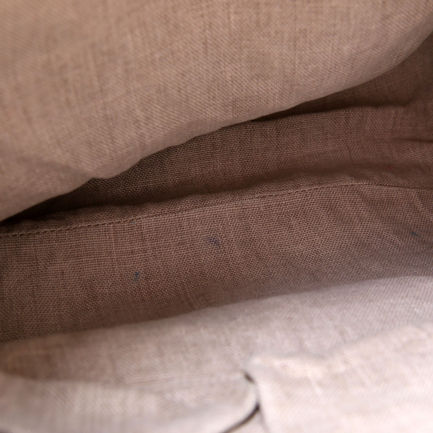 Interior: The interior shows staining and yellowing to the fabric throughout. It features two open pockets and one zip closure pocket.