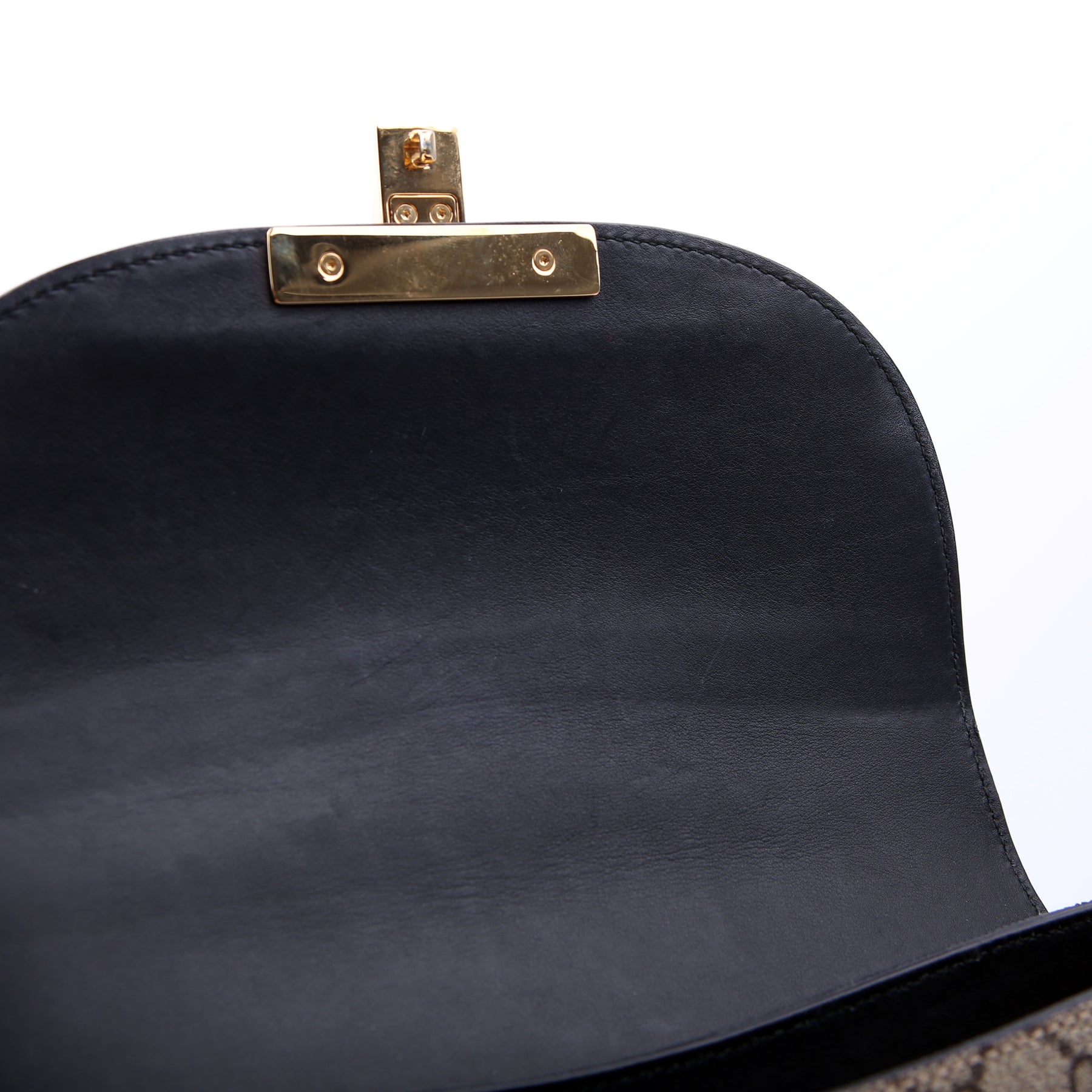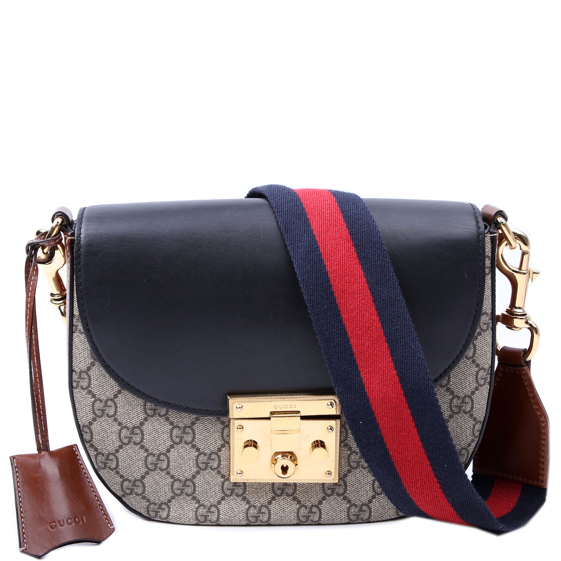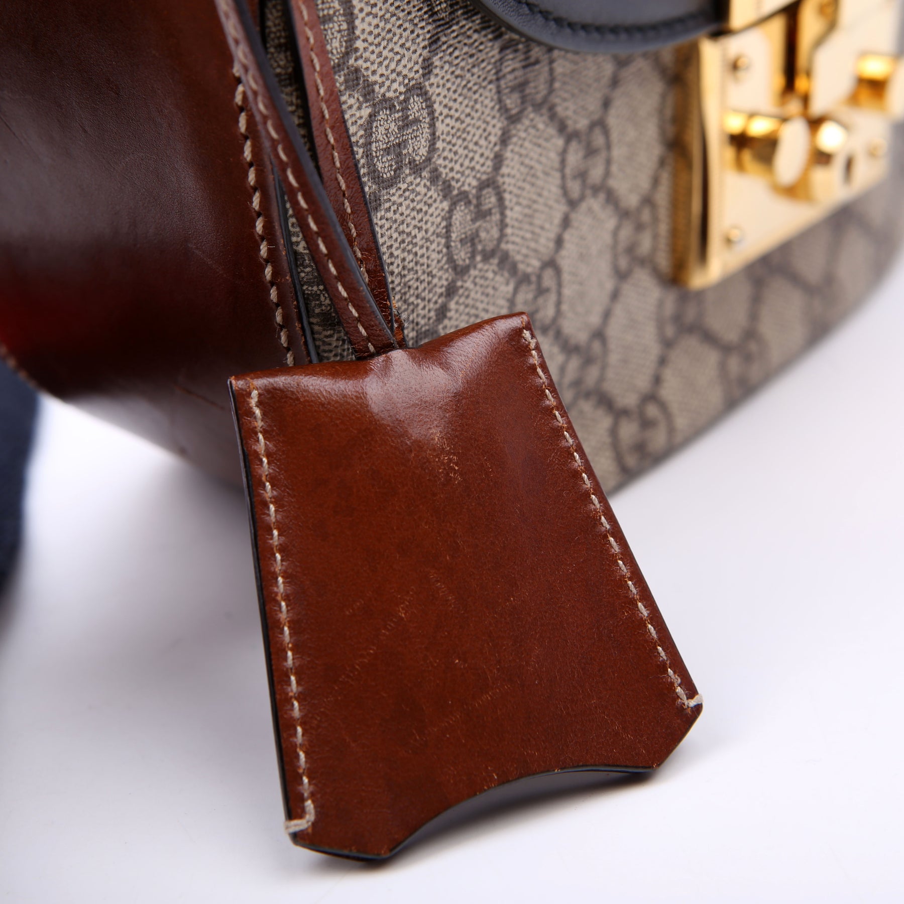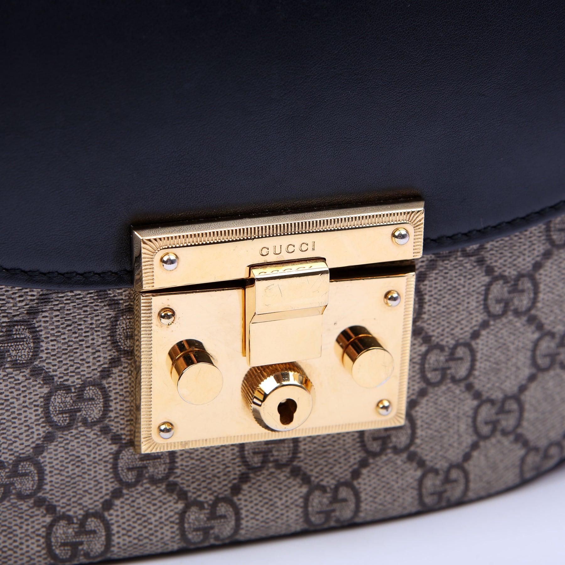This pre-owned Gucci Padlock Supreme Medium Messenger is guaranteed 100% authentic. The exterior is in the Supreme canvas.