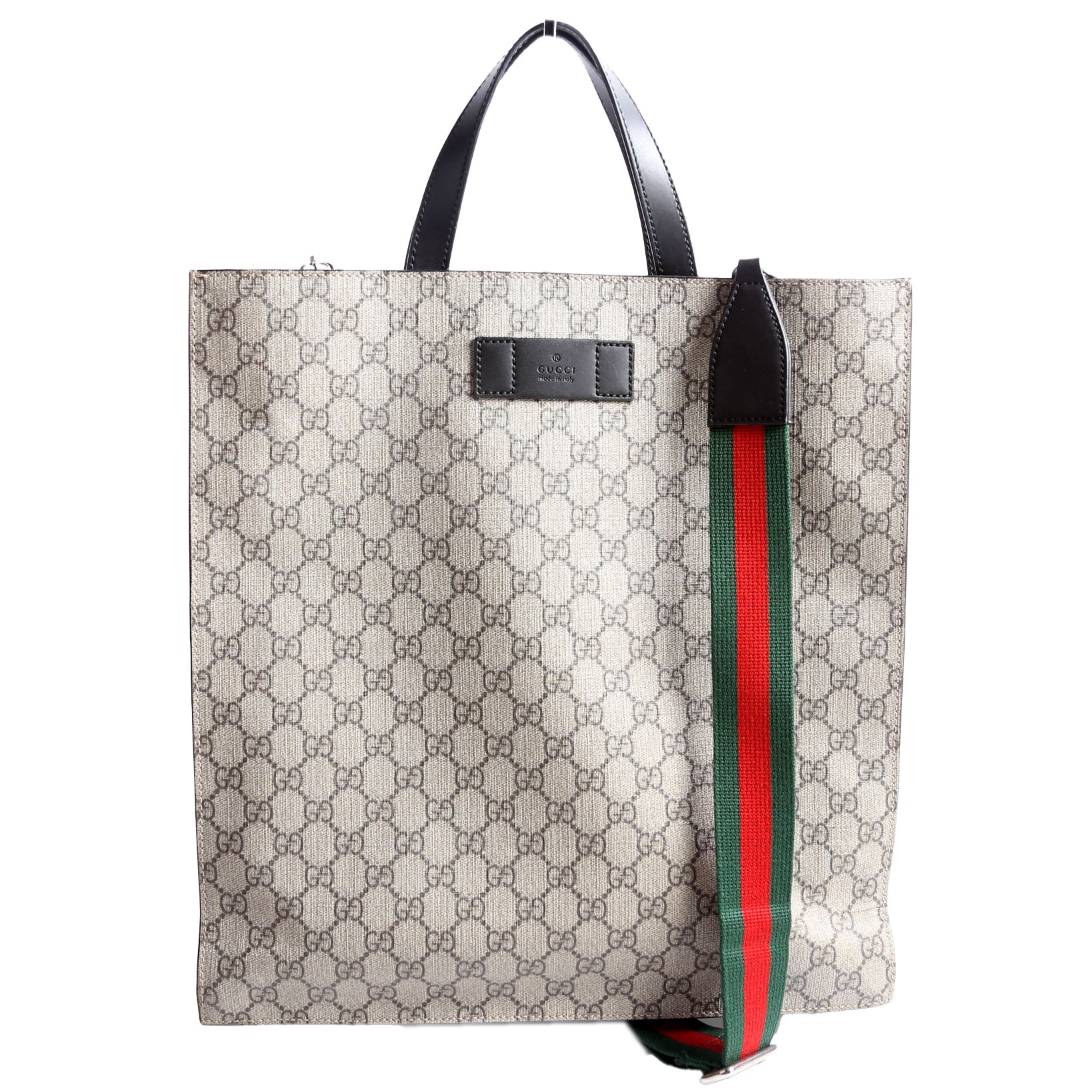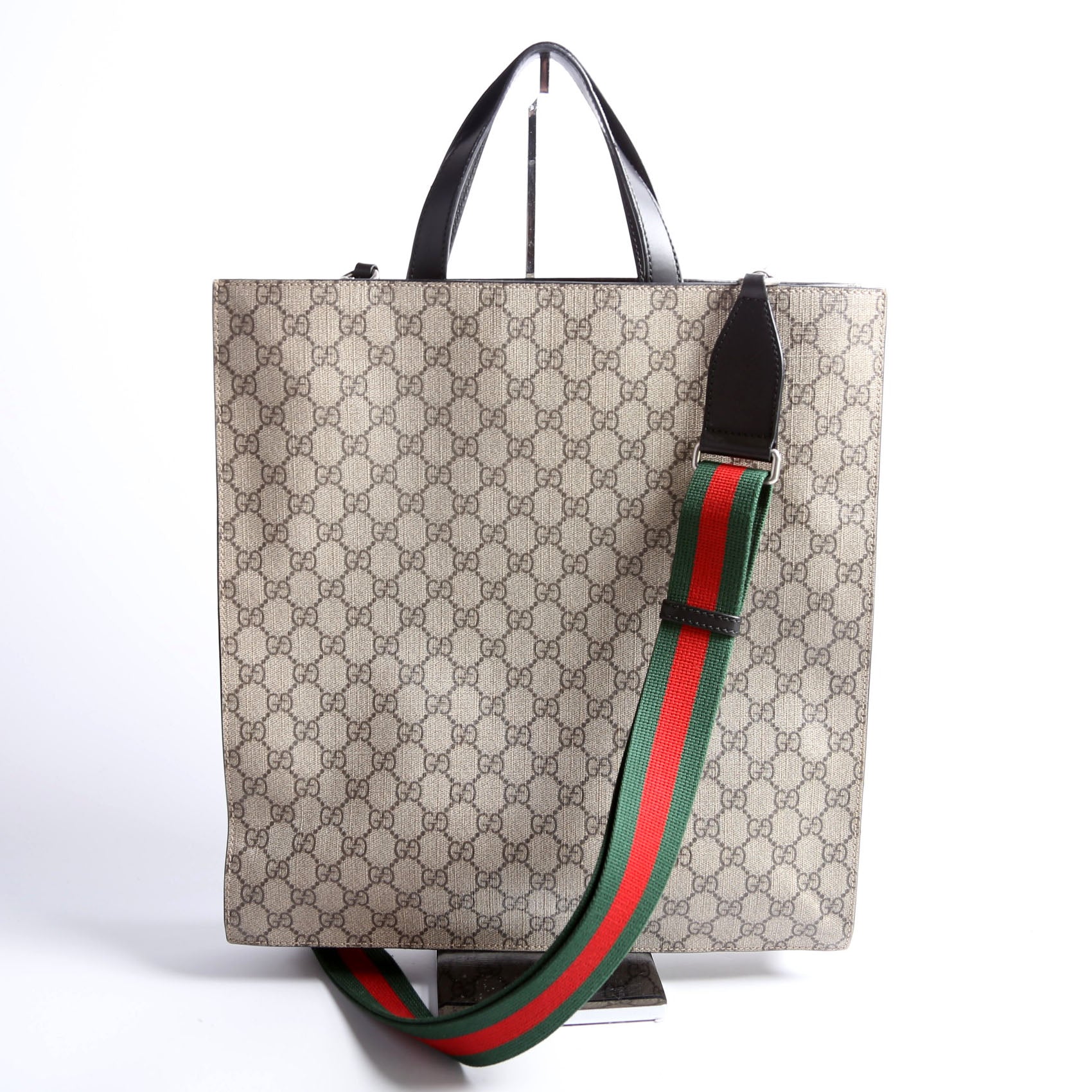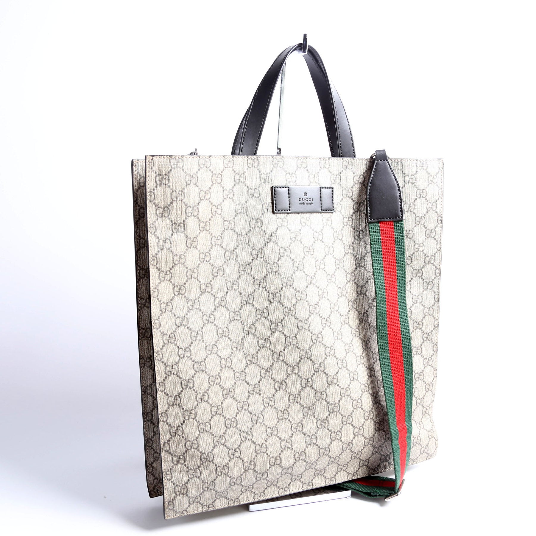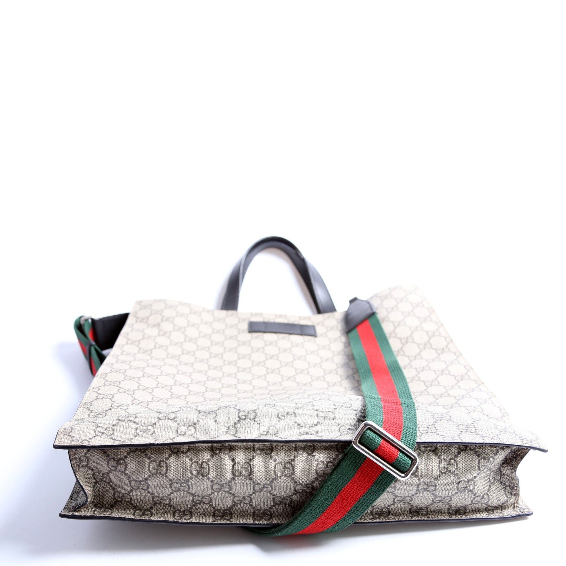 This pre-owned Gucci GG Supreme Web Vertical Tote is guaranteed 100% authentic. The exterior is in the classic Gucci GG Supreme coated canvas.