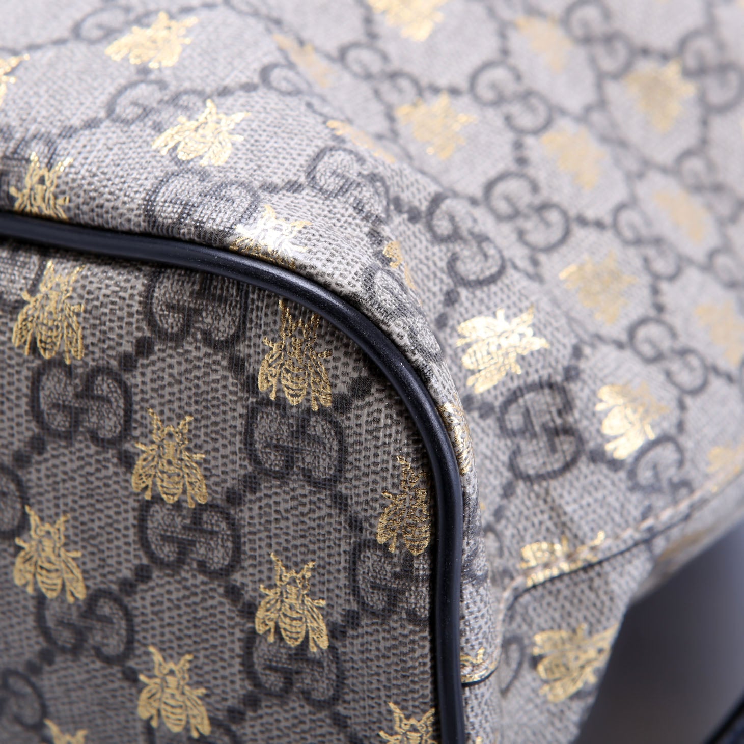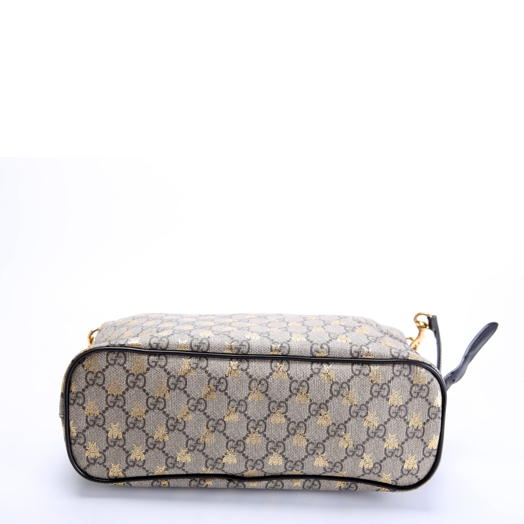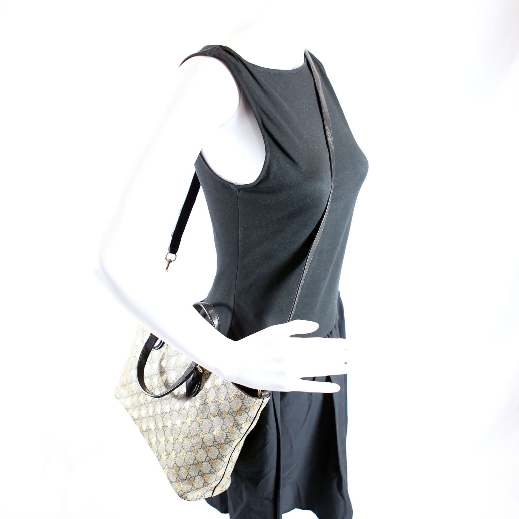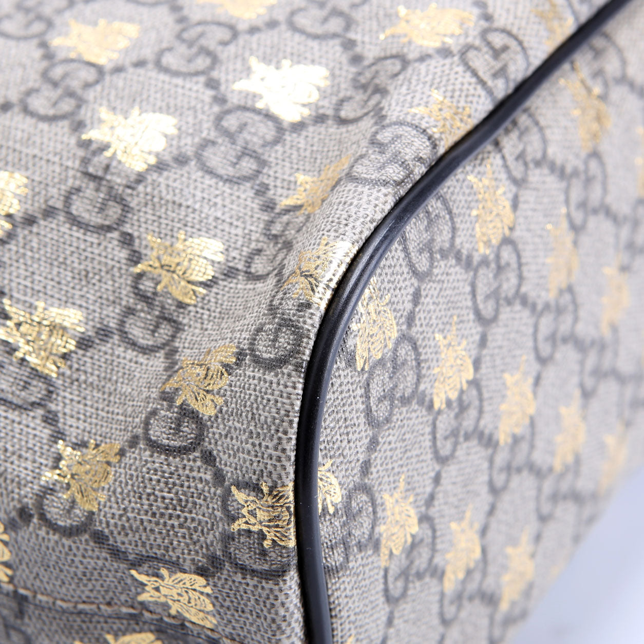 This pre-owned Gucci Bee Small Tote is guaranteed 100% authentic. The exterior is in the classic Gucci Coated Canvas Supreme.