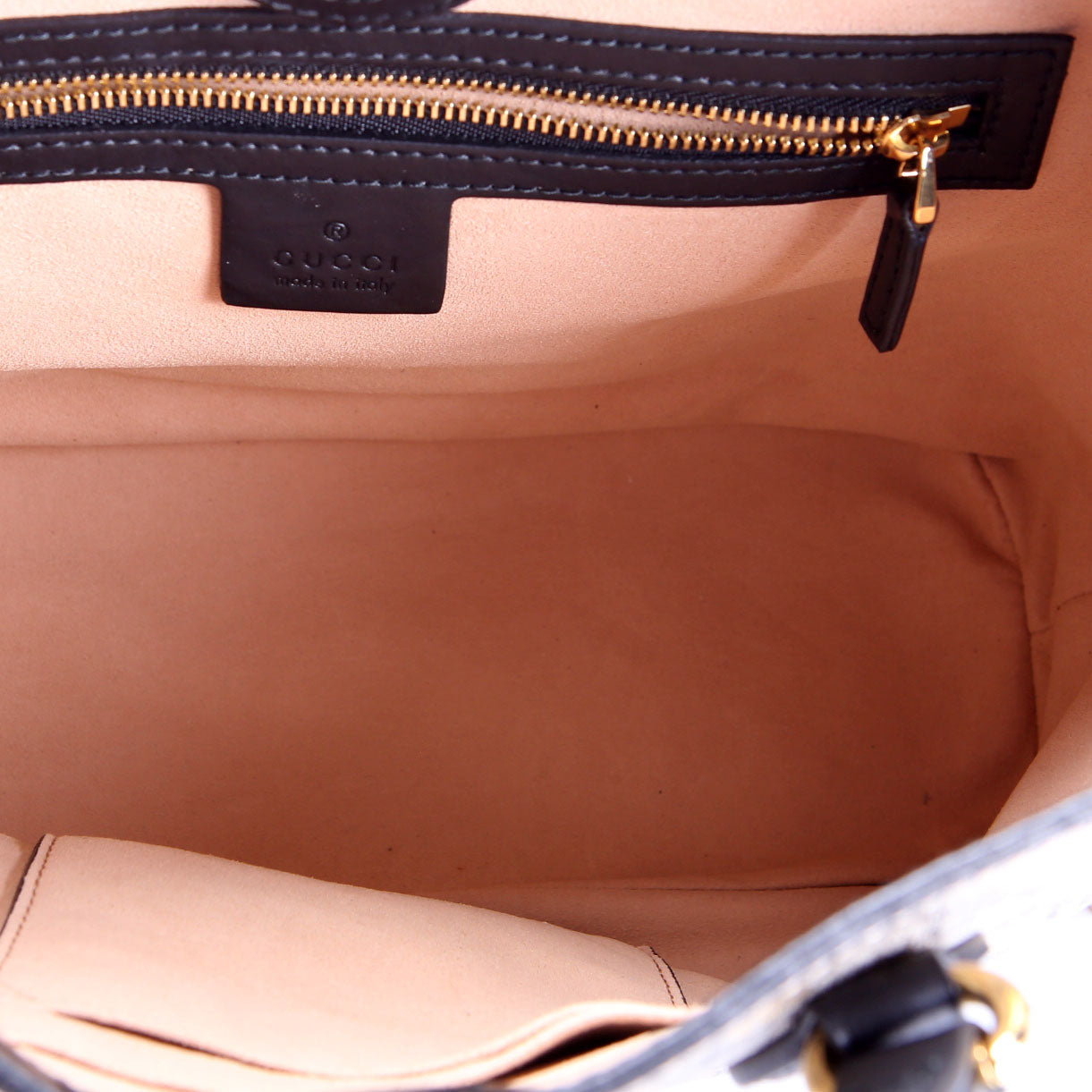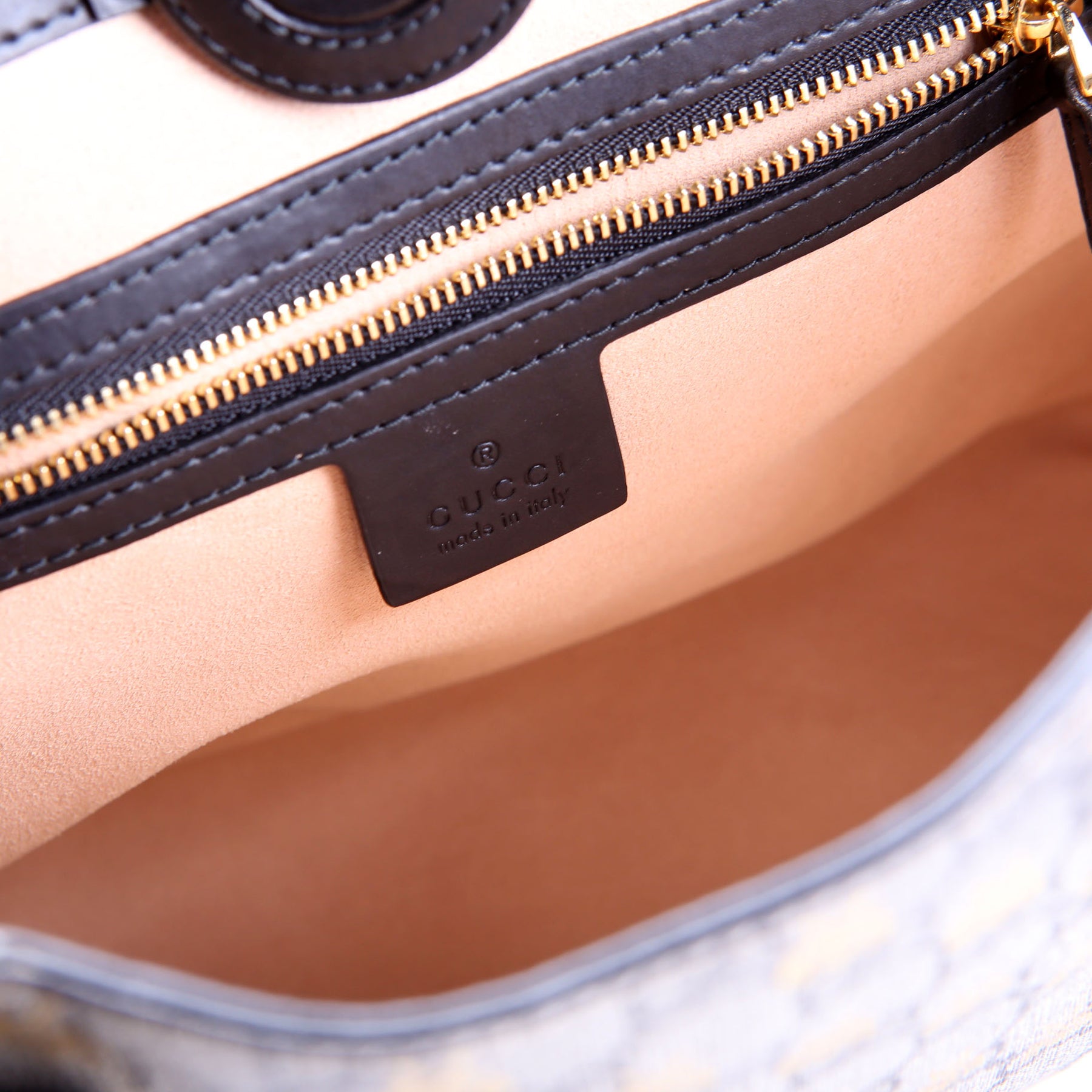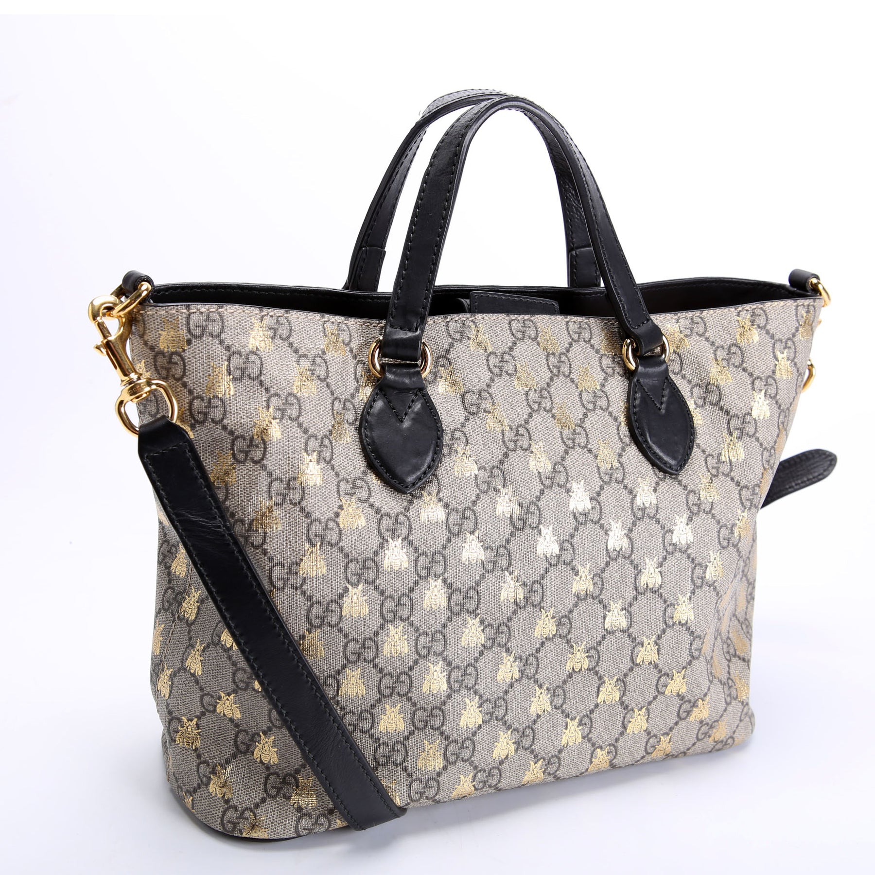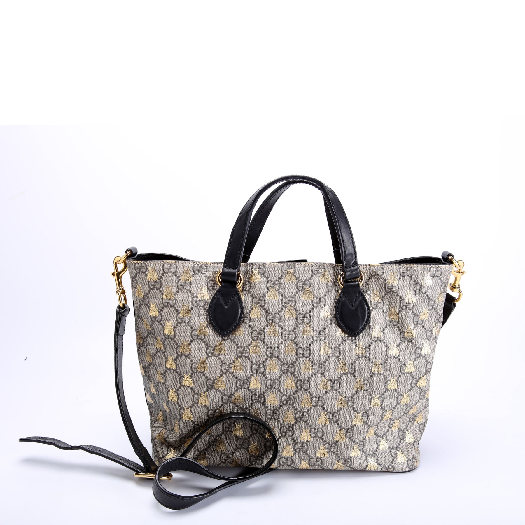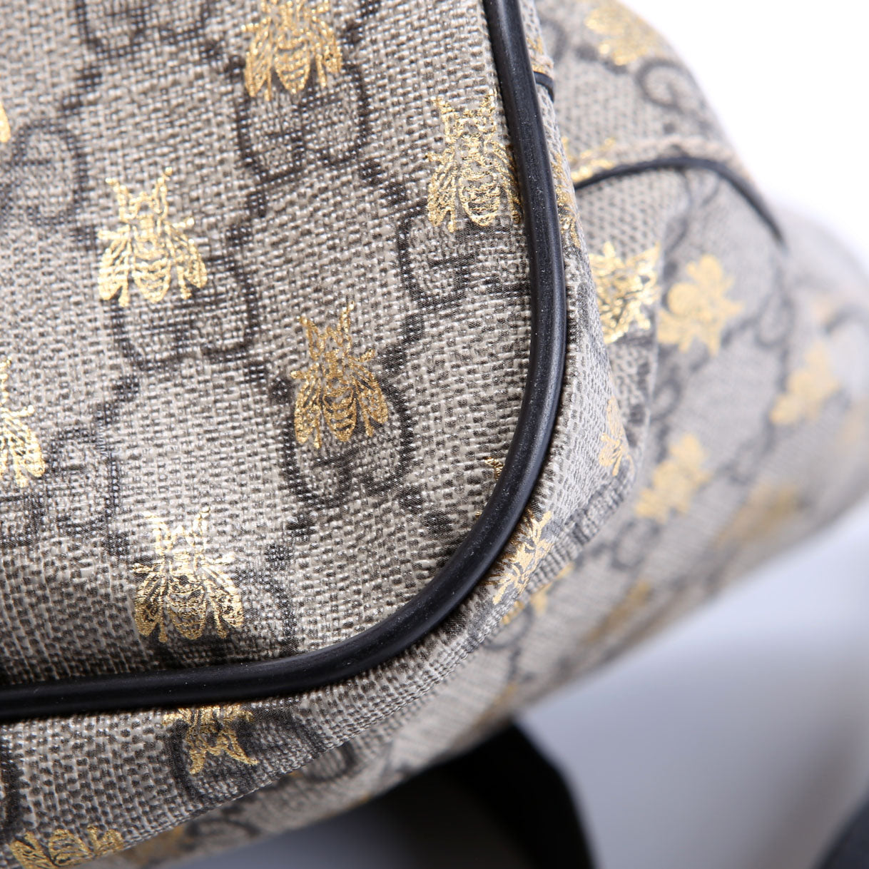 This pre-owned Gucci Bee Small Tote is guaranteed 100% authentic. The exterior is in the classic Gucci Coated Canvas Supreme.