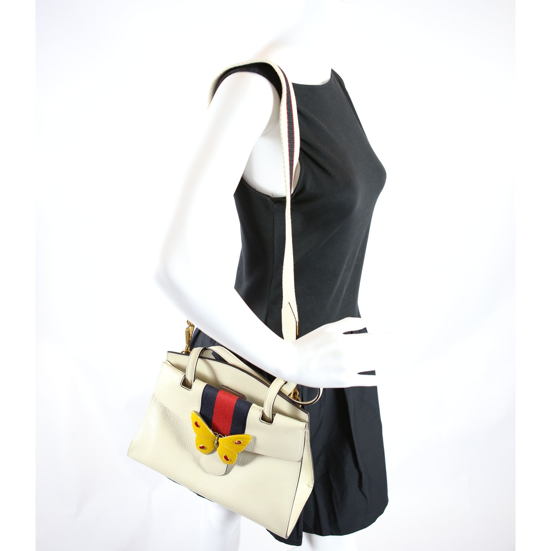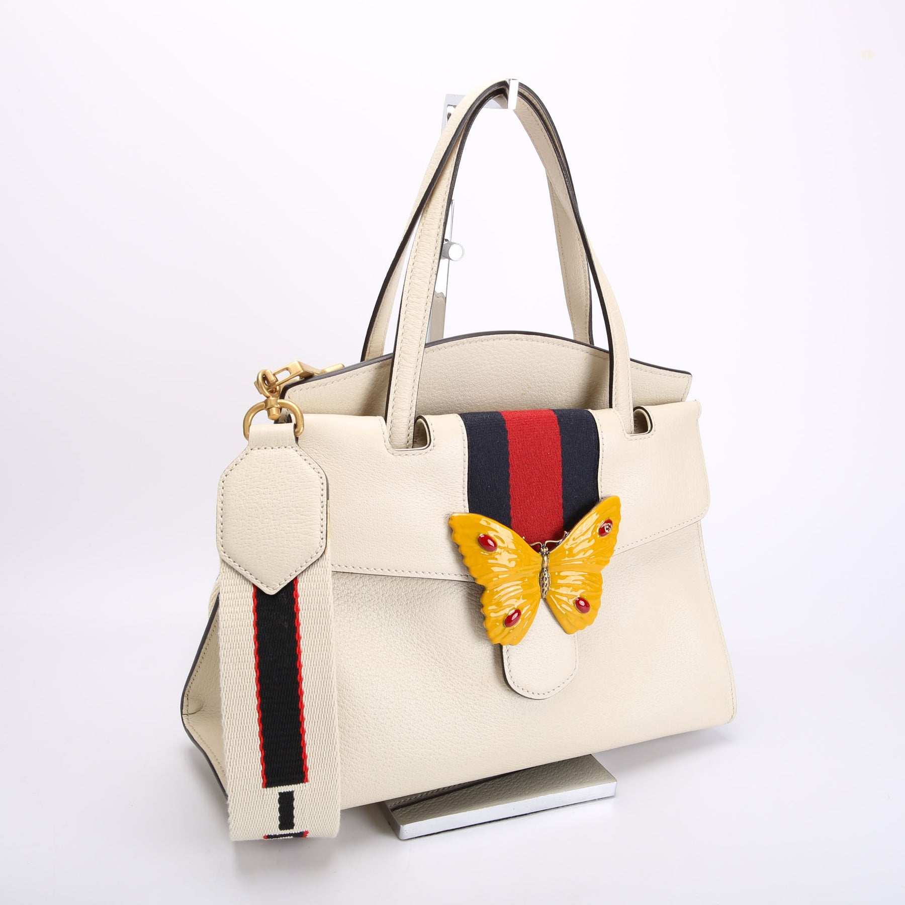 This pre-owned Gucci Totem Web Butterfly Top Handle Medium is guaranteed 100% authentic.