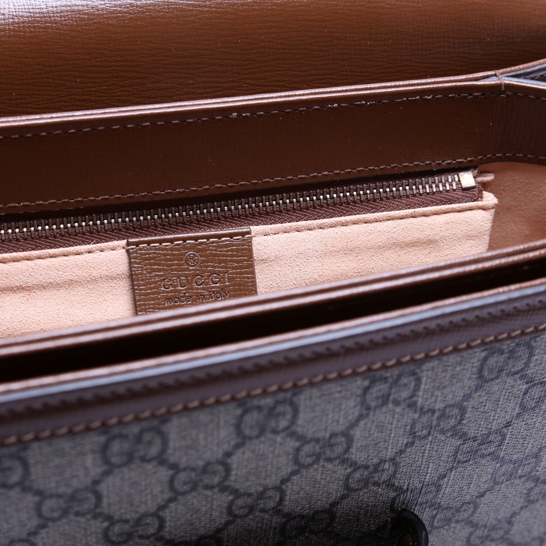Interior: The interior has light signs of wear. The interior features three sections, one open pocket, and one zip closure pocket.