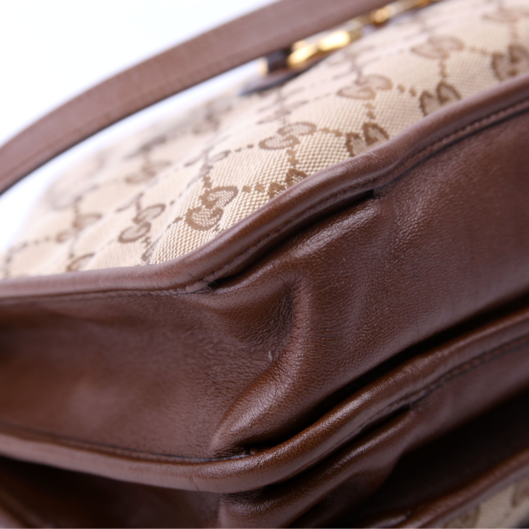 This pre-owned Gucci 1955 Horsebit Large Tote is guaranteed 100% authentic. The exterior is in the classic Gucci GG canvas.