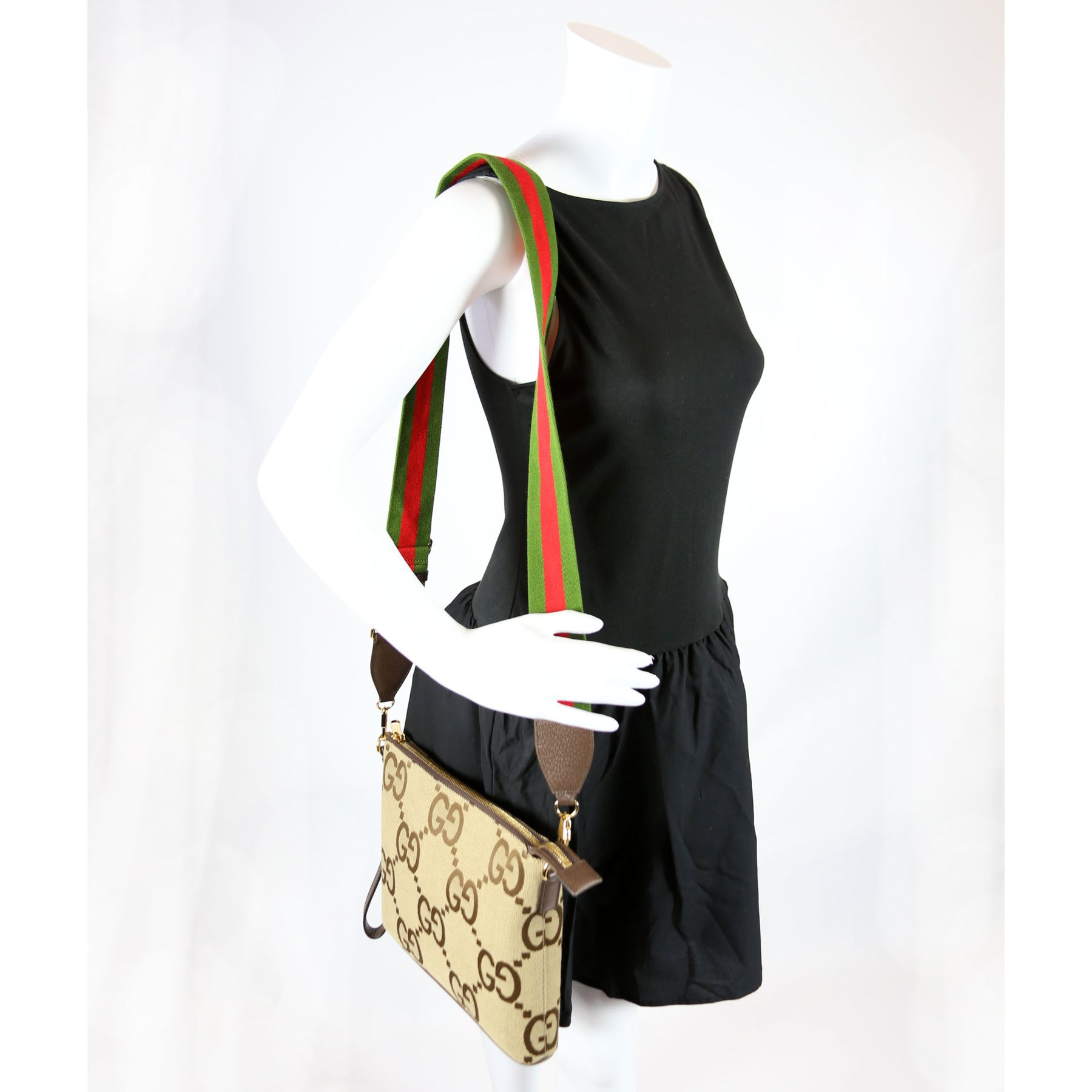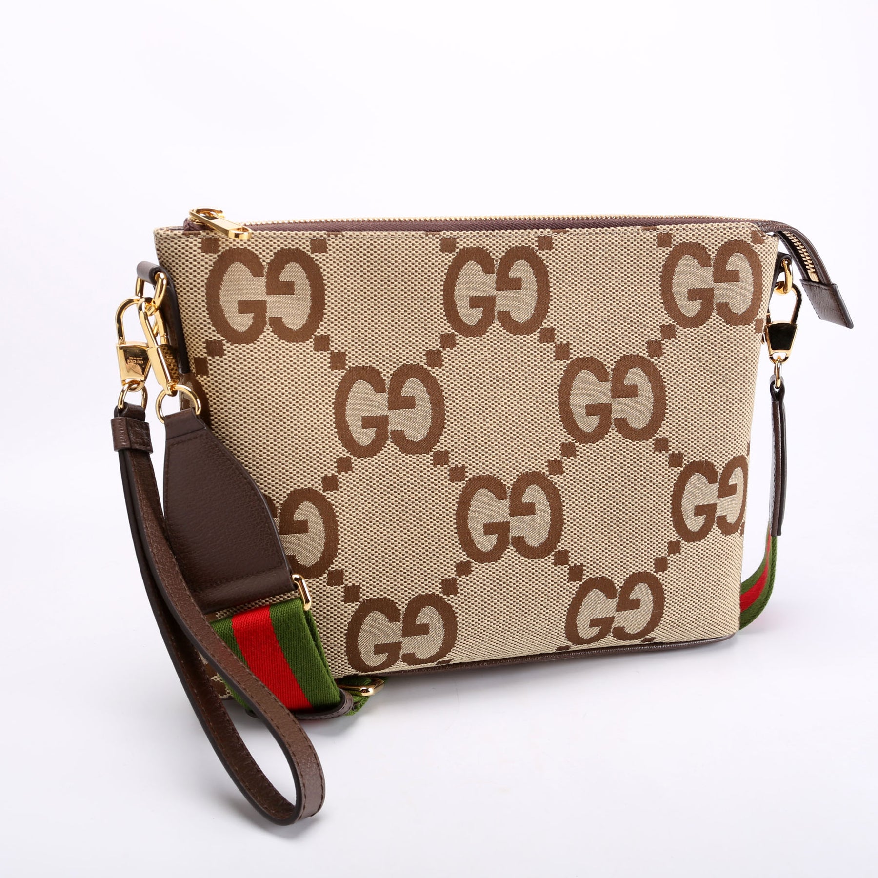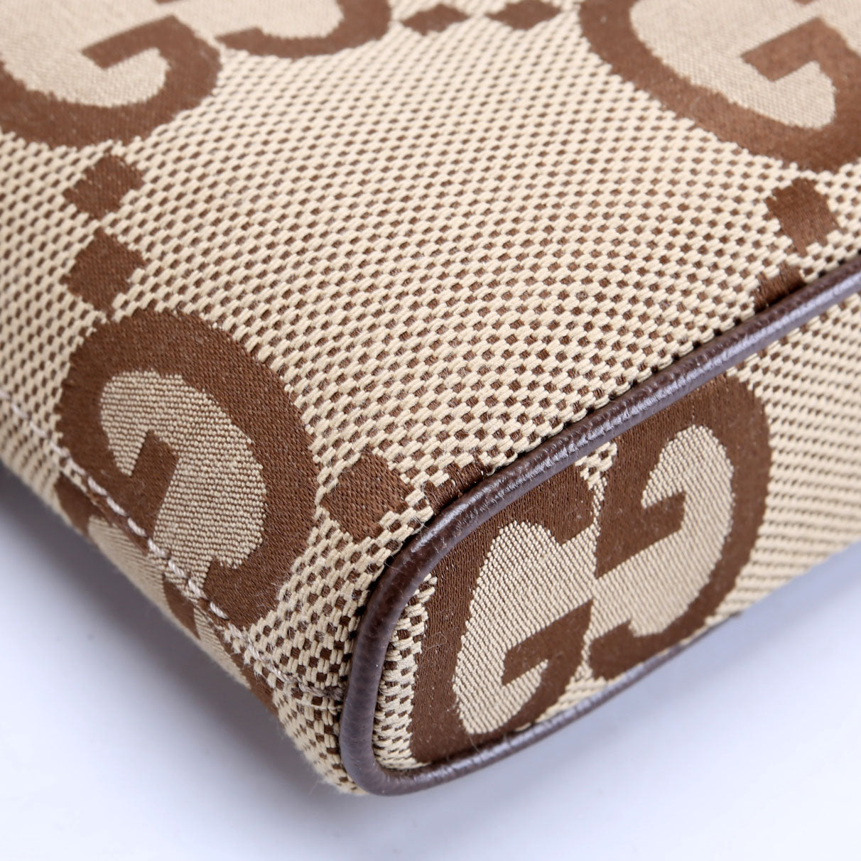This pre-owned Gucci Jumbo GG Messenger is guaranteed 100% authentic. The exterior is in the classic Gucci Jumbo GG canvas.