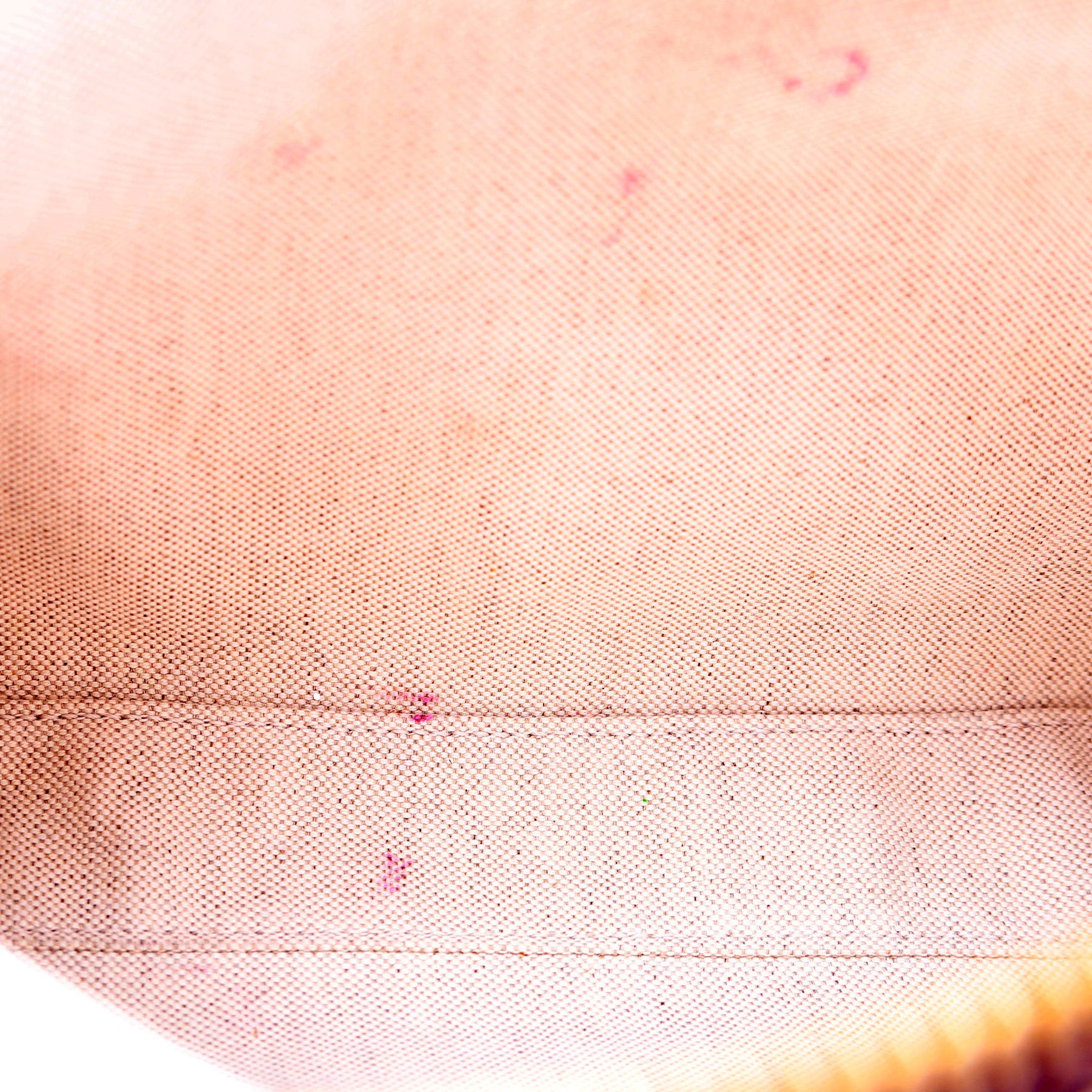 Interior: The interior has staining and marks throughout. The interior features one zip closure pocket.