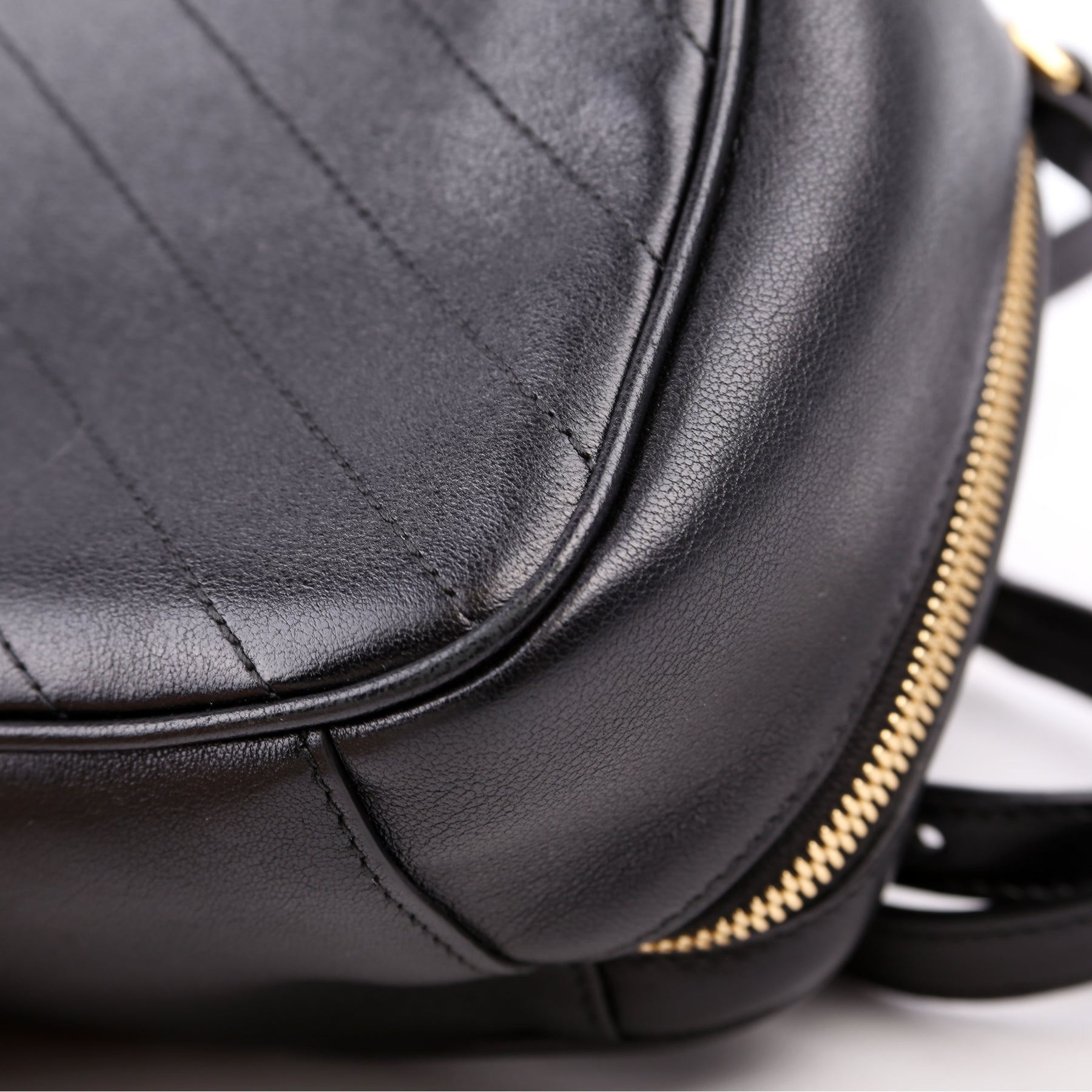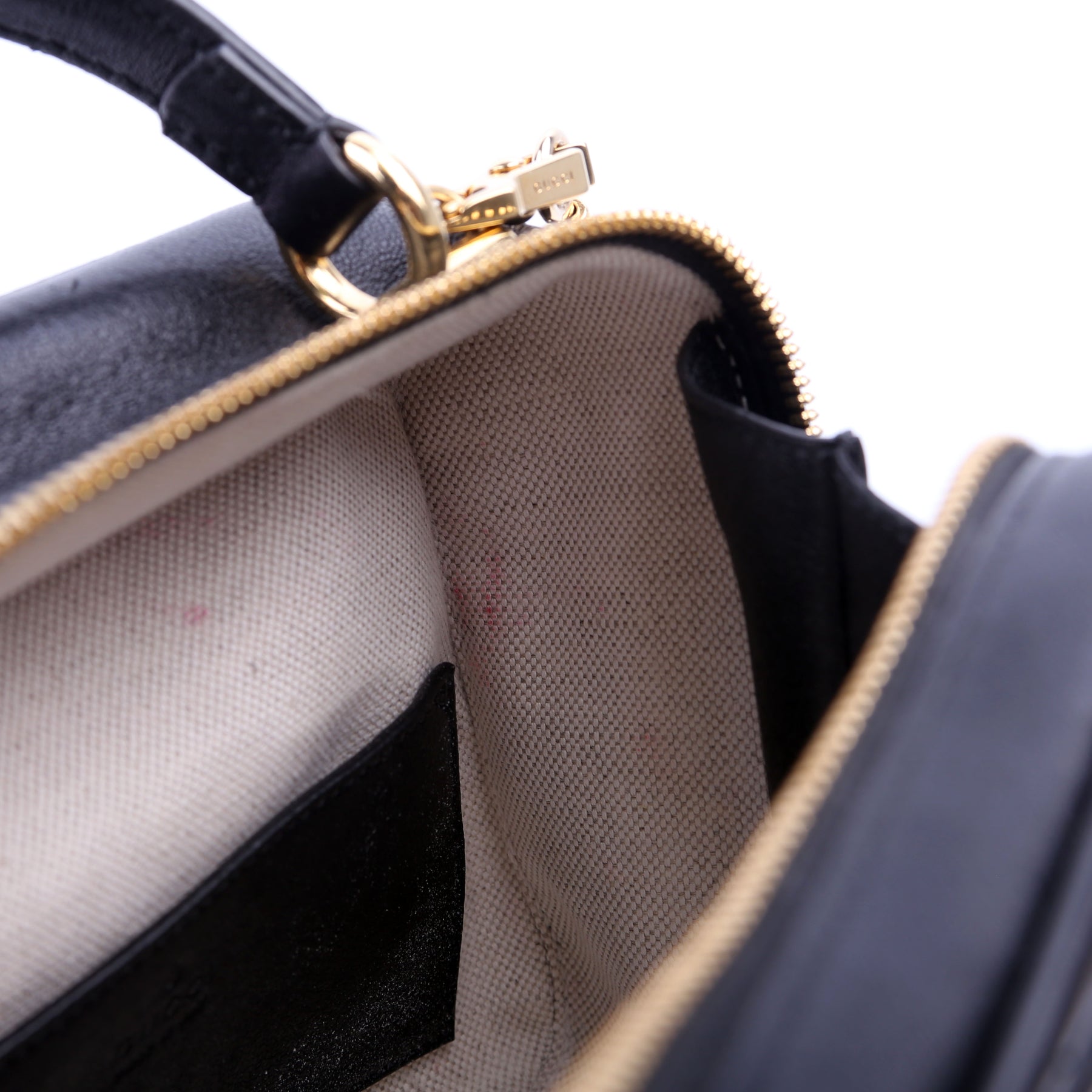 Exterior: The exterior leather has light scuffs. The top of the bag is dipping due to storage and wear.