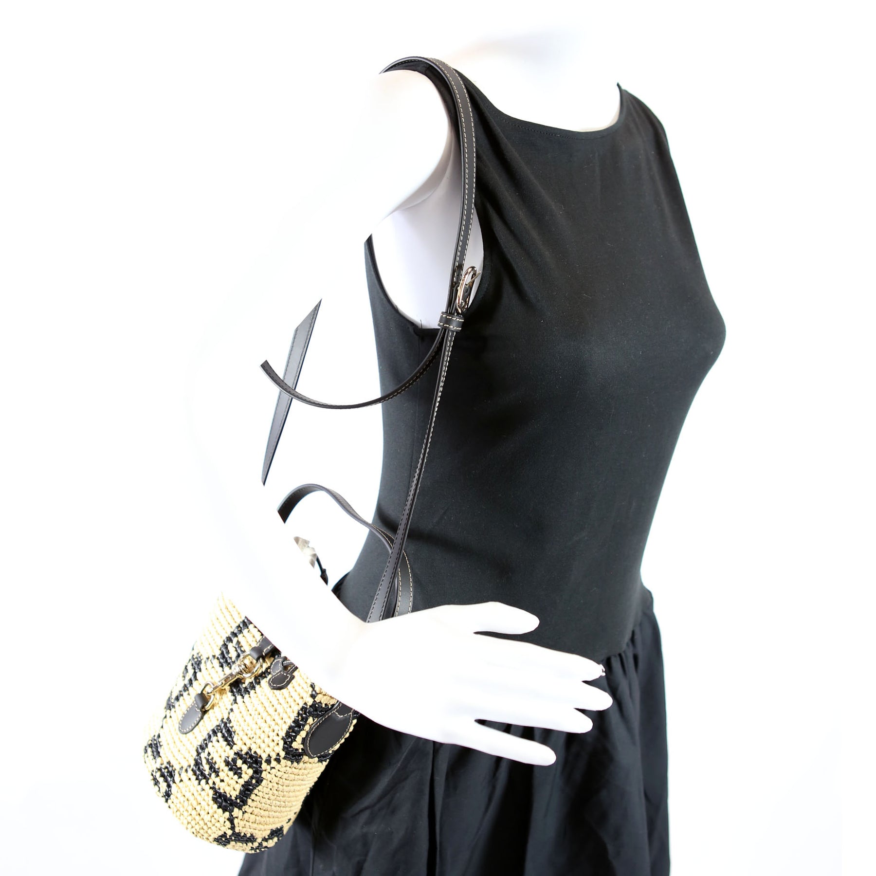 816284 GG Woven Raffia Mini Bucket Bag Tan/Black
