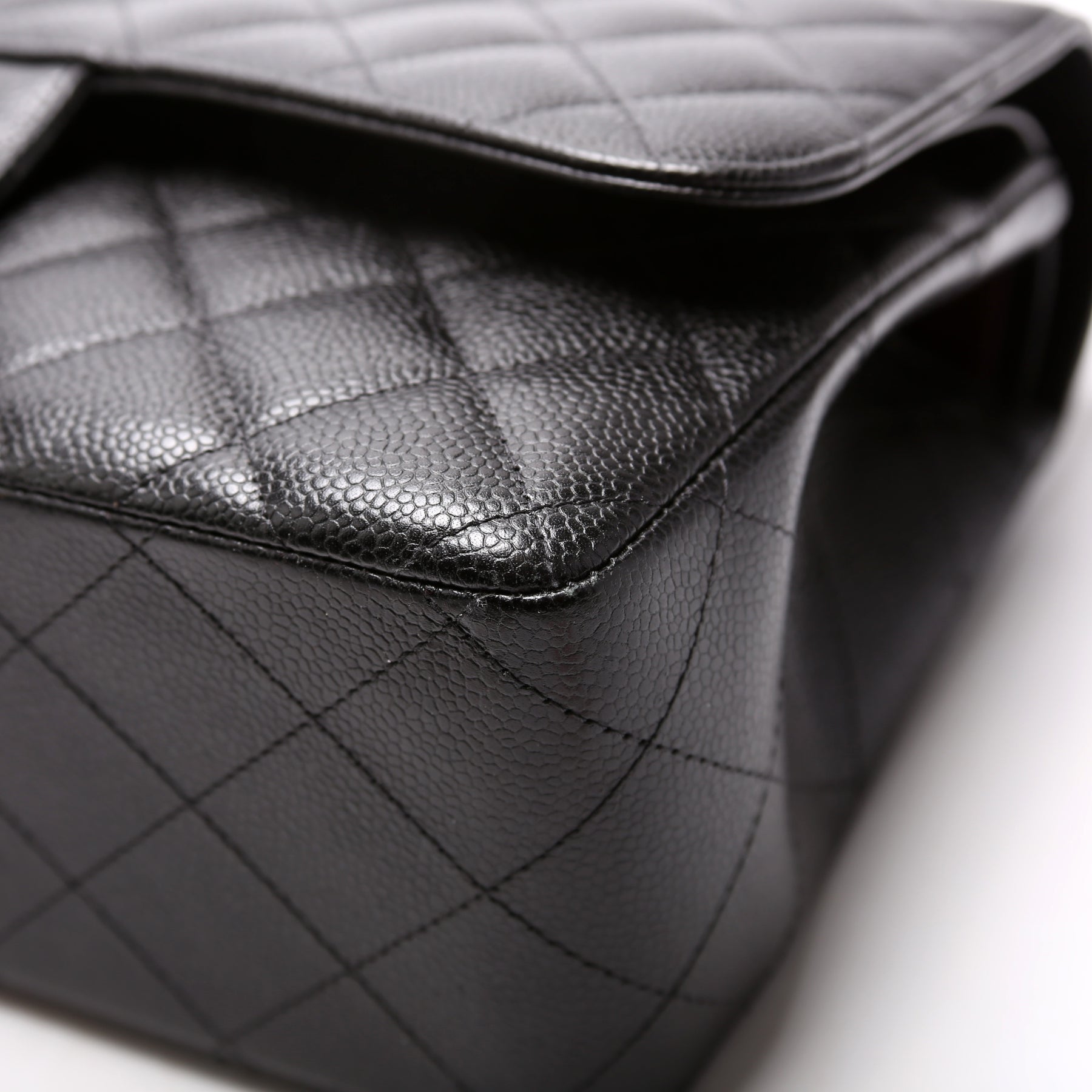 This pre-owned Chanel Classic Flap Jumbo is guaranteed 100% authentic. The exterior is in the classic Chanel Caviar leather.