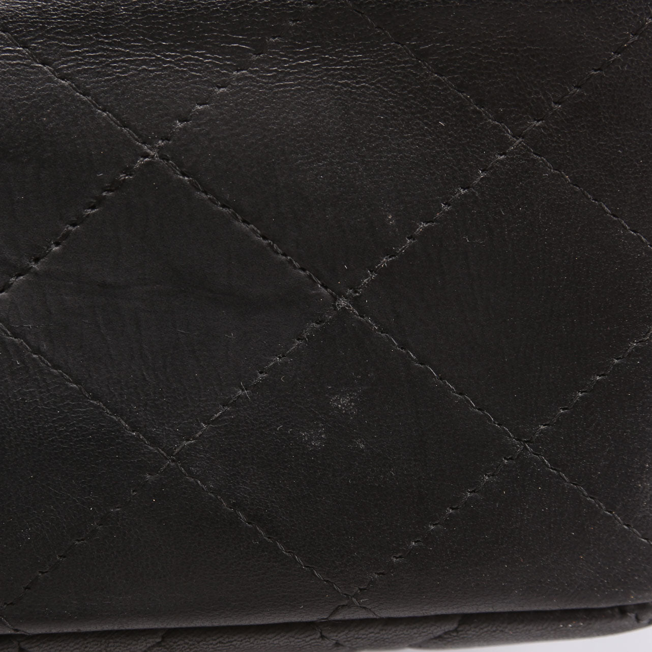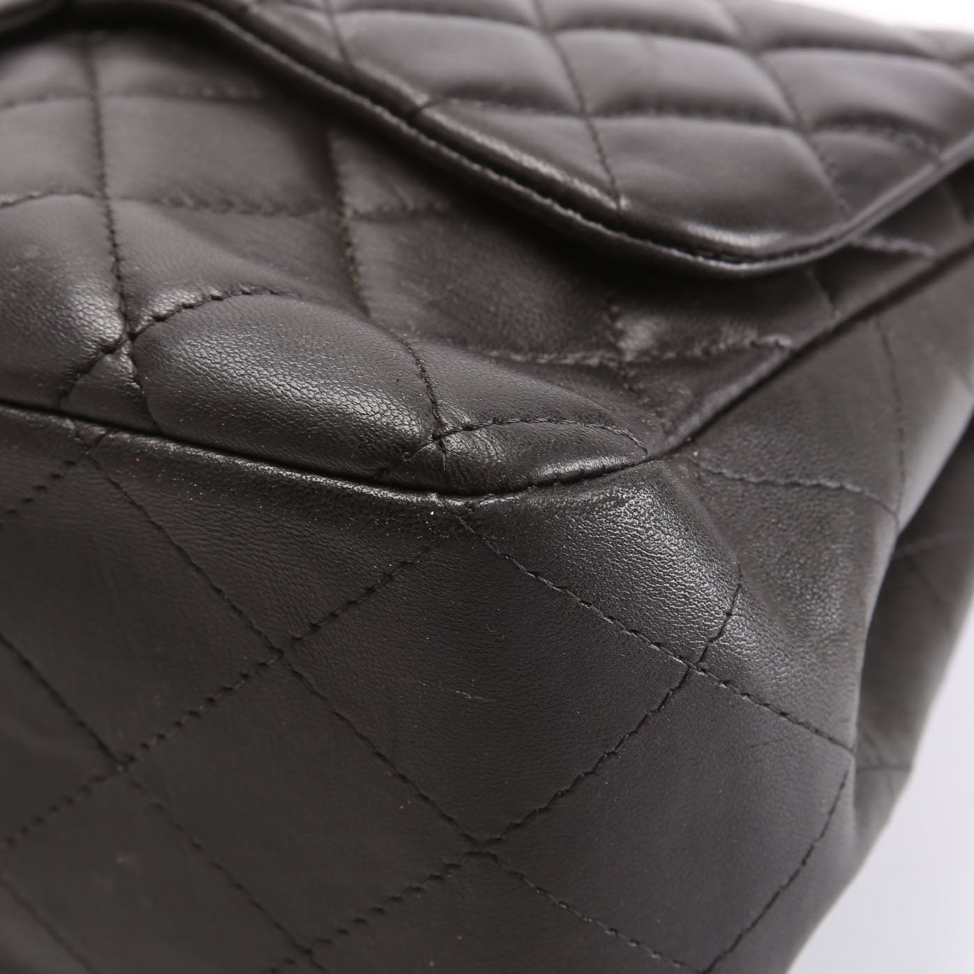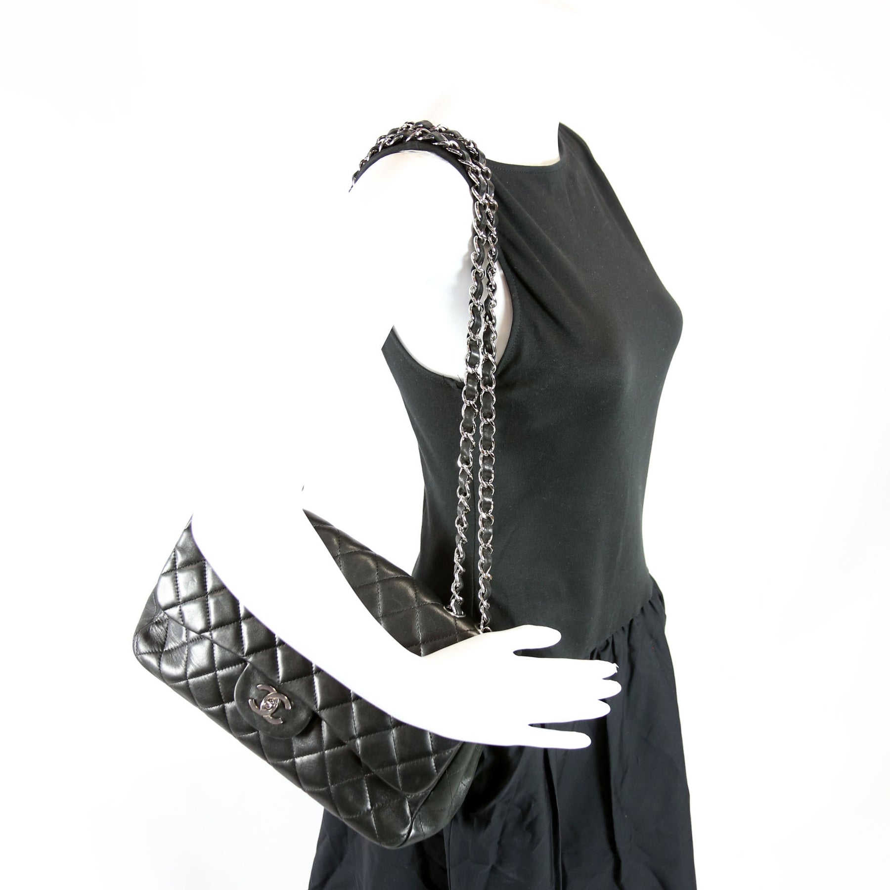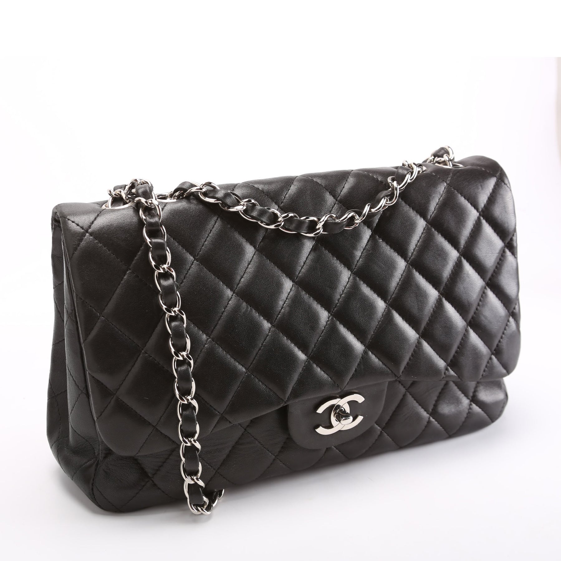 This pre-owned Chanel Classic Flap Jumbo 10-13 is guaranteed 100% authentic. The exterior is in the classic Chanel lambskin leather.