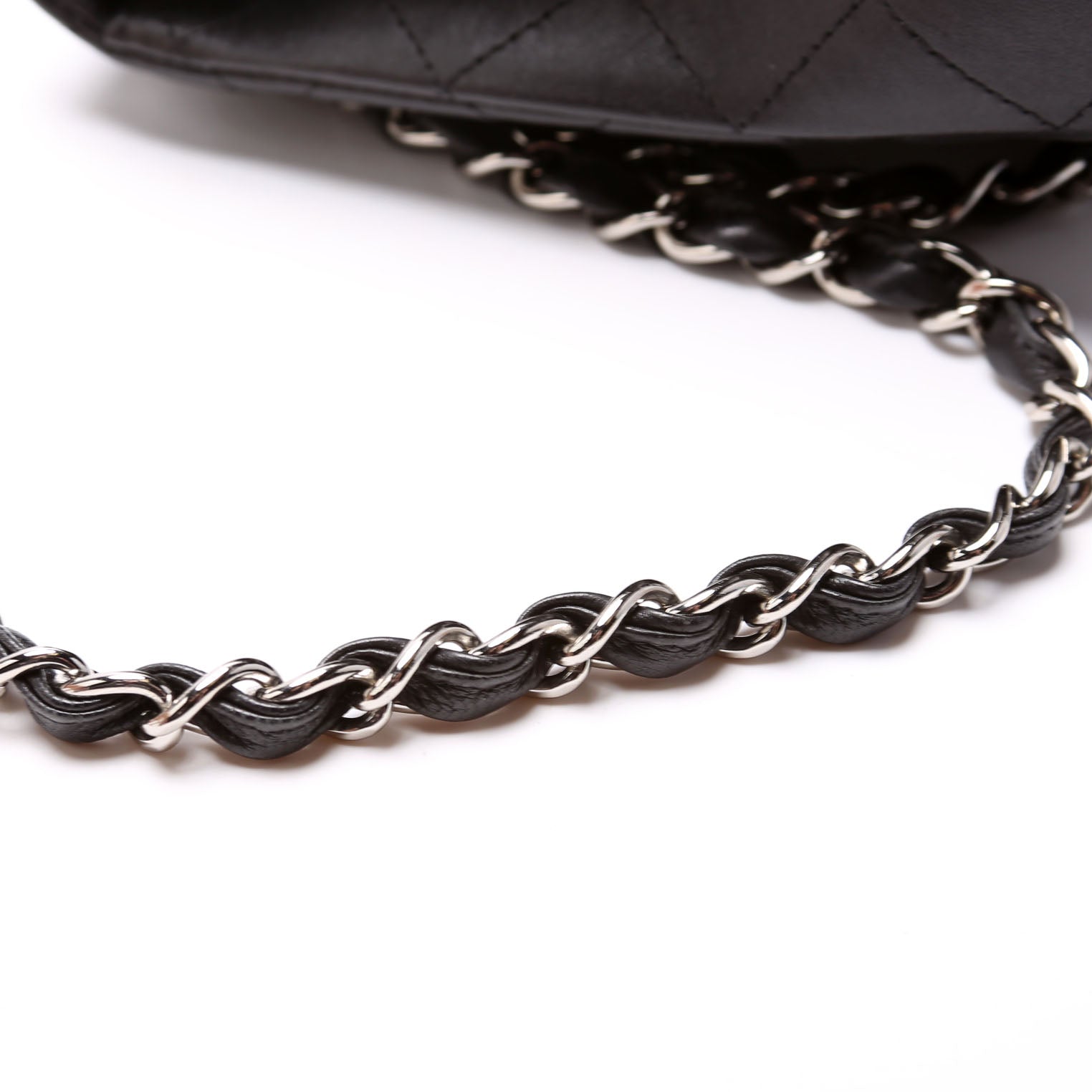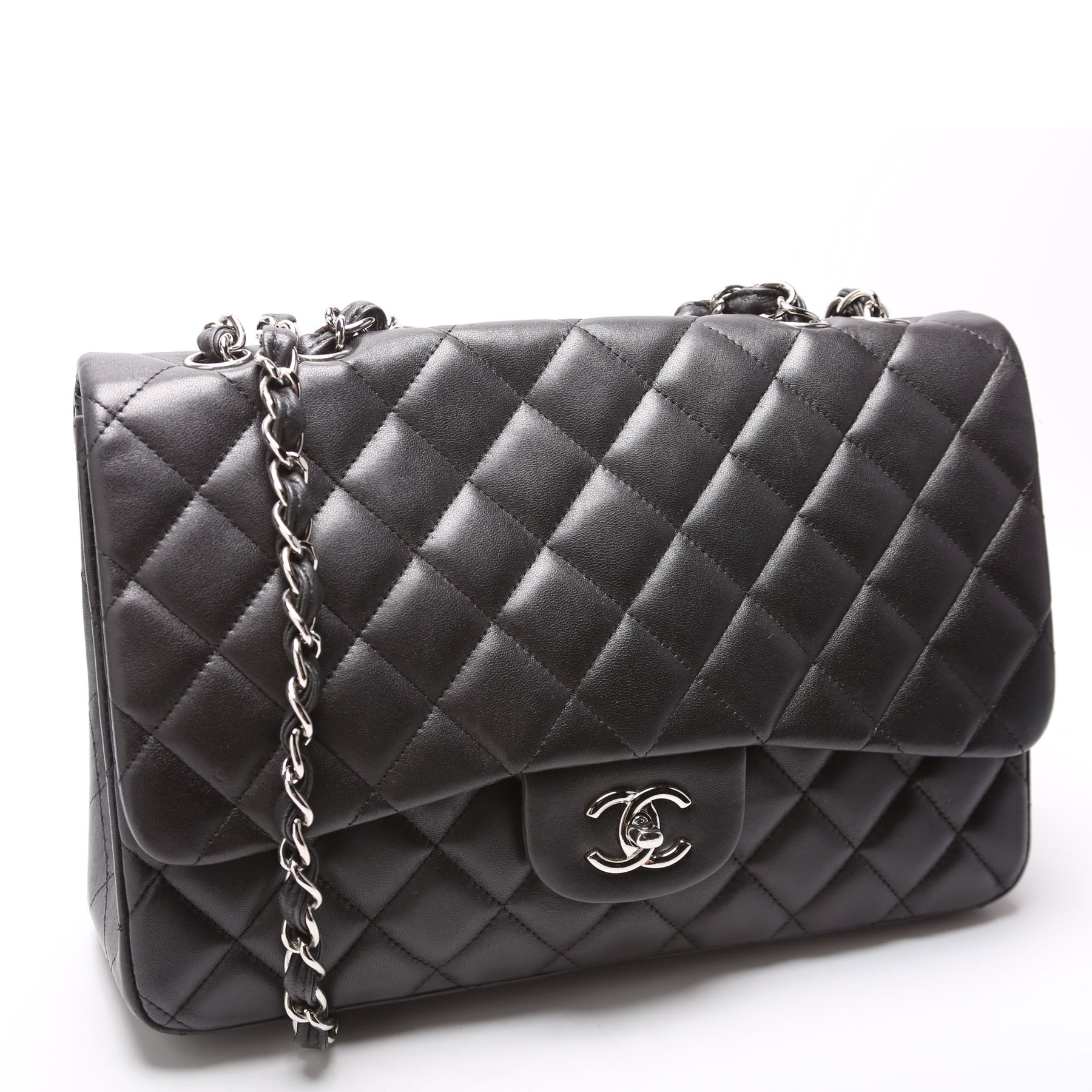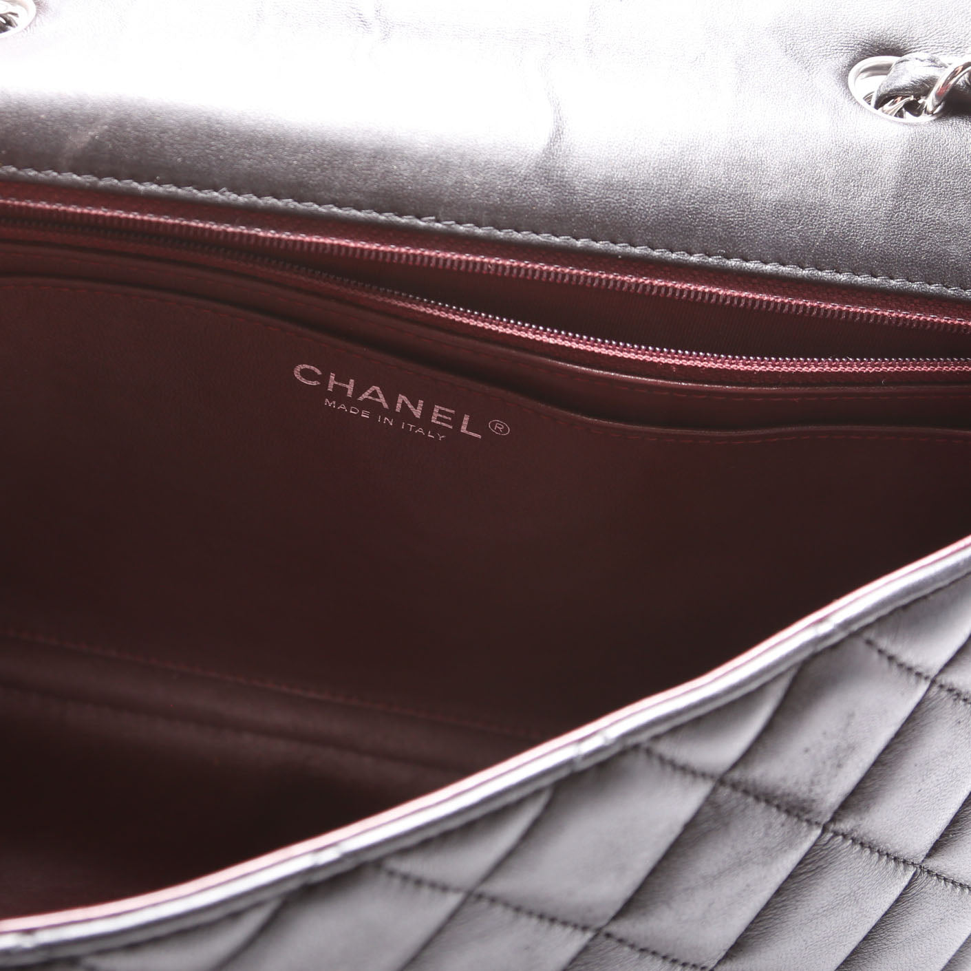 This pre-owned Chanel Classic Flap Jumbo is guaranteed 100% authentic. The exterior is in the classic Chanel Lambskin Leather.