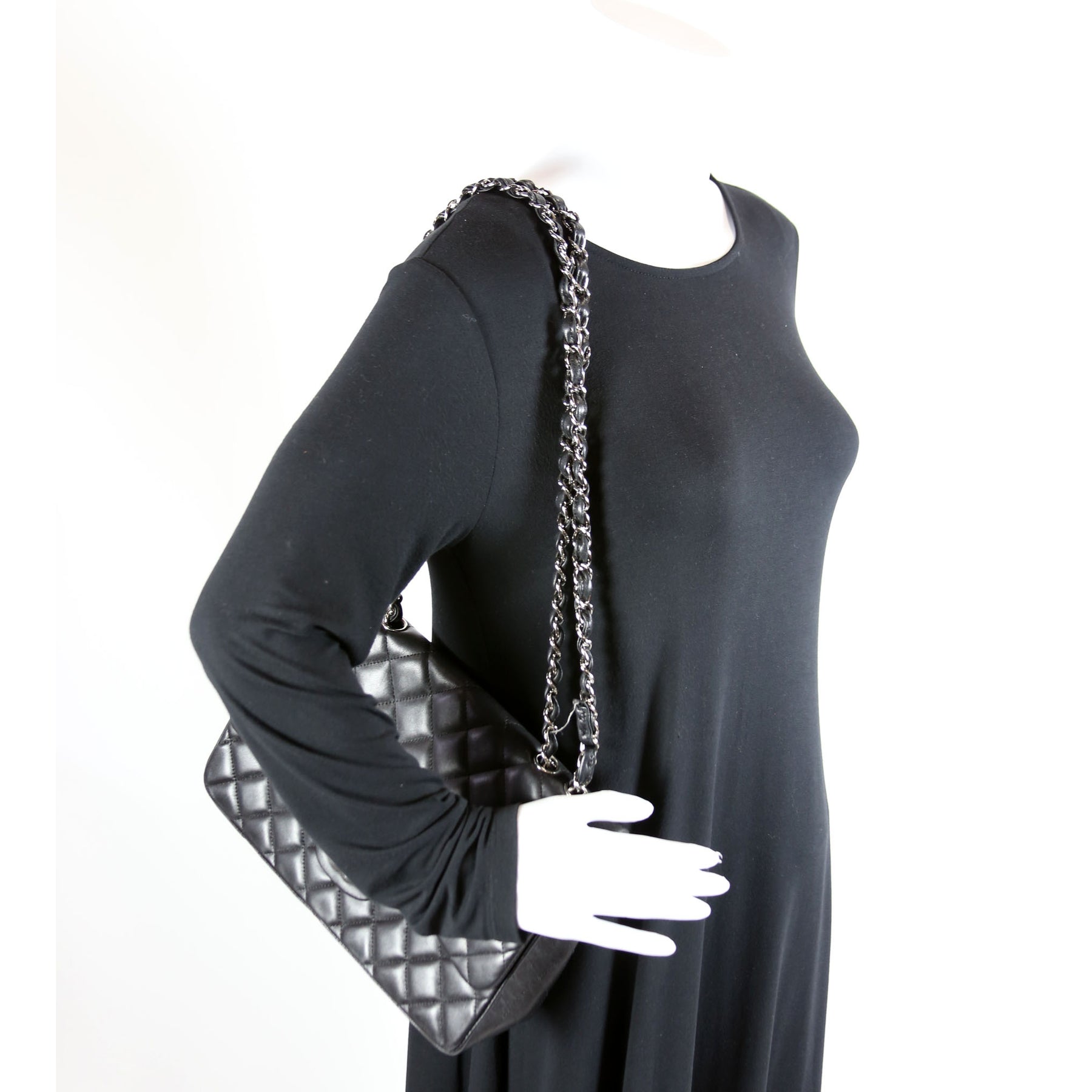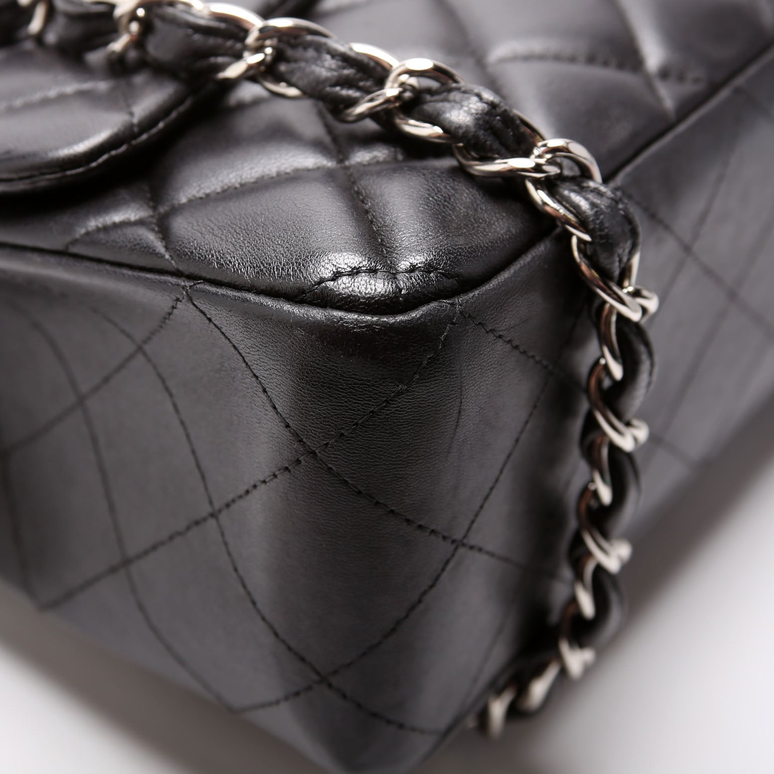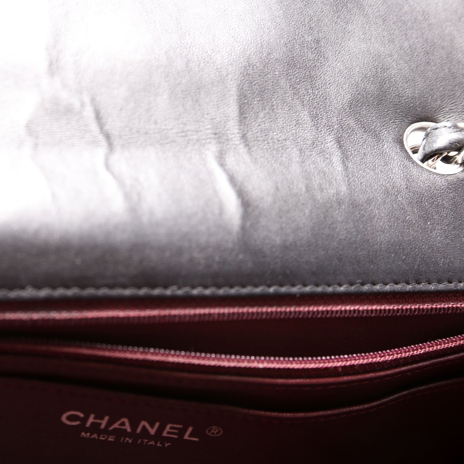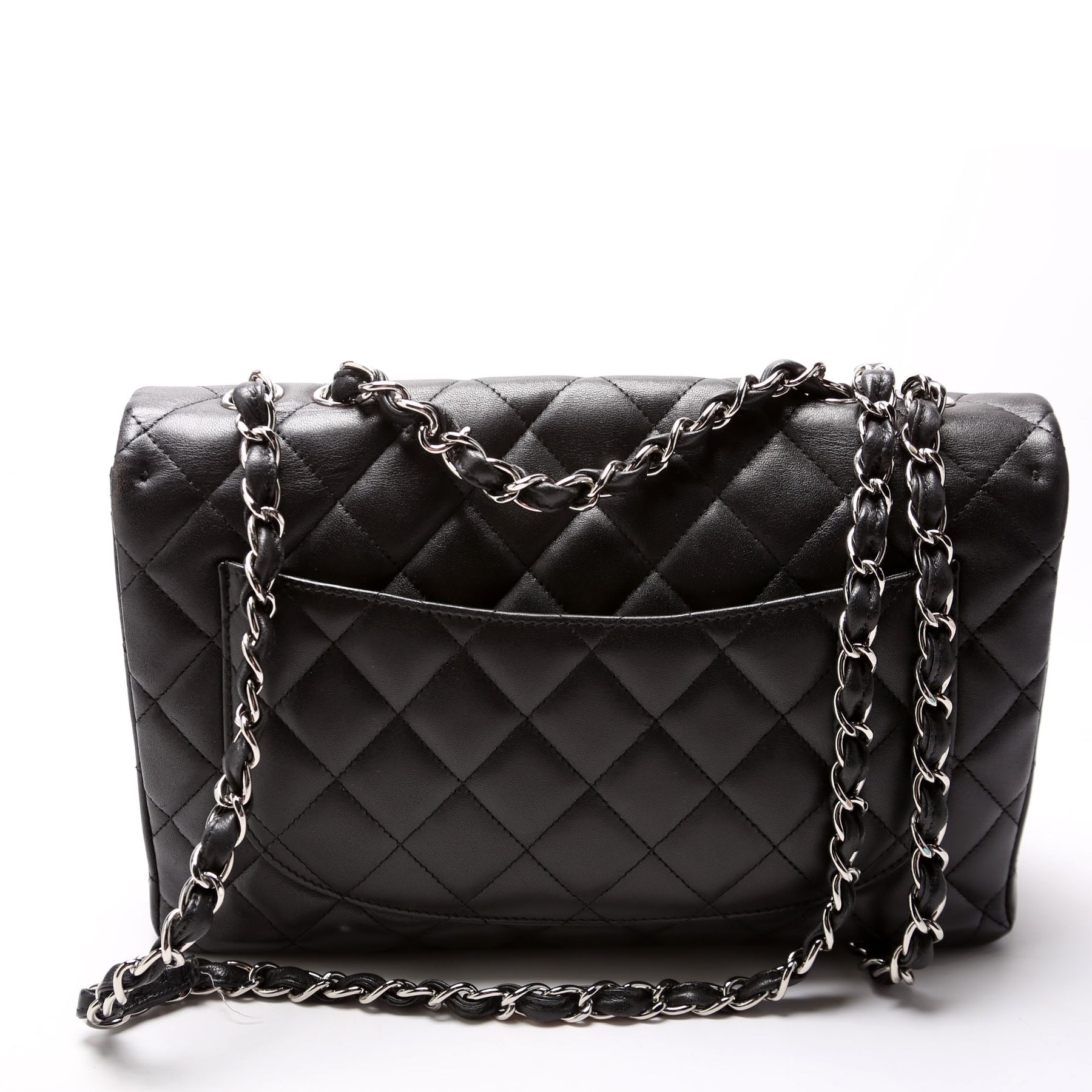 This pre-owned Chanel Classic Flap Jumbo is guaranteed 100% authentic. The exterior is in the classic Chanel Lambskin Leather.