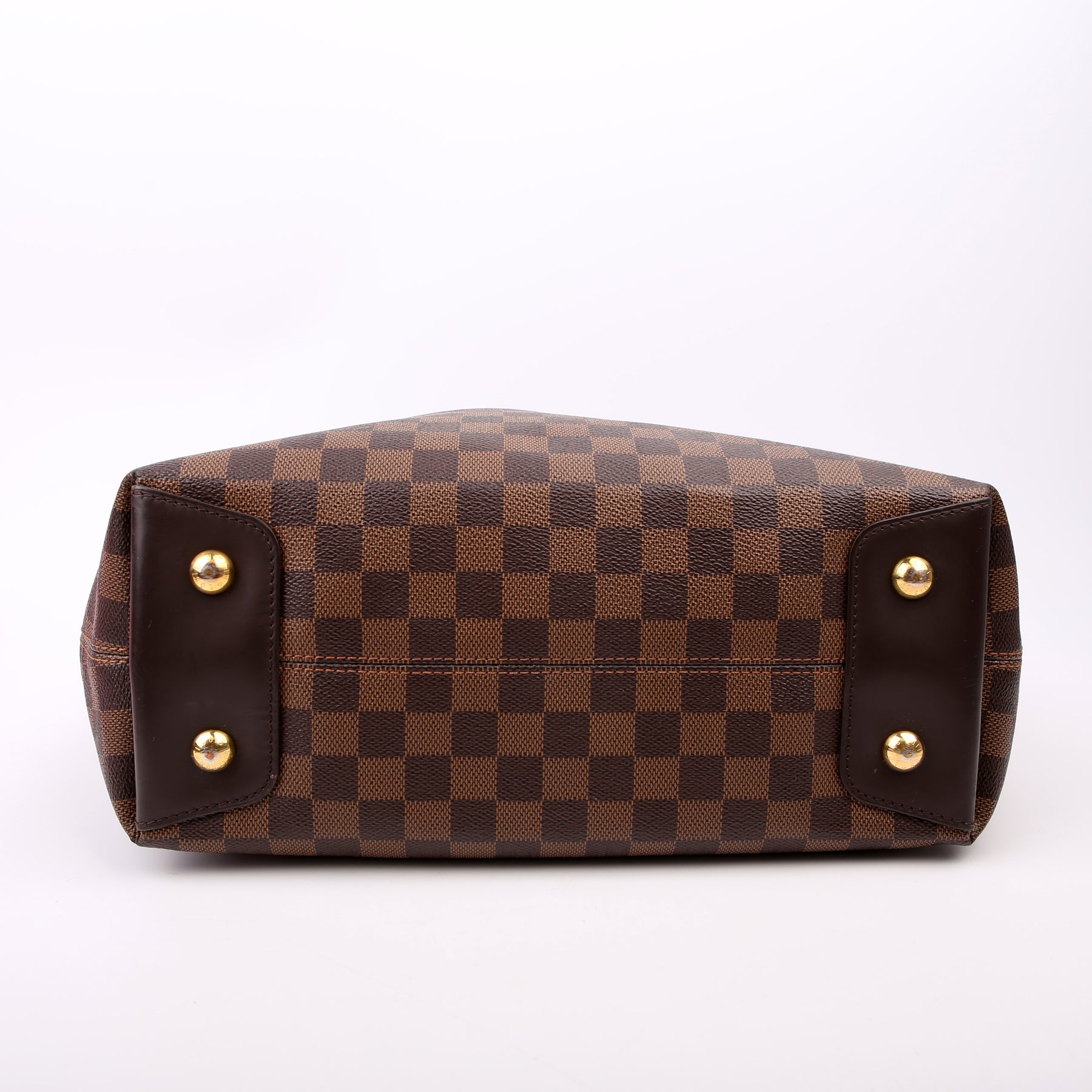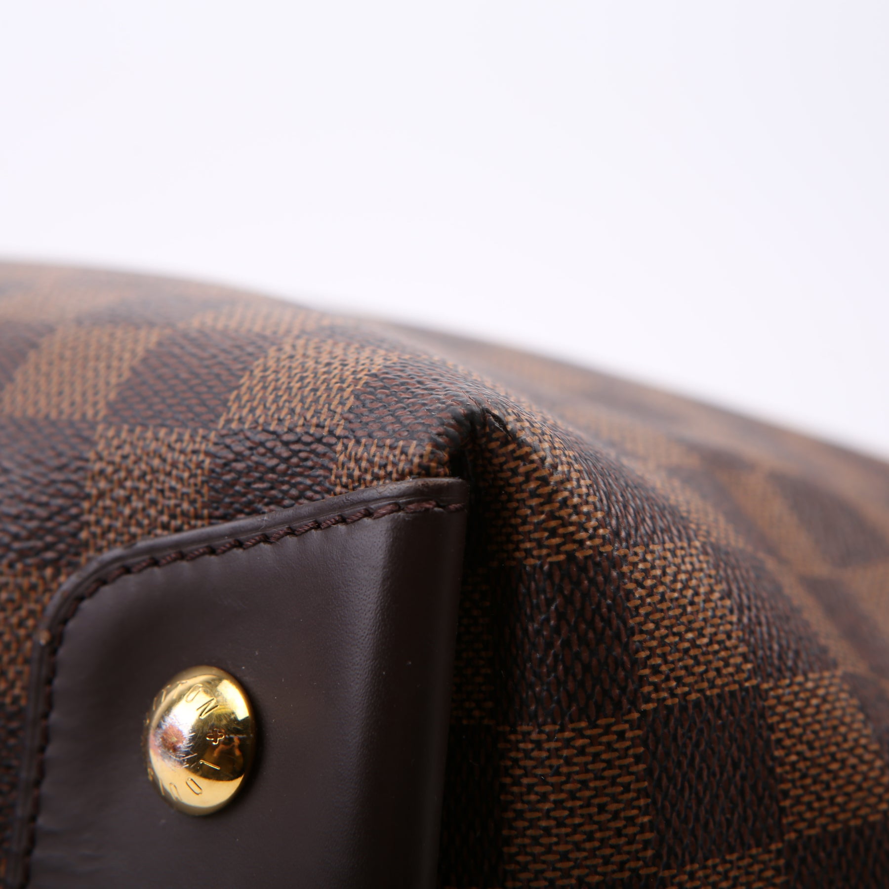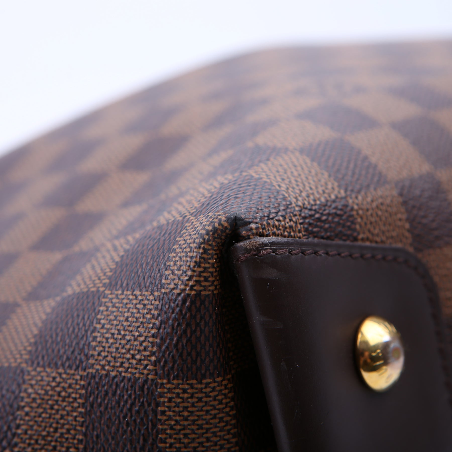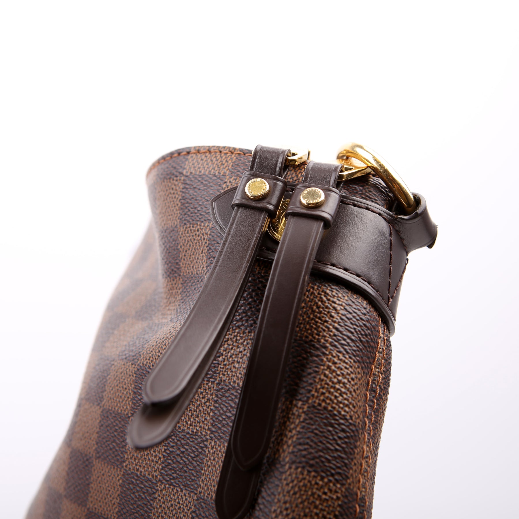 This pre-owned Louis Vuitton Duomo Hobo is guaranteed 100% authentic. The exterior is in the classic Louis Vuitton Damier Ebene coated canvas.