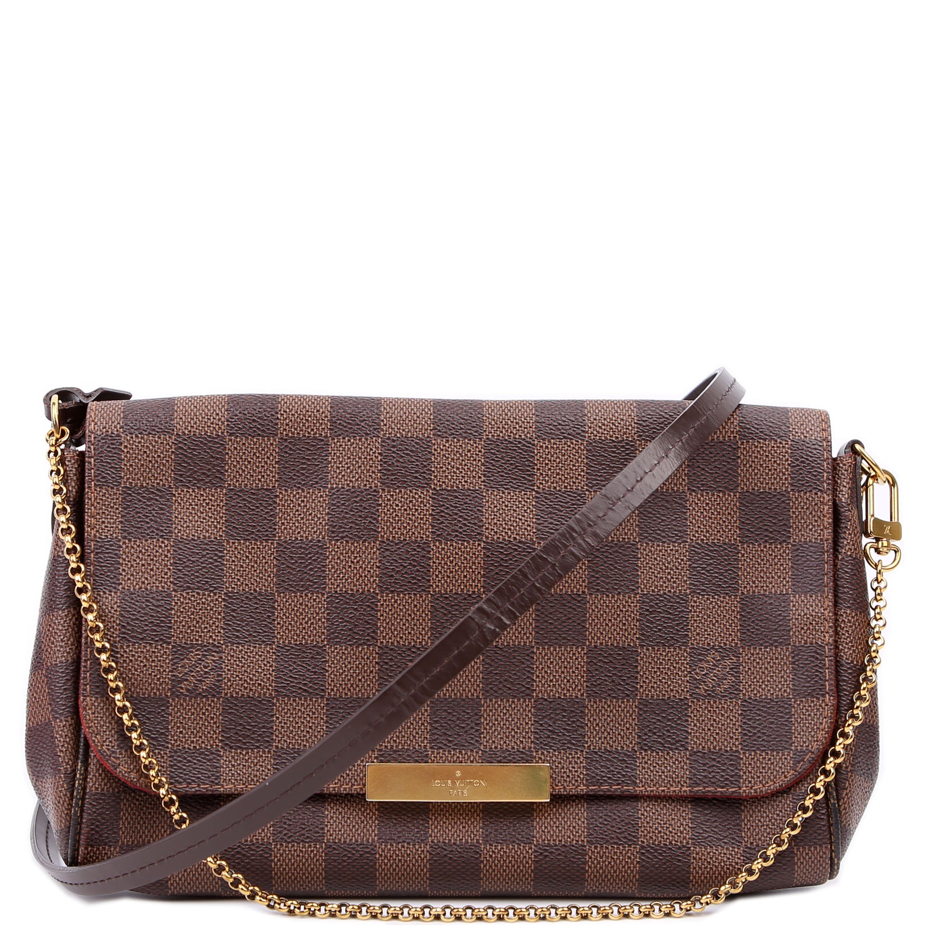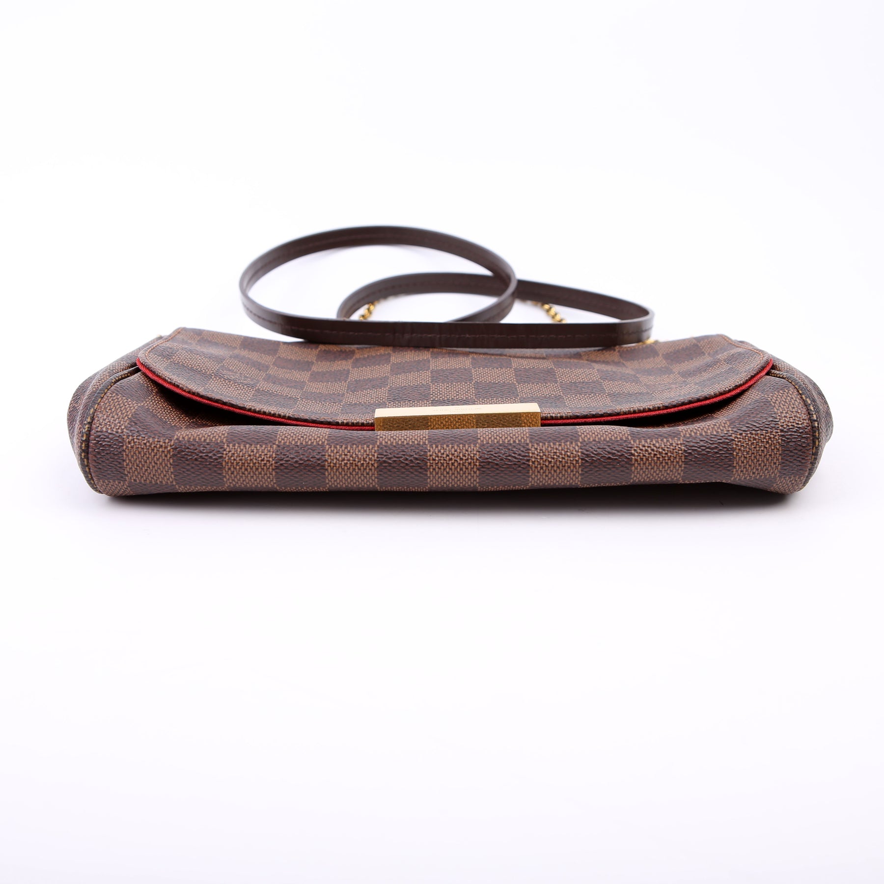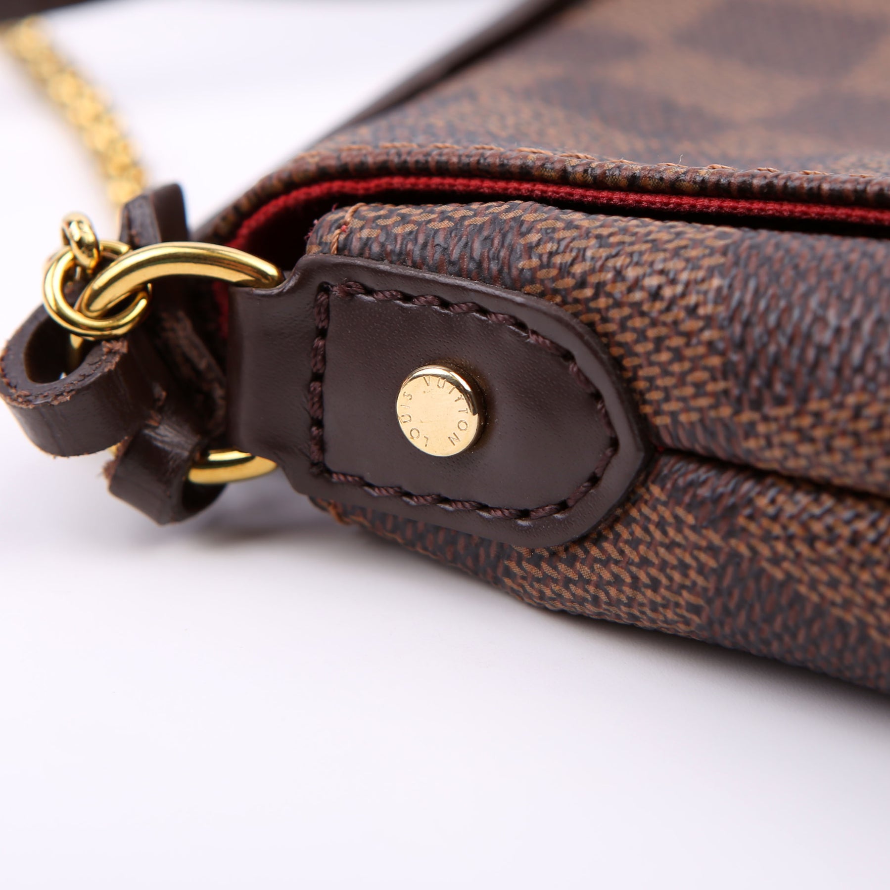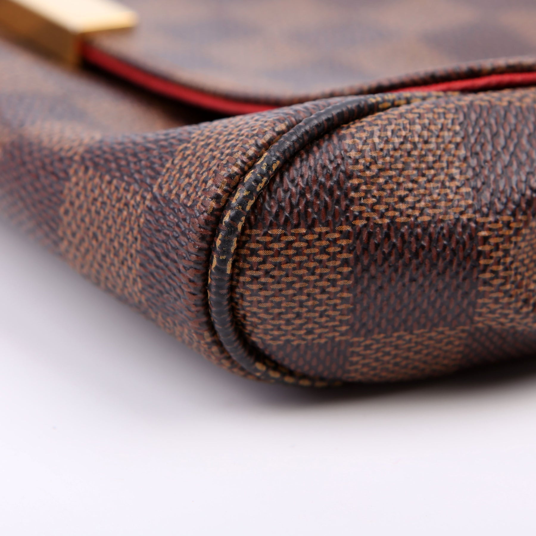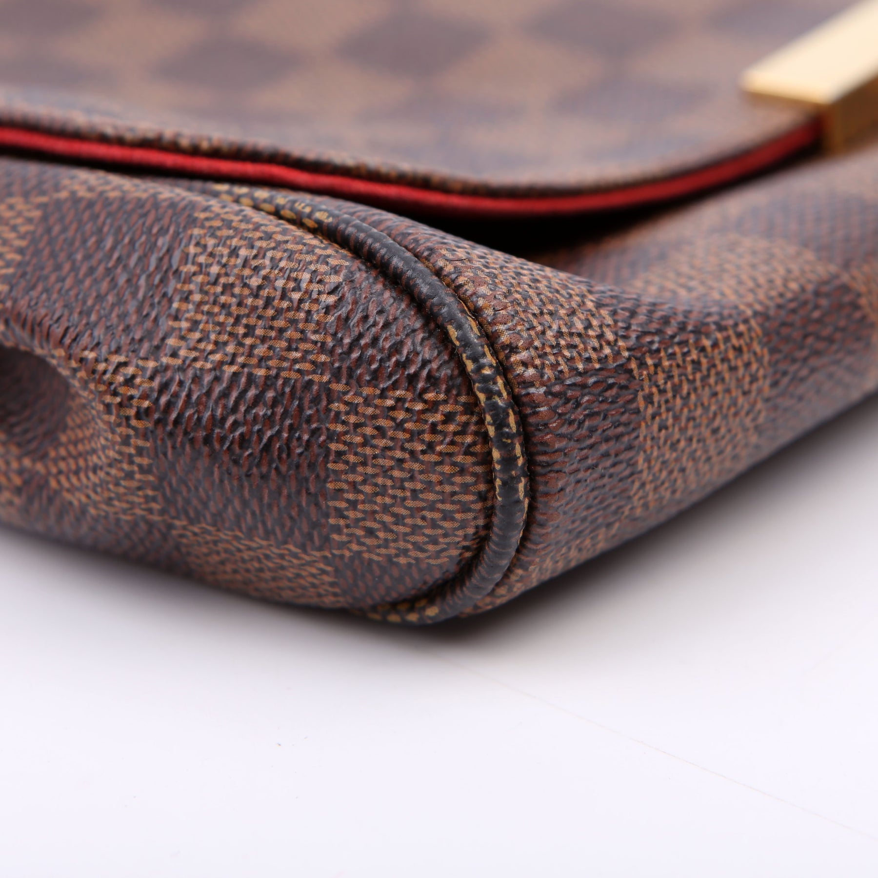 This pre-owned Louis Vuitton Favorite MM is guaranteed 100% authentic. The exterior is in the classic Louis Vuitton Damier Ebene coated canvas.