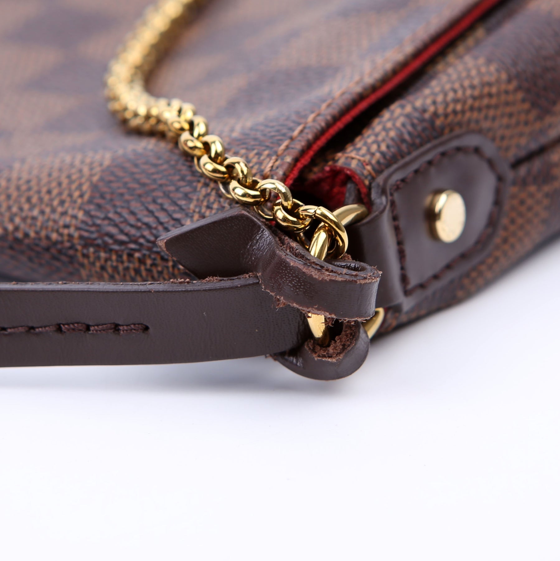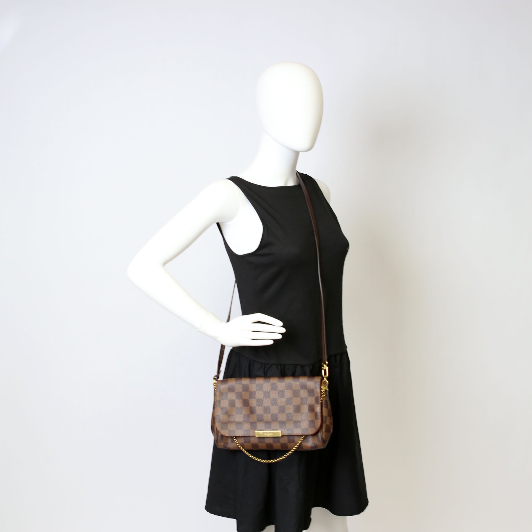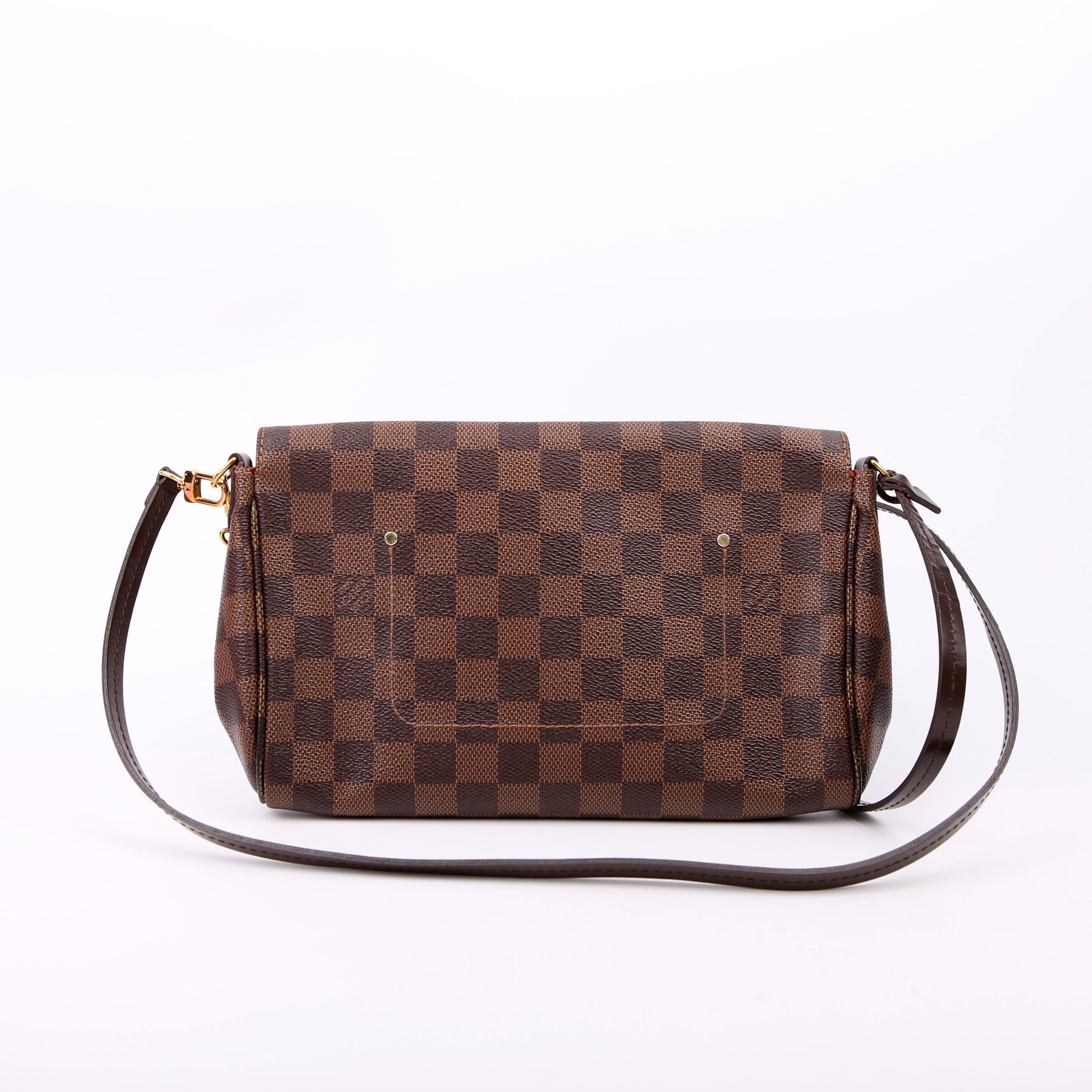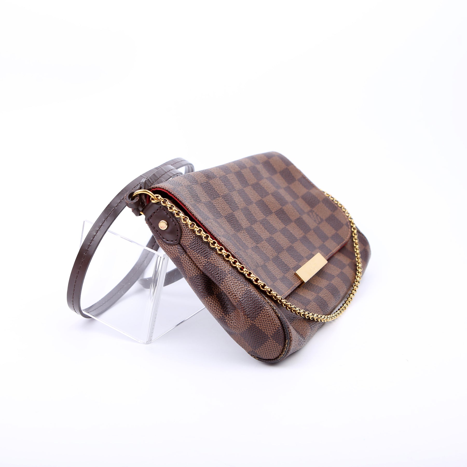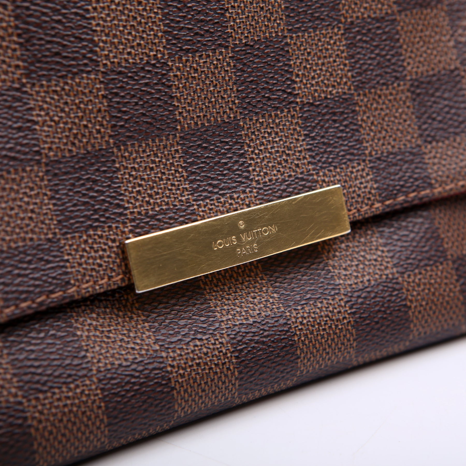 This pre-owned Louis Vuitton Favorite MM is guaranteed 100% authentic. The exterior is in the classic Louis Vuitton Damier Ebene coated canvas.