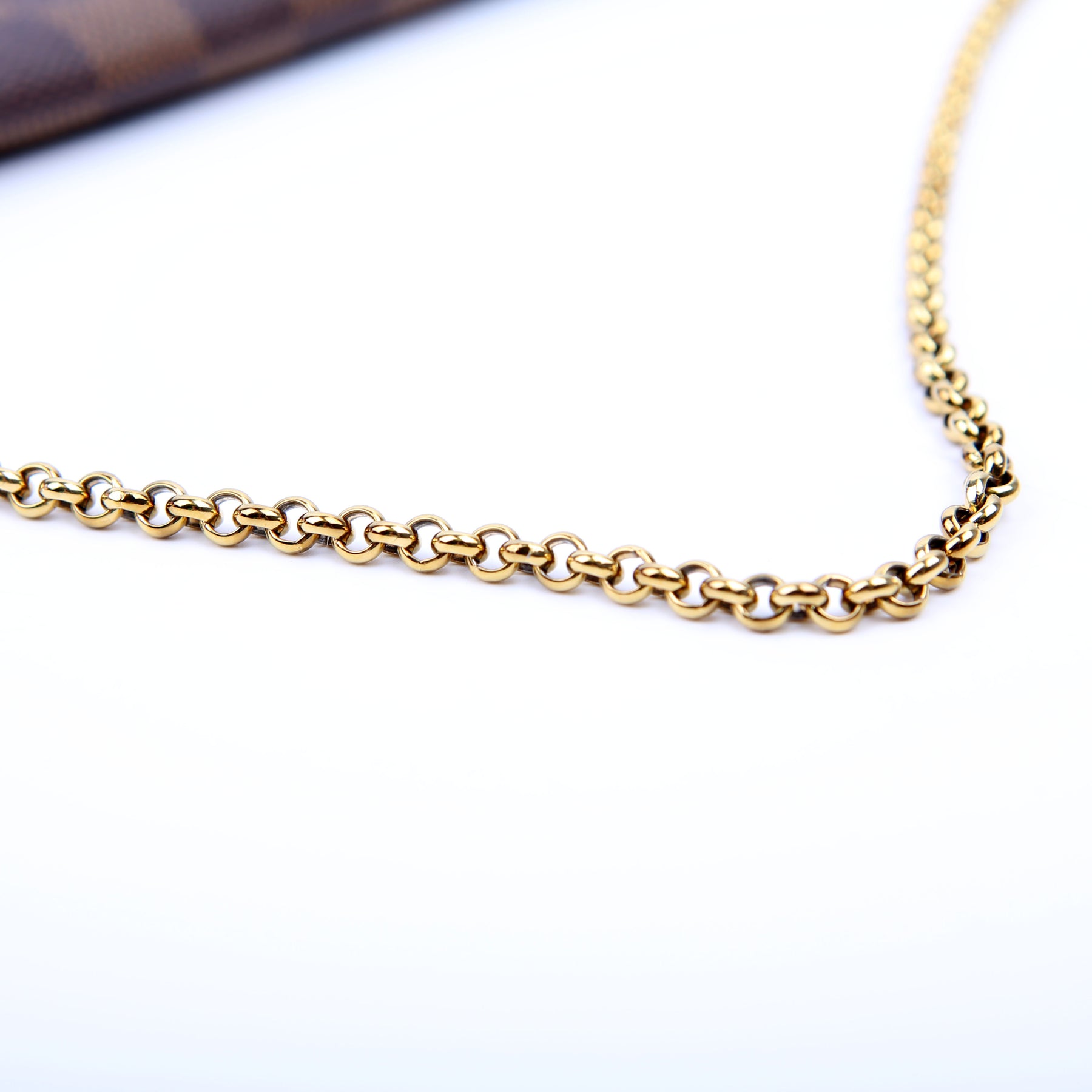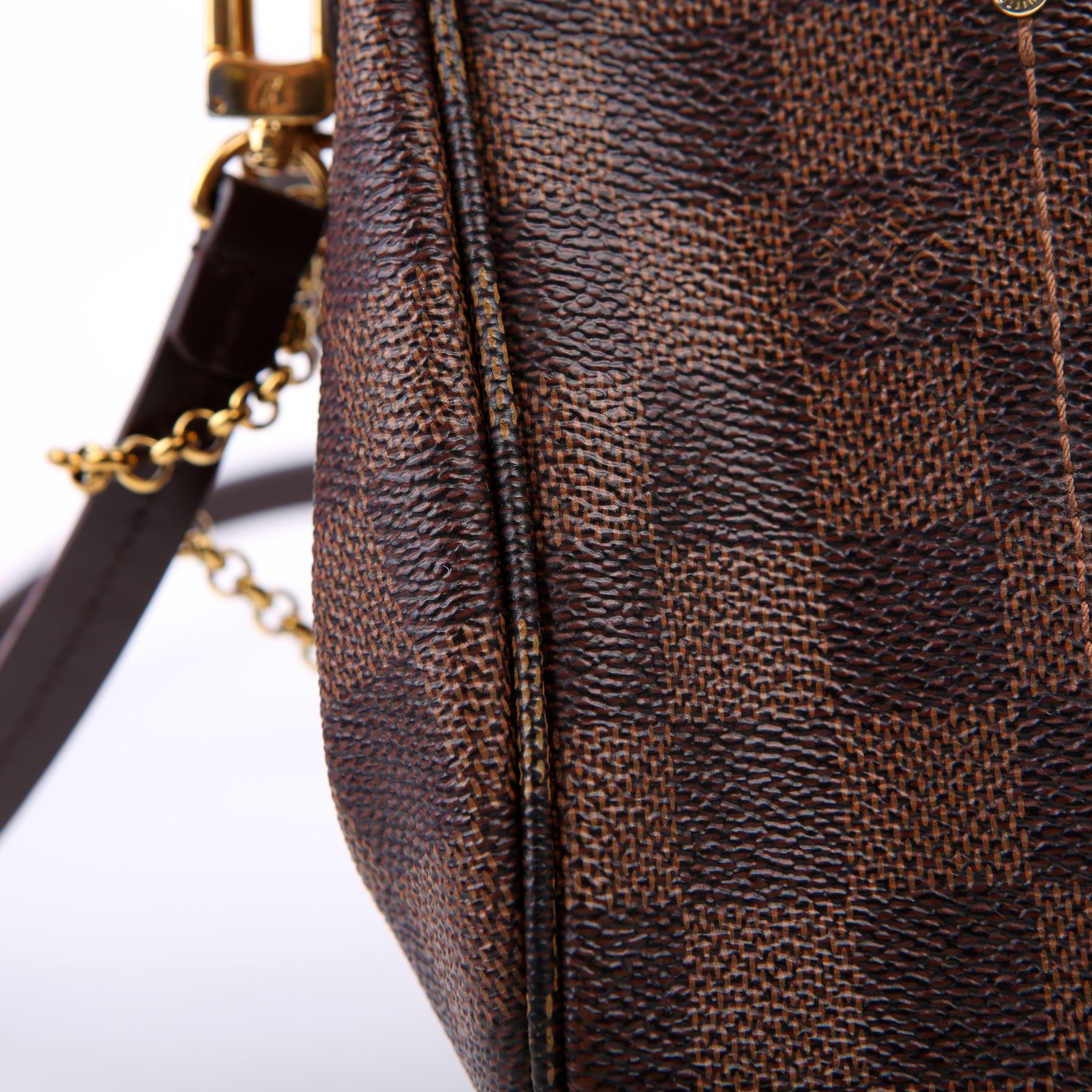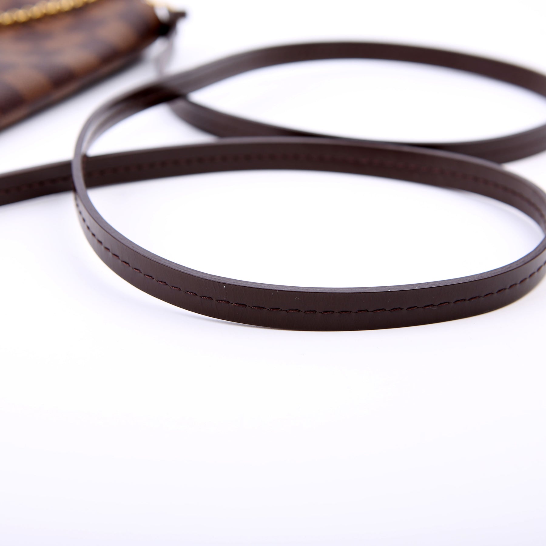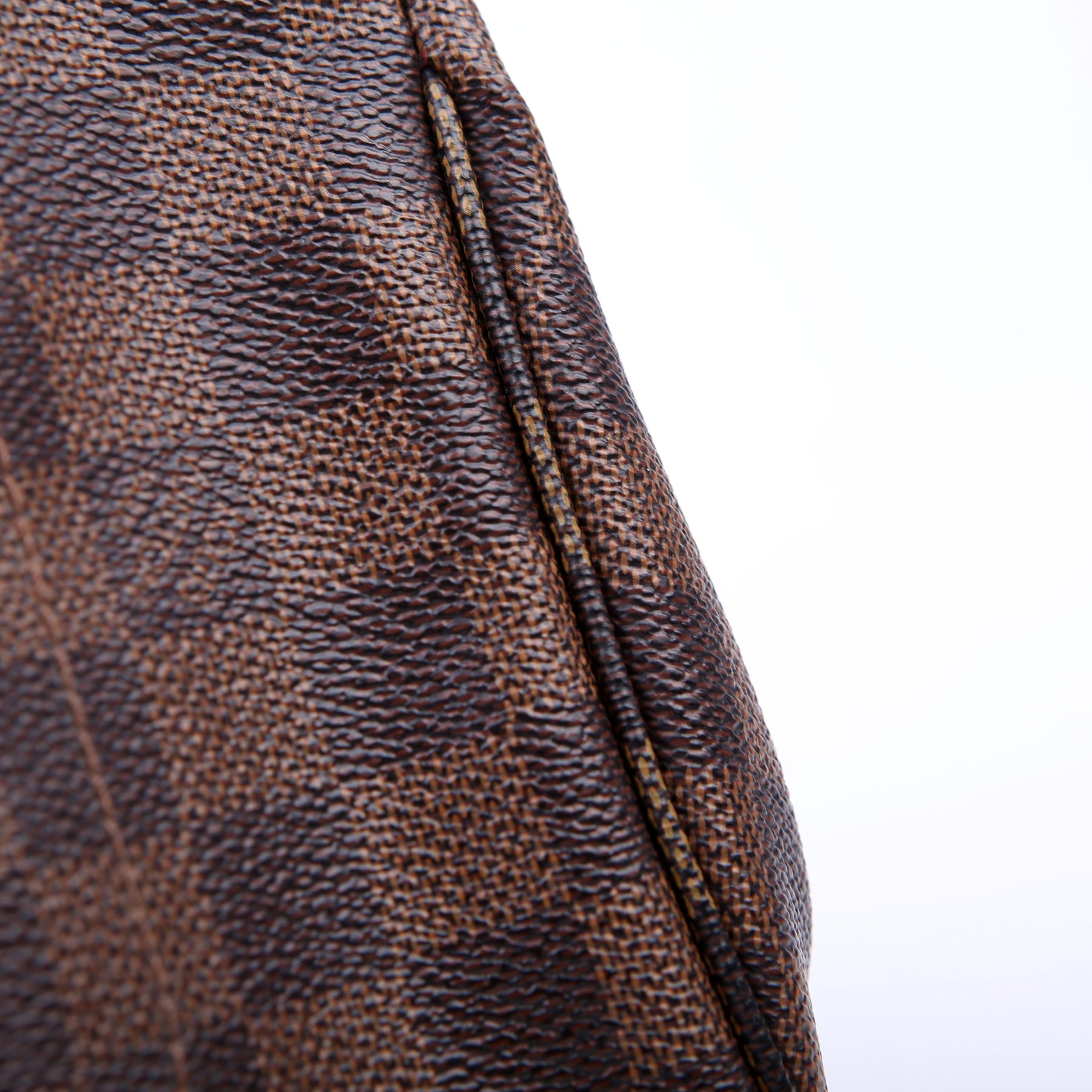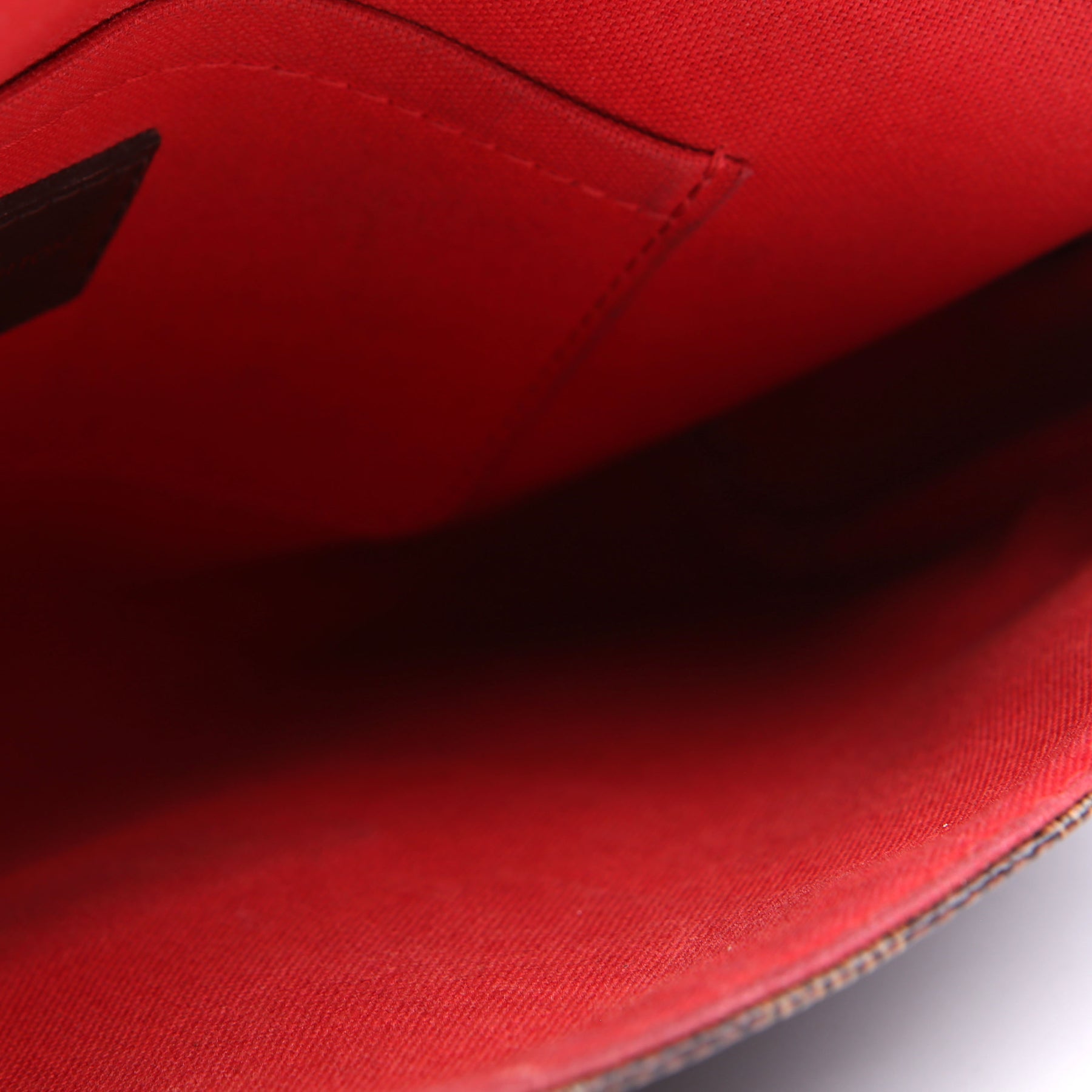 This pre-owned Louis Vuitton Favorite MM is guaranteed 100% authentic. The exterior is in the classic Louis Vuitton Damier Ebene coated canvas.