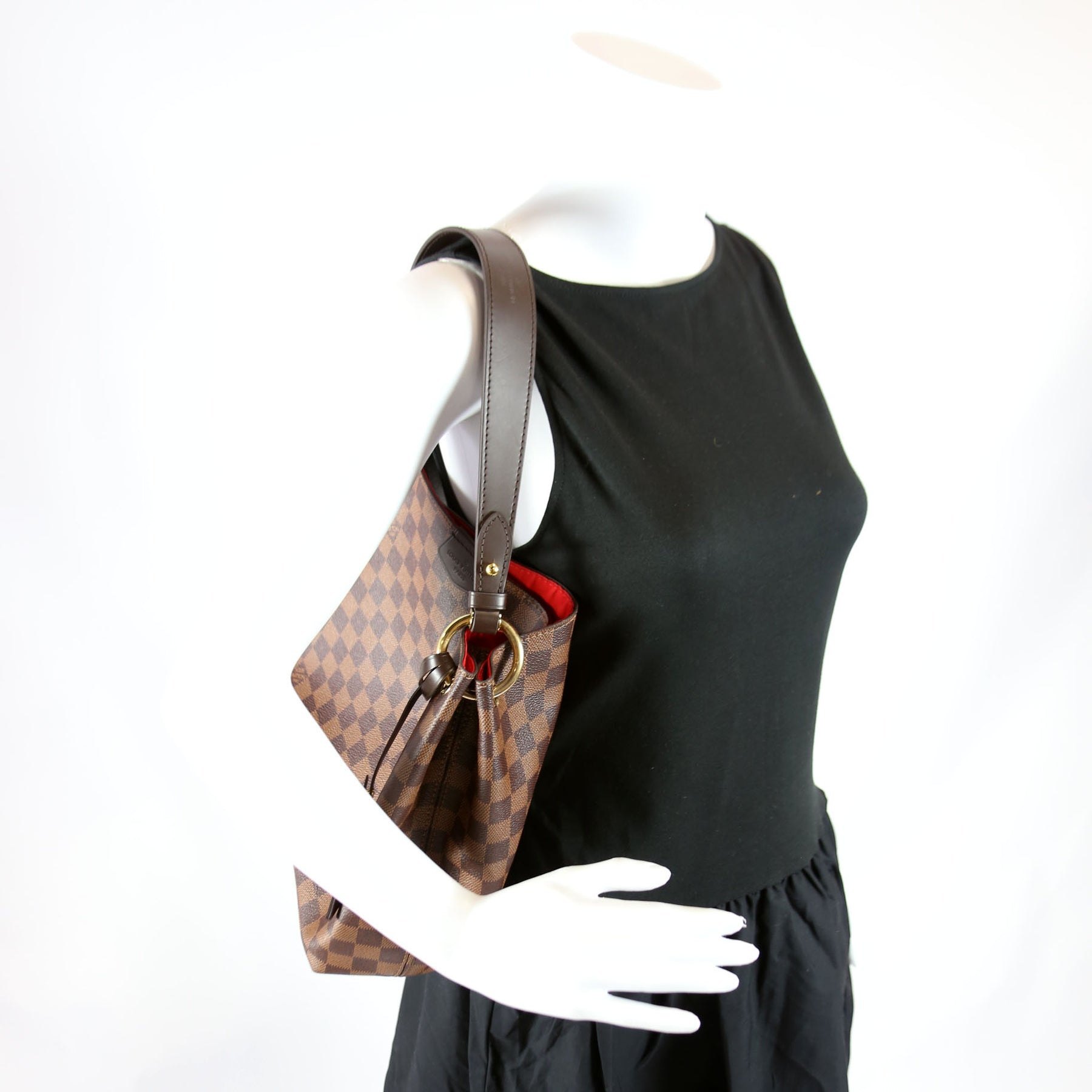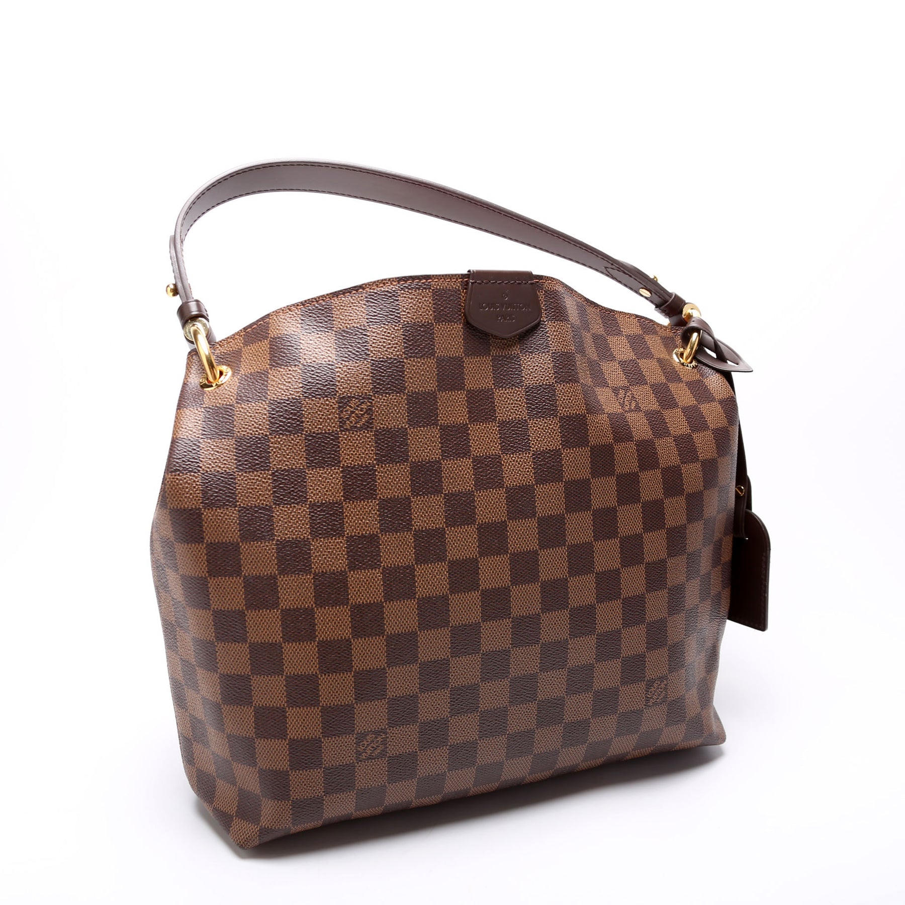 This pre-owned Louis Vuitton Graceful PM is guaranteed 100% authentic. The exterior is in the classic Louis Vuitton Damier Ebene coated canvas.