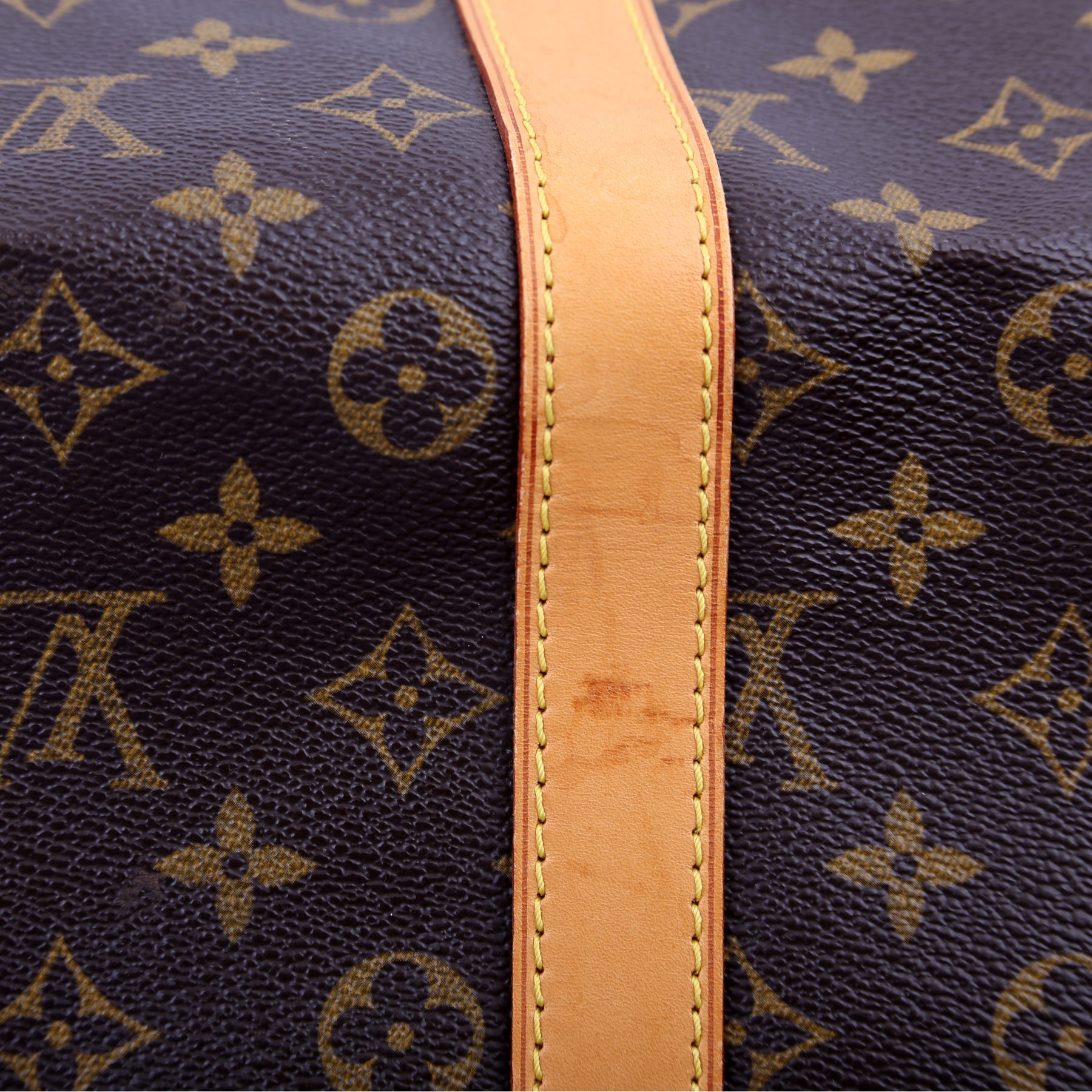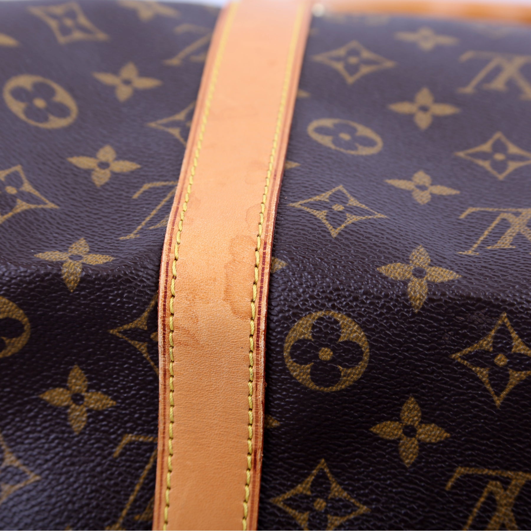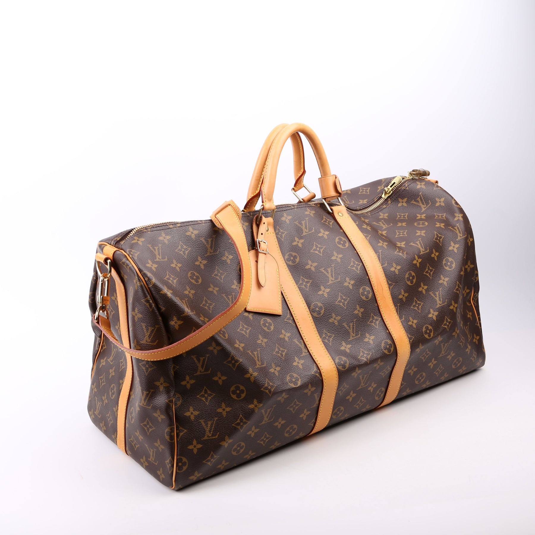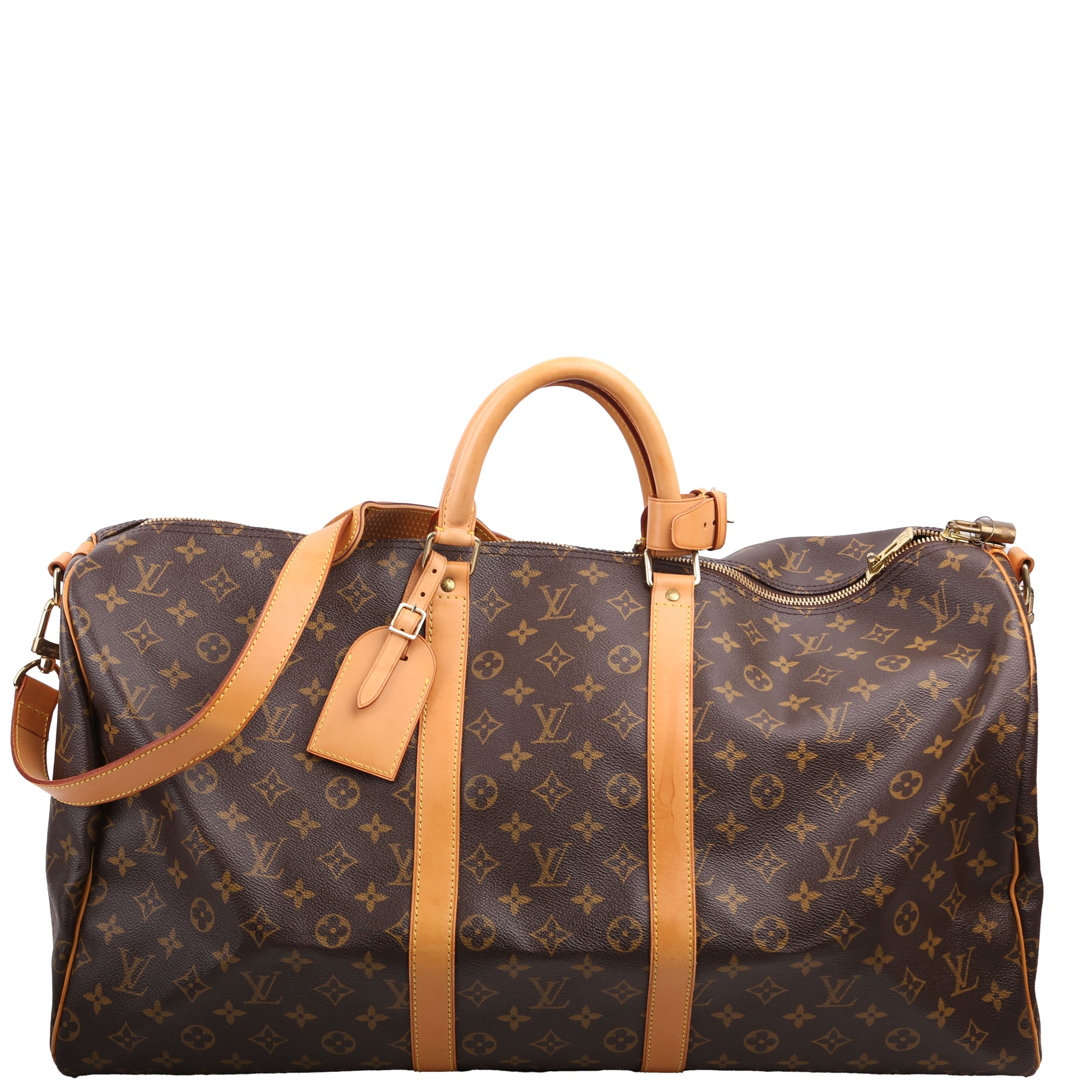 This pre-owned Louis Vuitton Keepall 55 Bandouliere is guaranteed 100% authentic. The exterior is in the classic Louis Vuitton Monogram coated canvas.