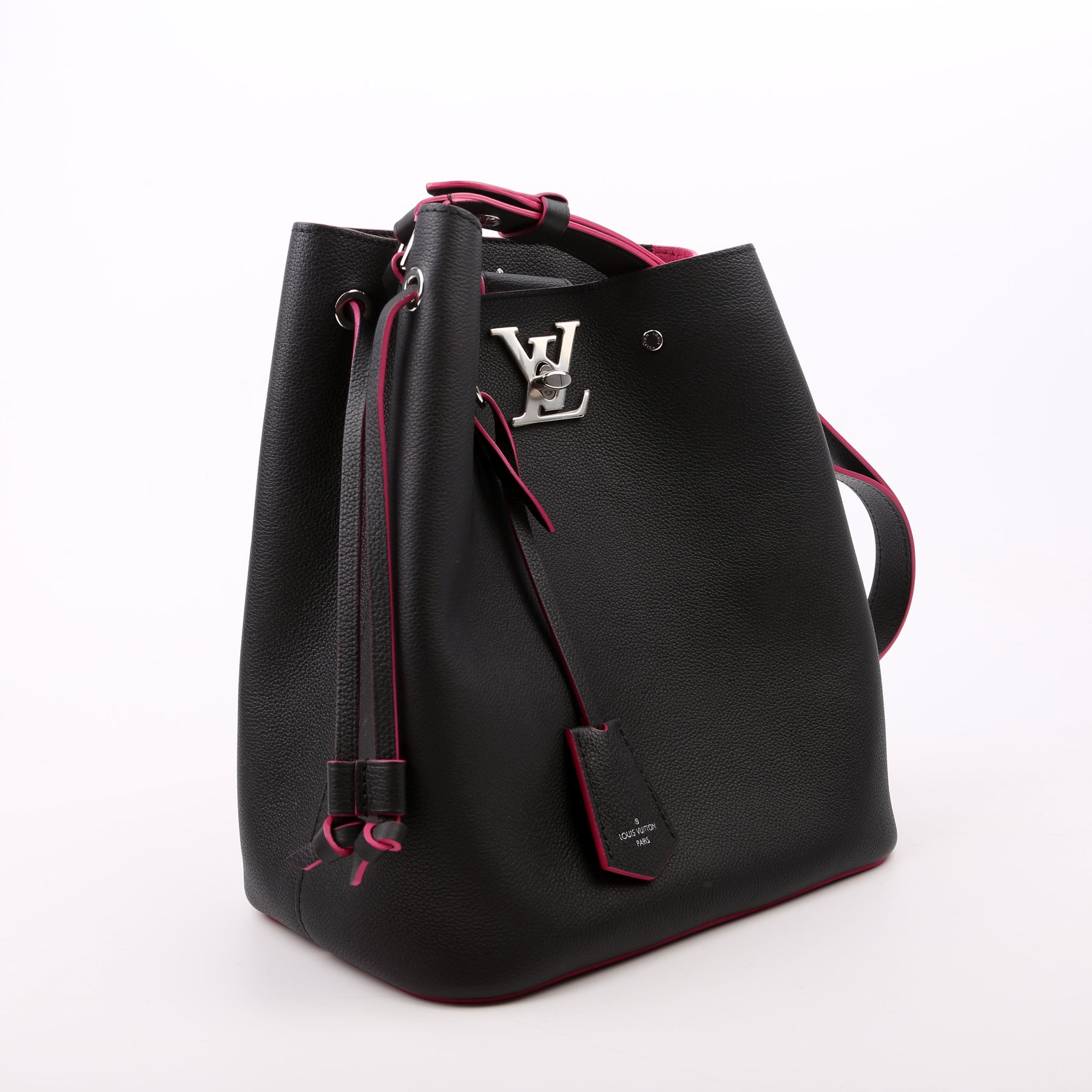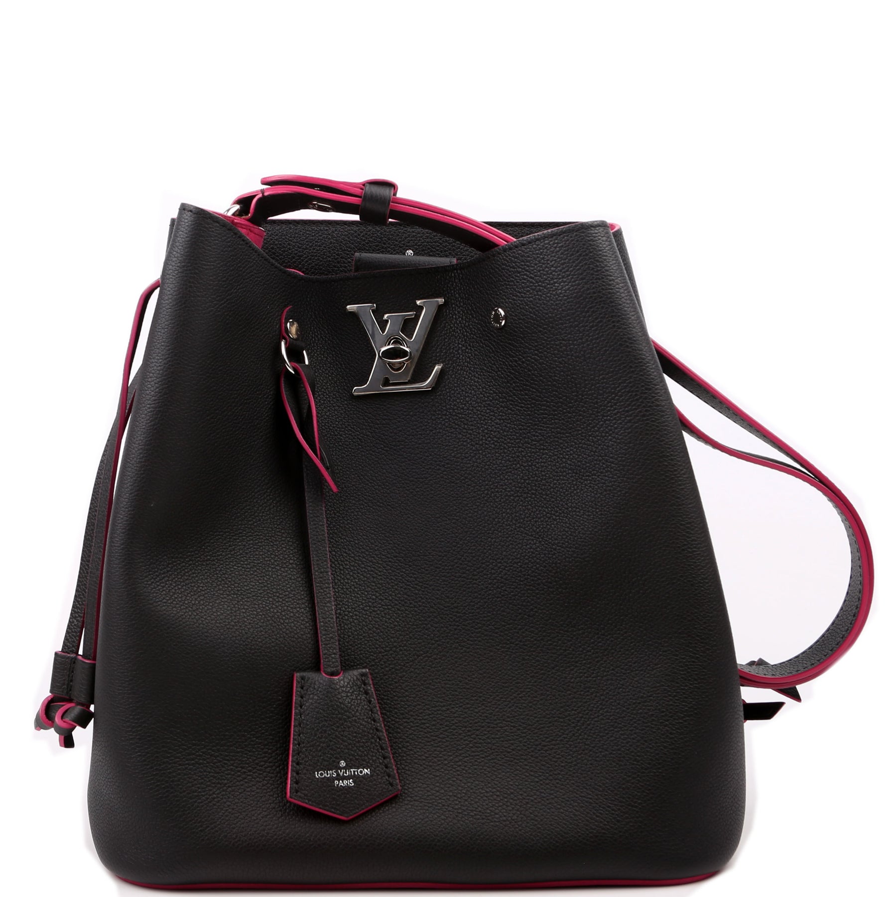 This pre-owned Louis Vuitton Lockme Bucket Bag is guaranteed 100% authentic. The exterior is in the Louis Vuitton calfskin leather.