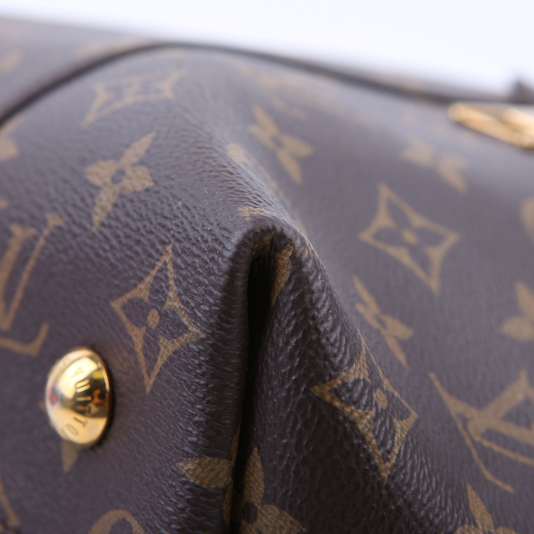 Exterior: The exterior coated canvas is free from wear. The exterior features two zipper pockets.
