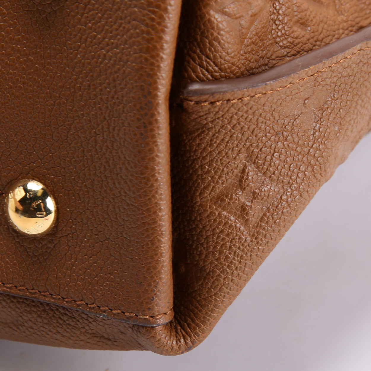 Handle: The leather handle is free from wear. The piping shows scuffs.