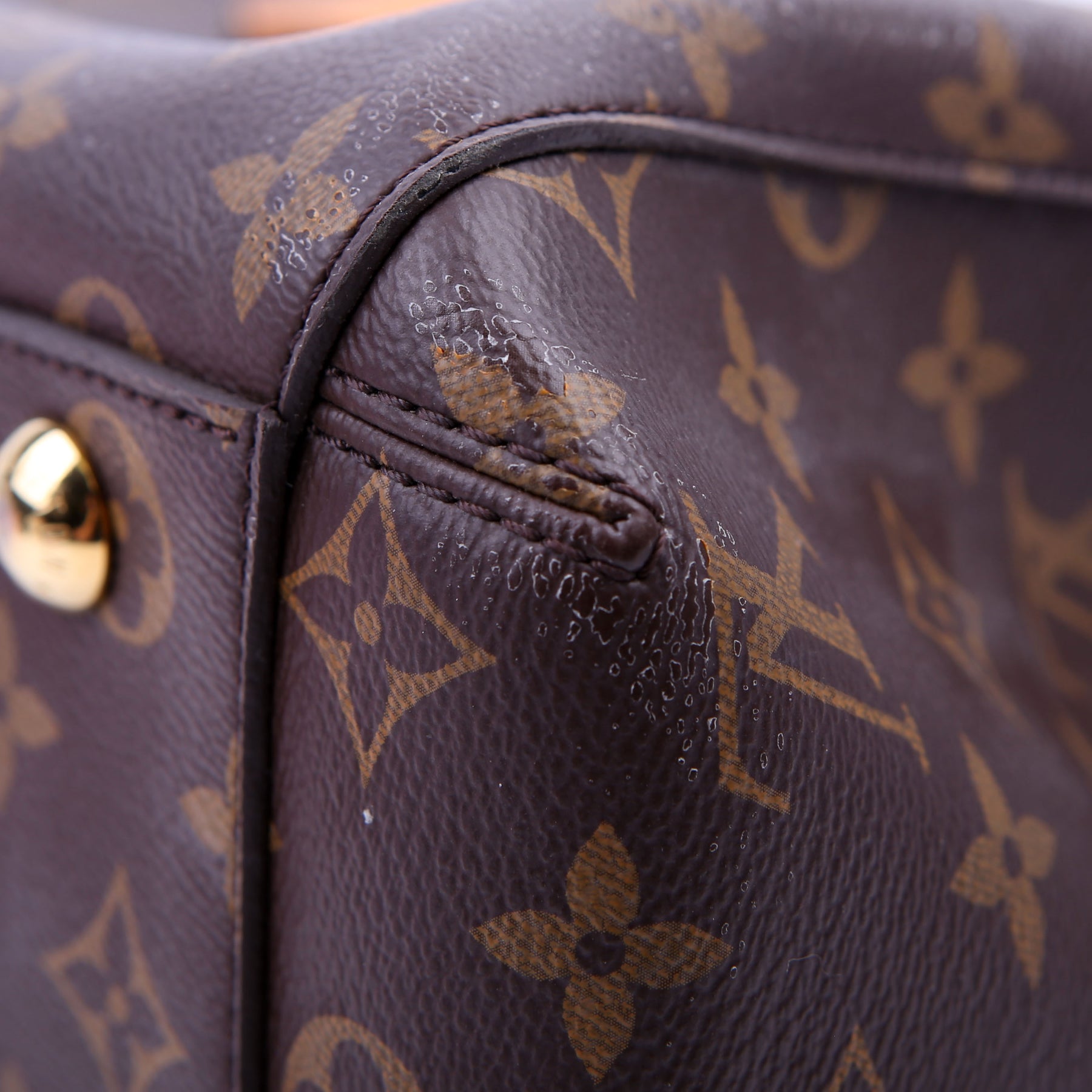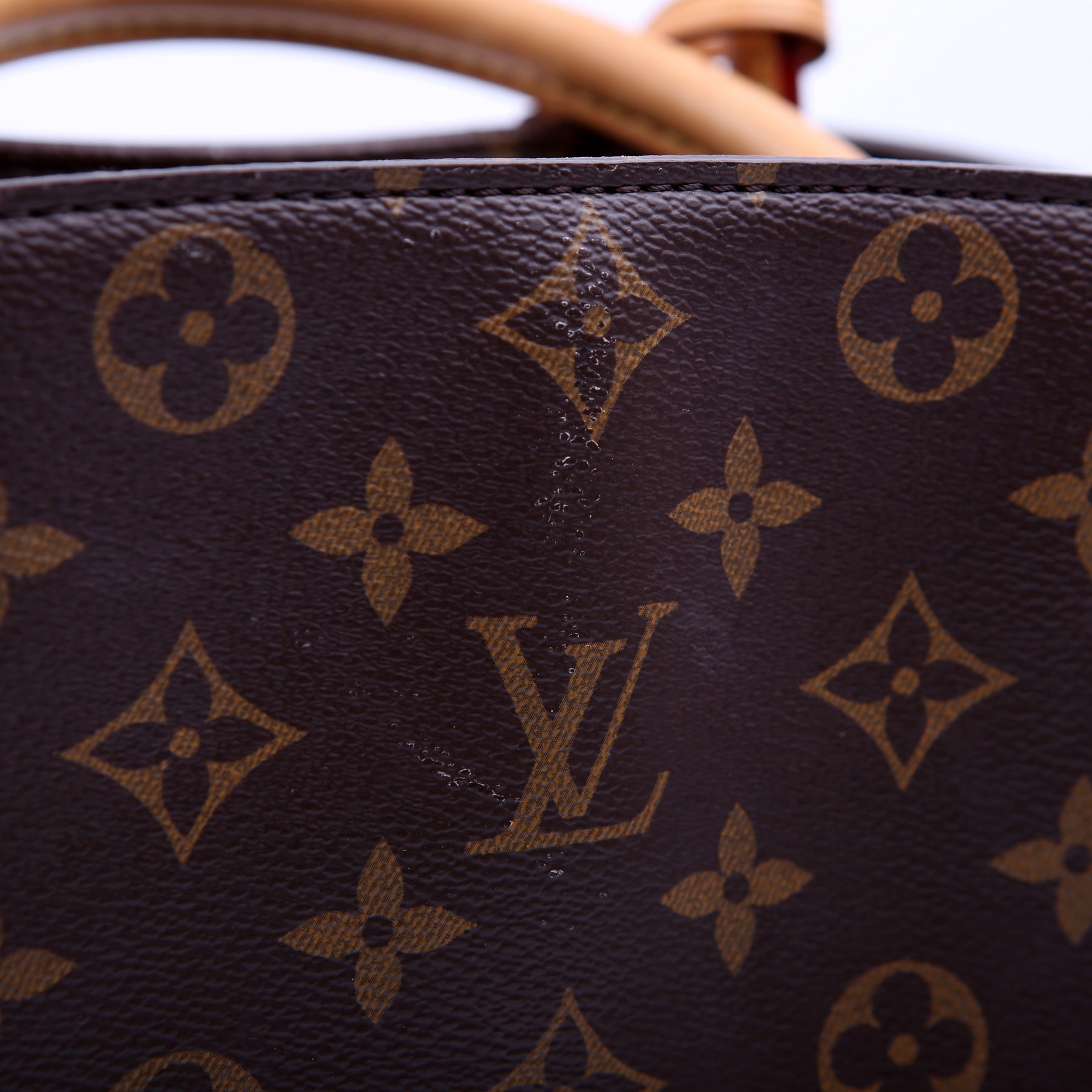 Exterior: The exterior shows minor peeling throughout the coated canvas. The leather tabs show minor wear and discoloration.
