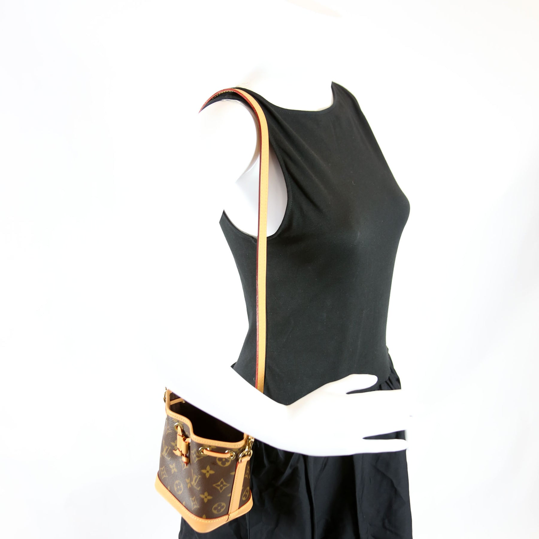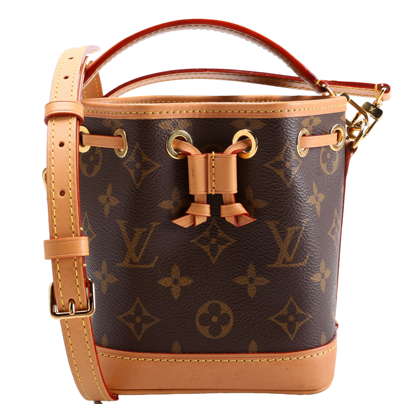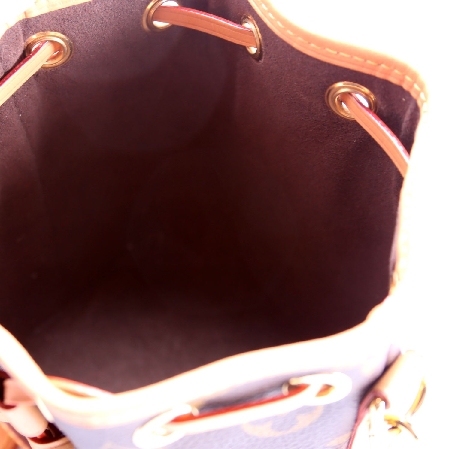 This pre-owned Louis Vuitton Nano Noe is guaranteed 100% authentic. The exterior is in the classic Louis Vuitton Monogram coated canvas.