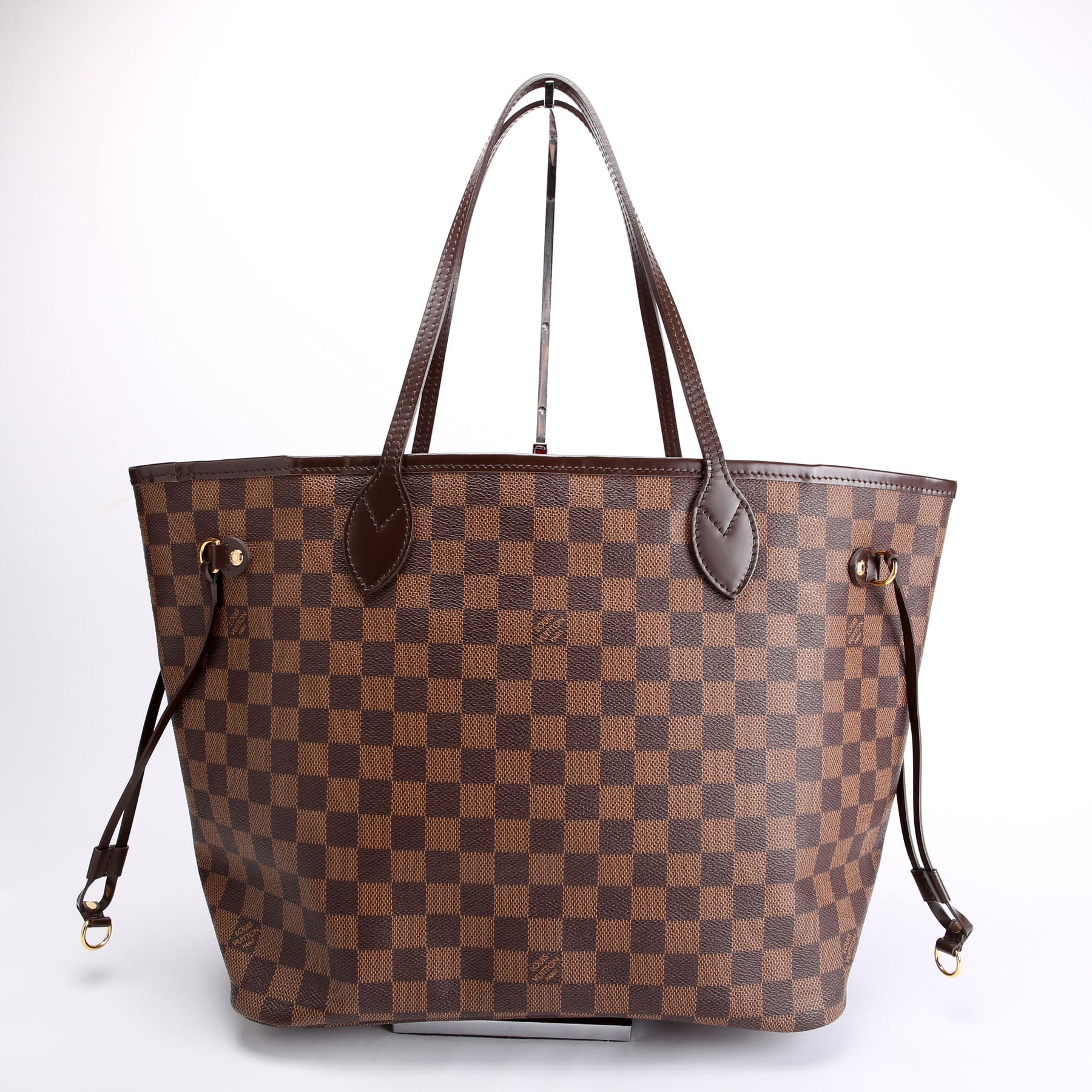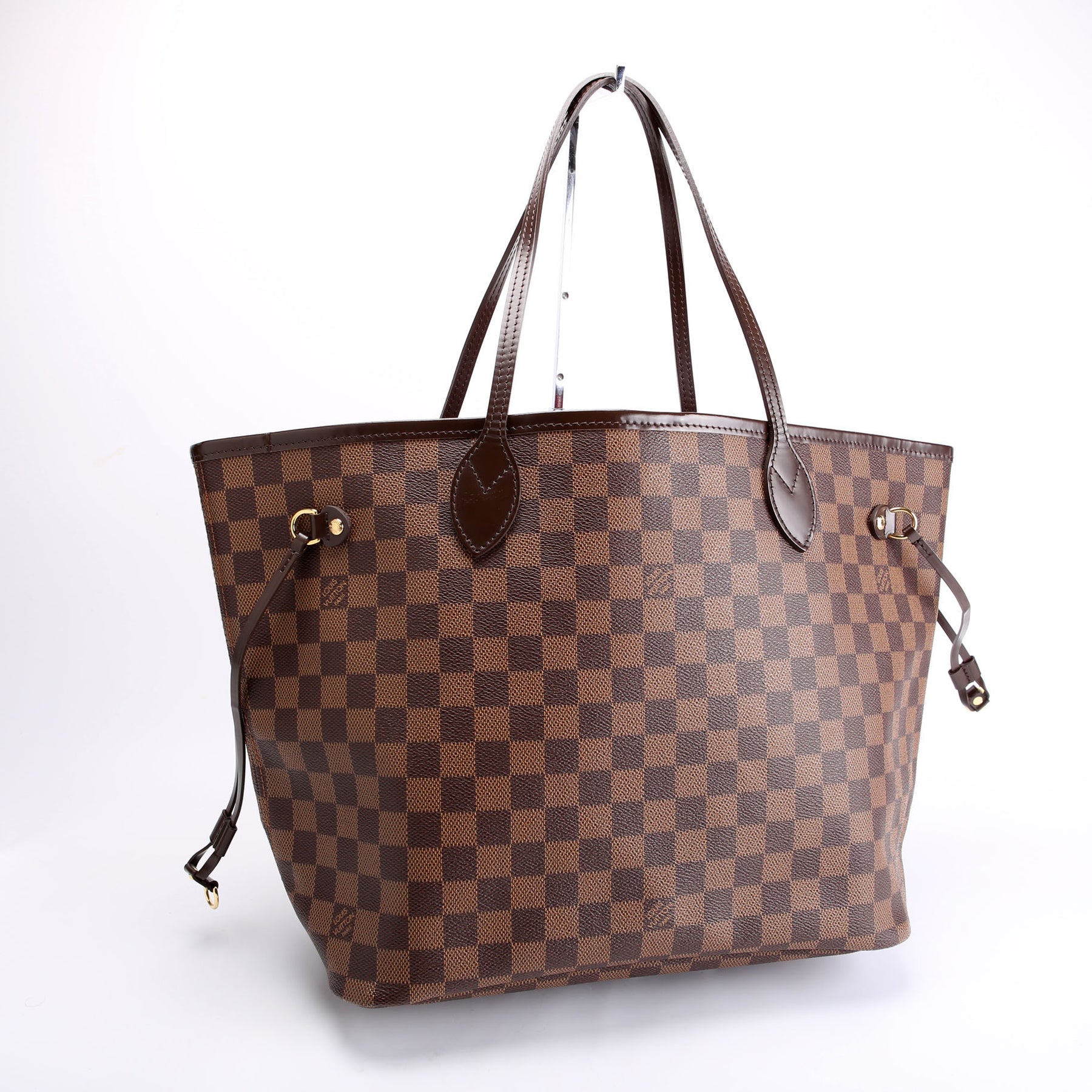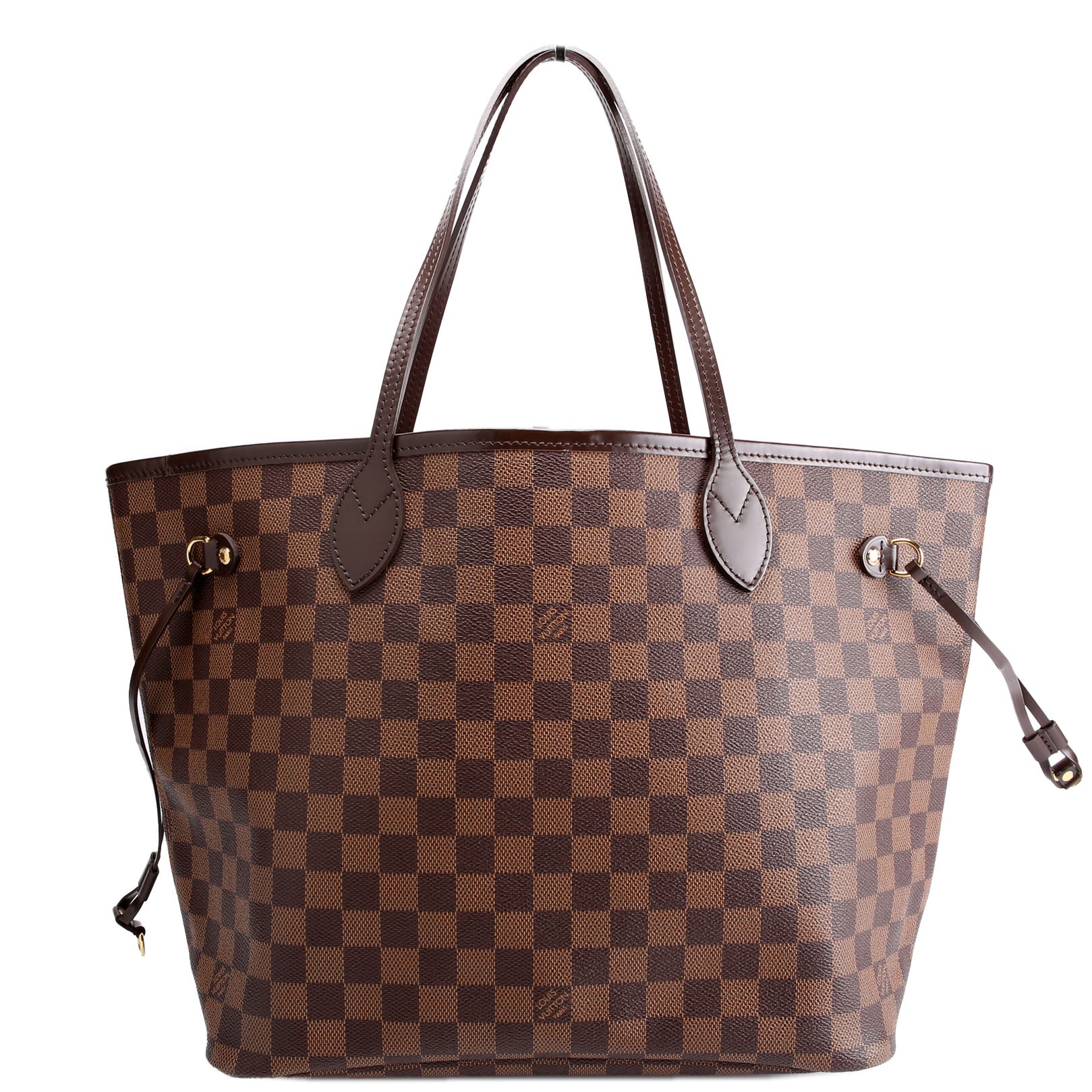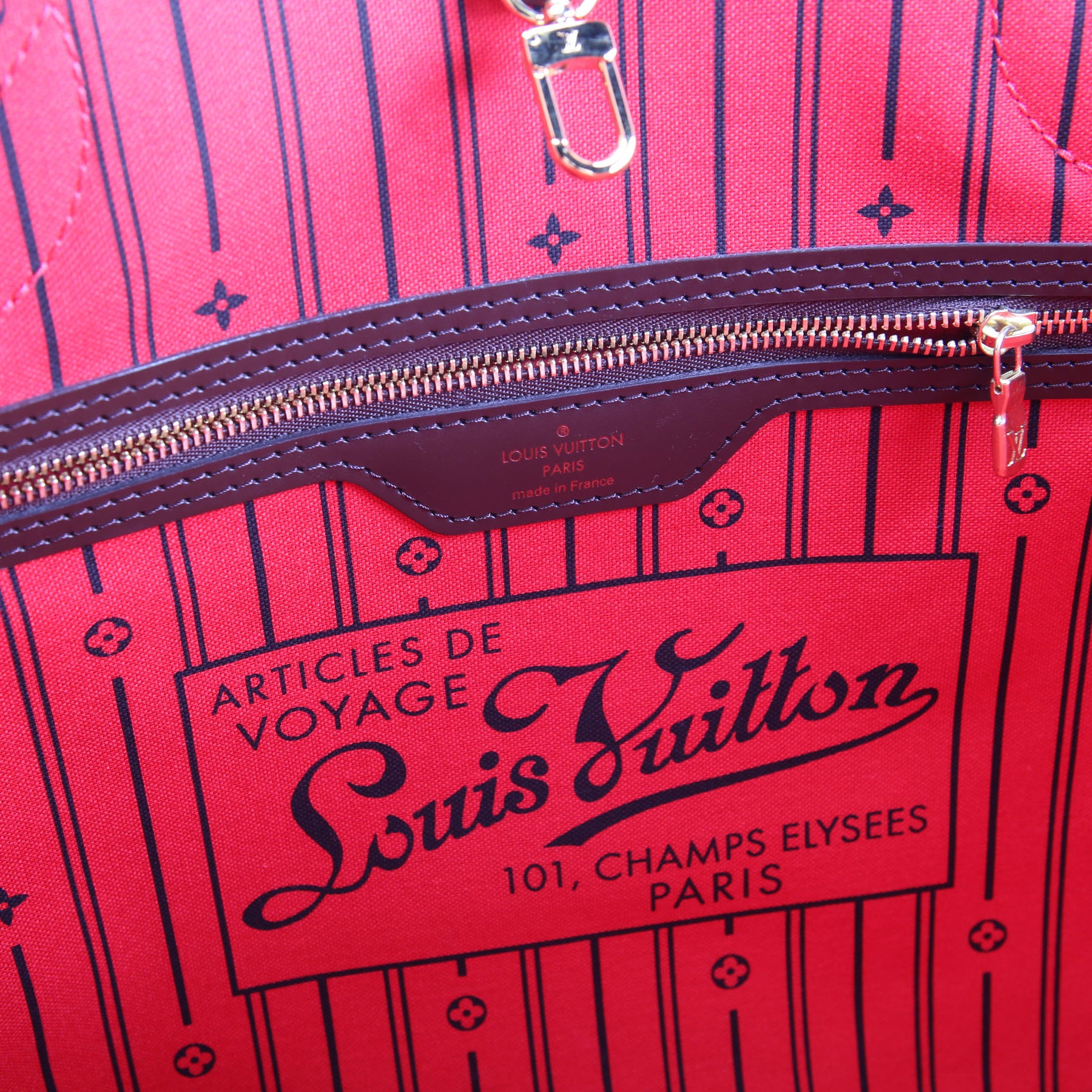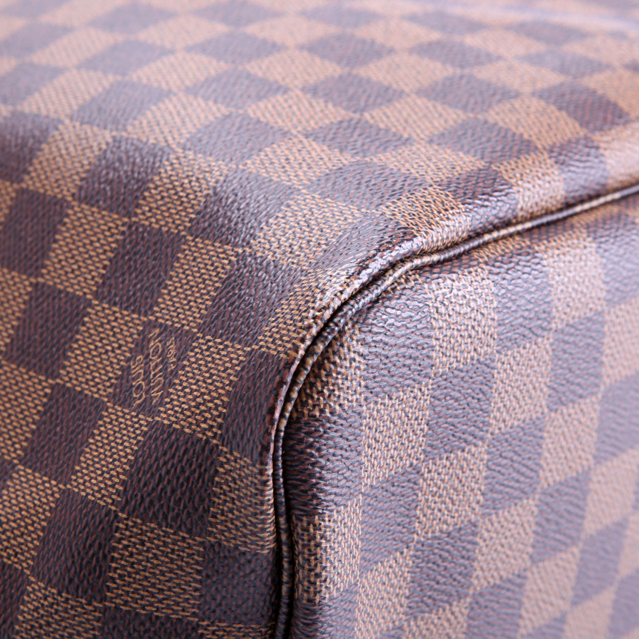 This pre-owned Louis Vuitton Neverfull MM is guaranteed 100% authentic. The exterior is in the classic Louis Vuitton Damier Ebene Coated Canvas