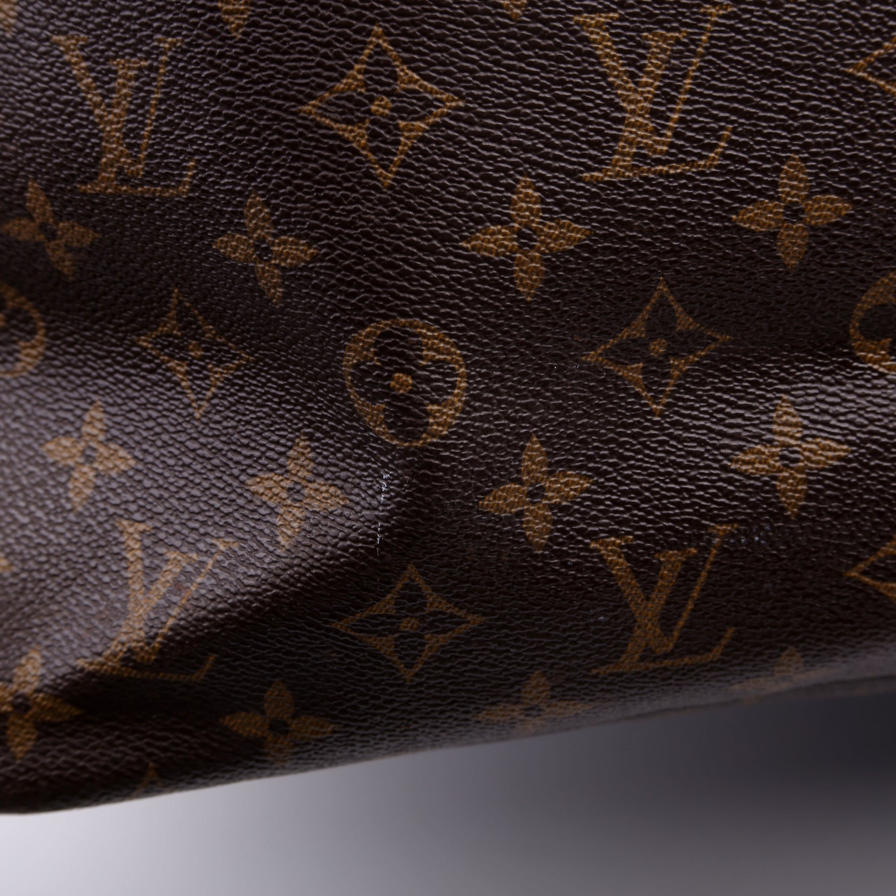 Exterior: The exterior coated canvas is free of any rips or cracks. There is light fading and discoloration throughout the exterior. The leather details show discoloration.