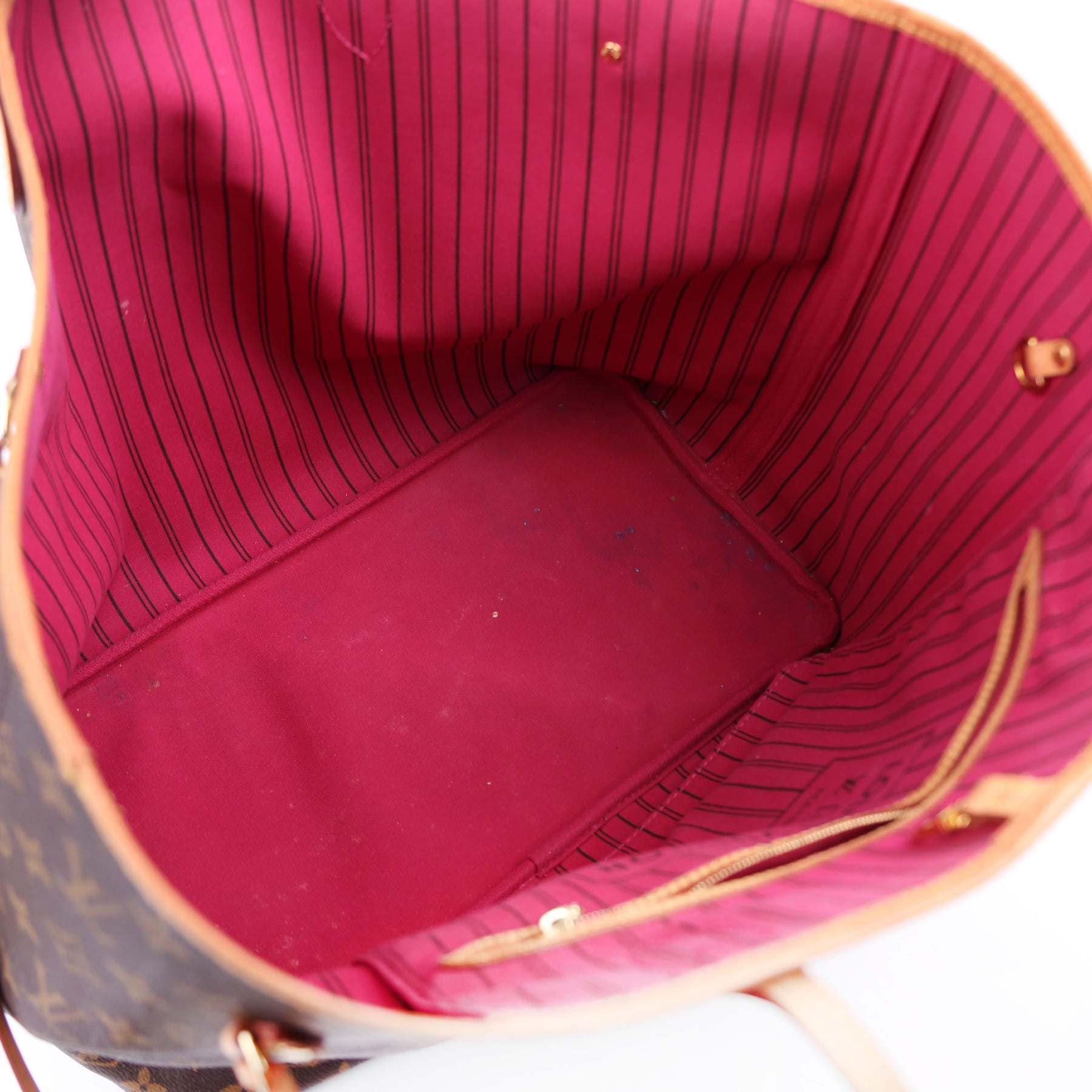 Interior: The interior shows heavy discoloration and staining throughout. It features one zip closure pocket.