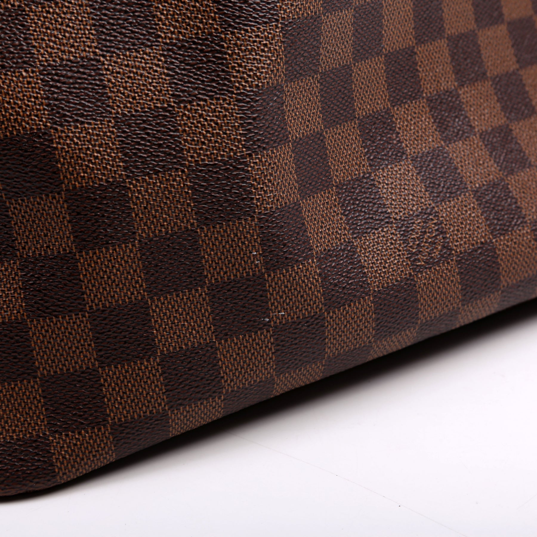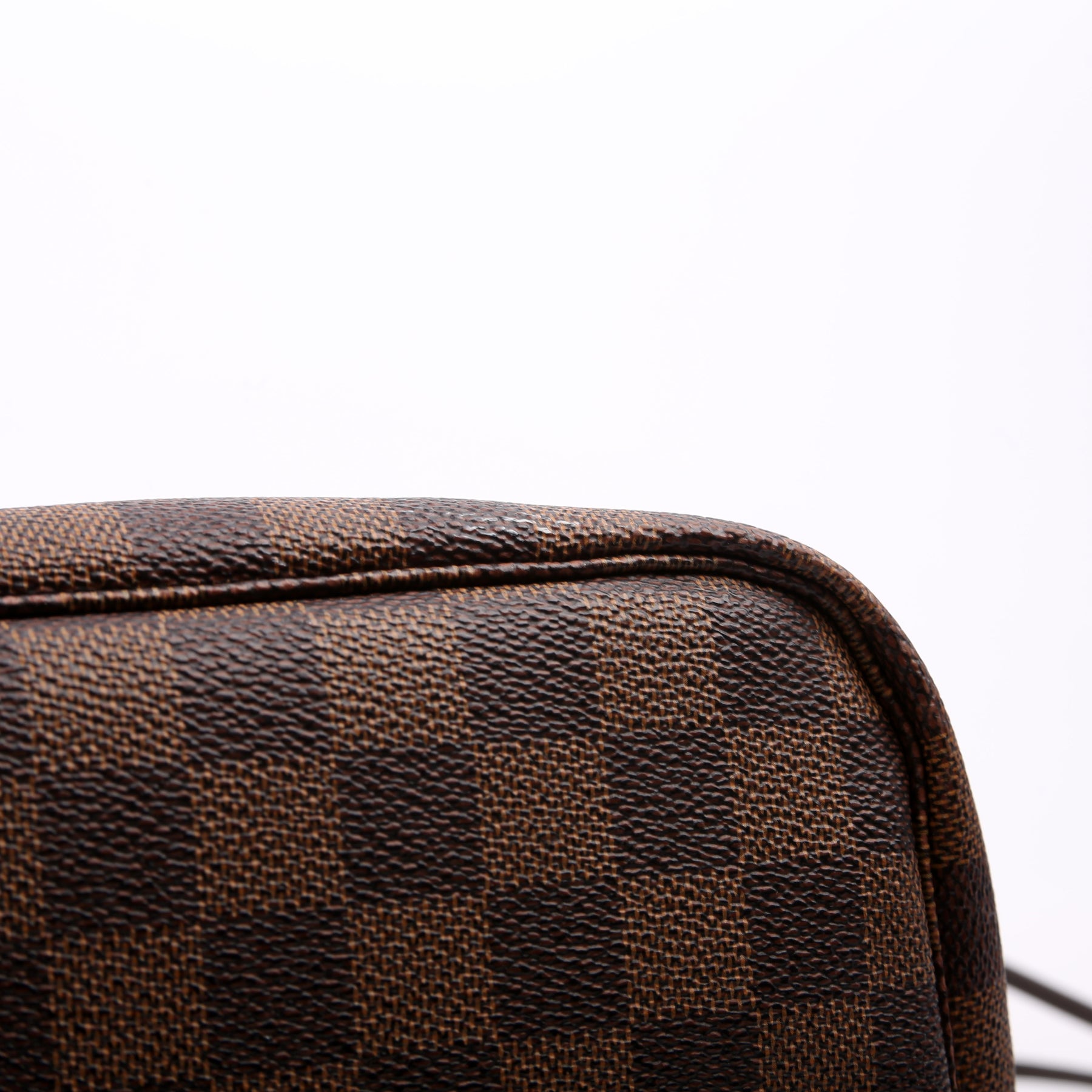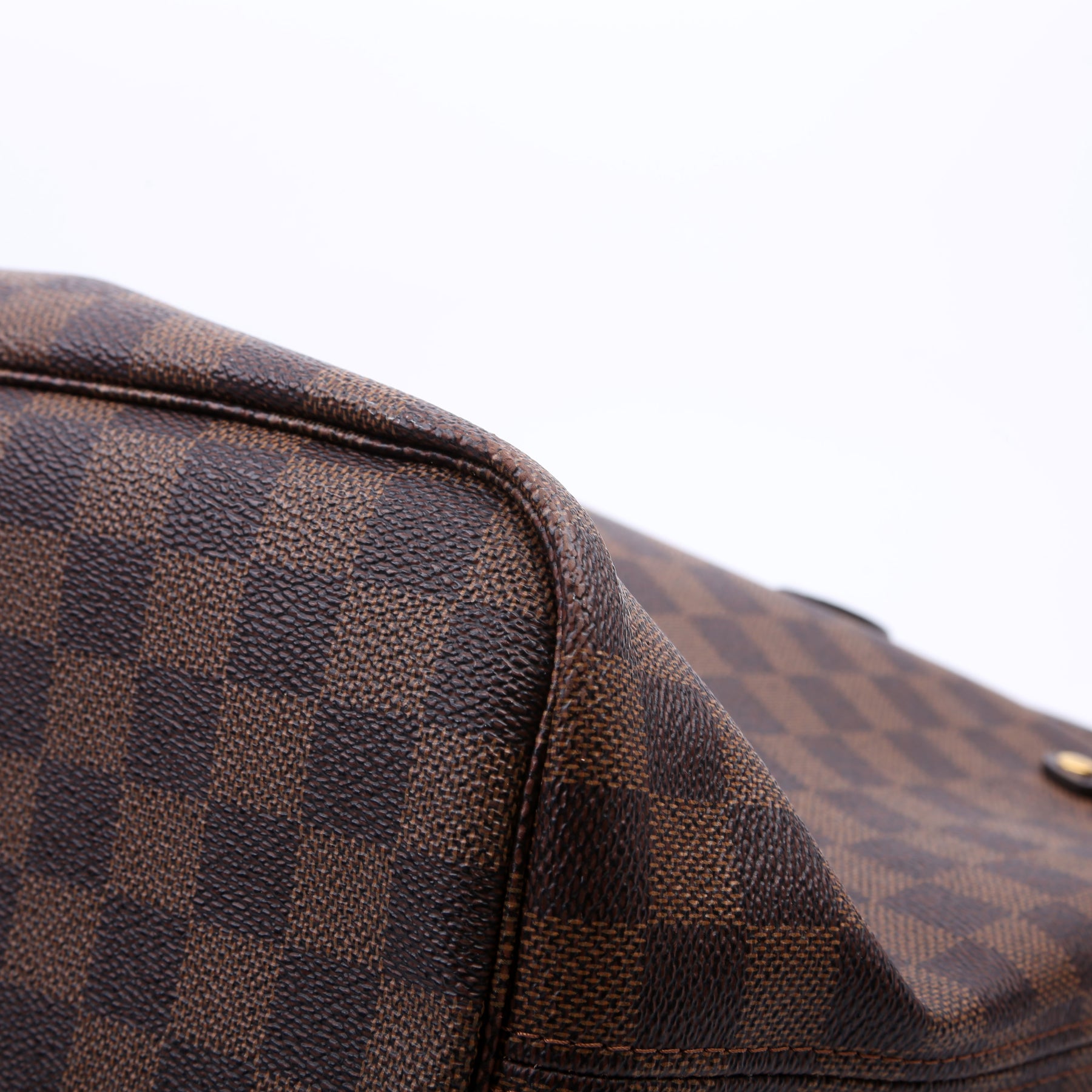 This pre-owned Louis Vuitton Neverfull MM is guaranteed 100% authentic. The exterior is in the classic Louis Vuitton Damier Ebene coated canvas.