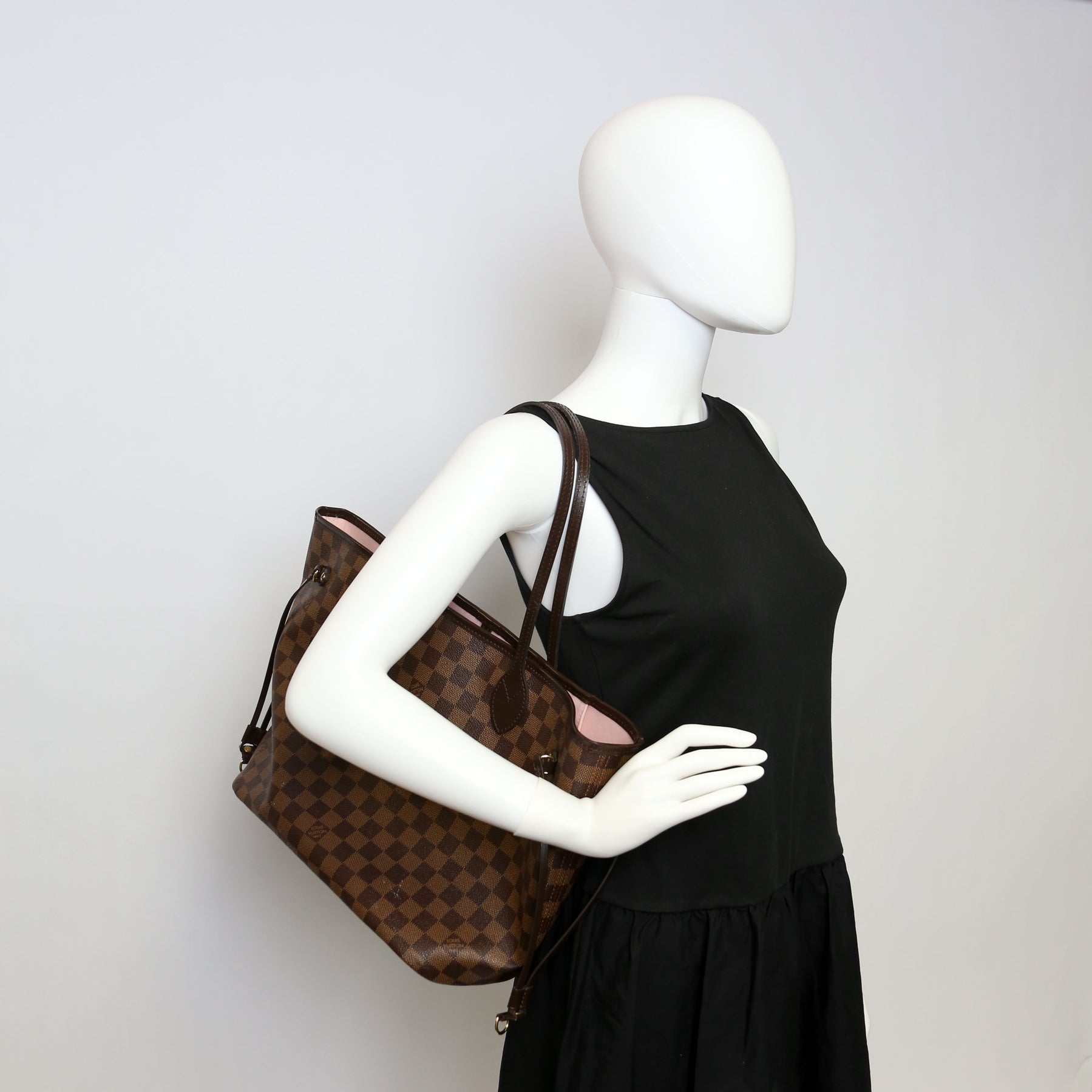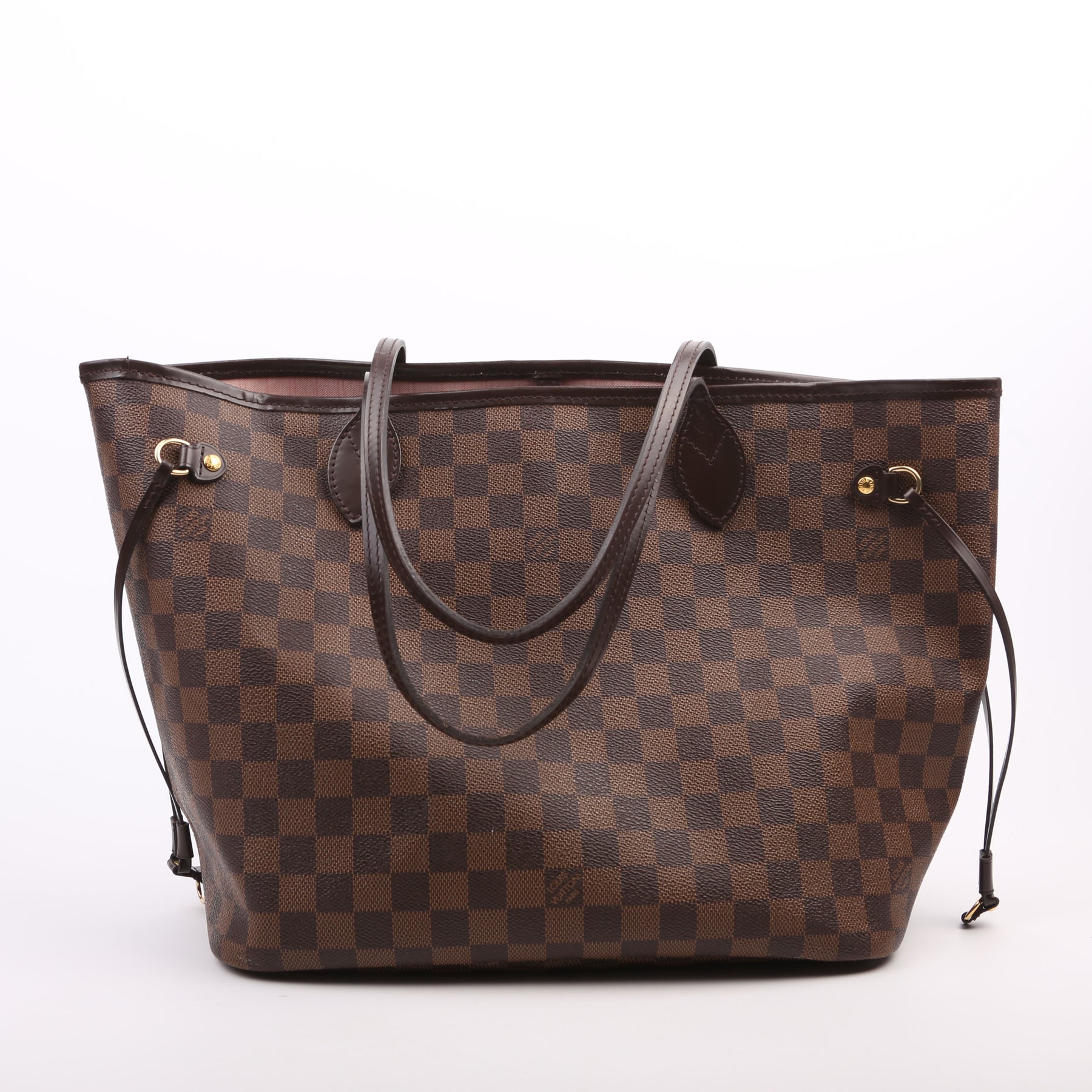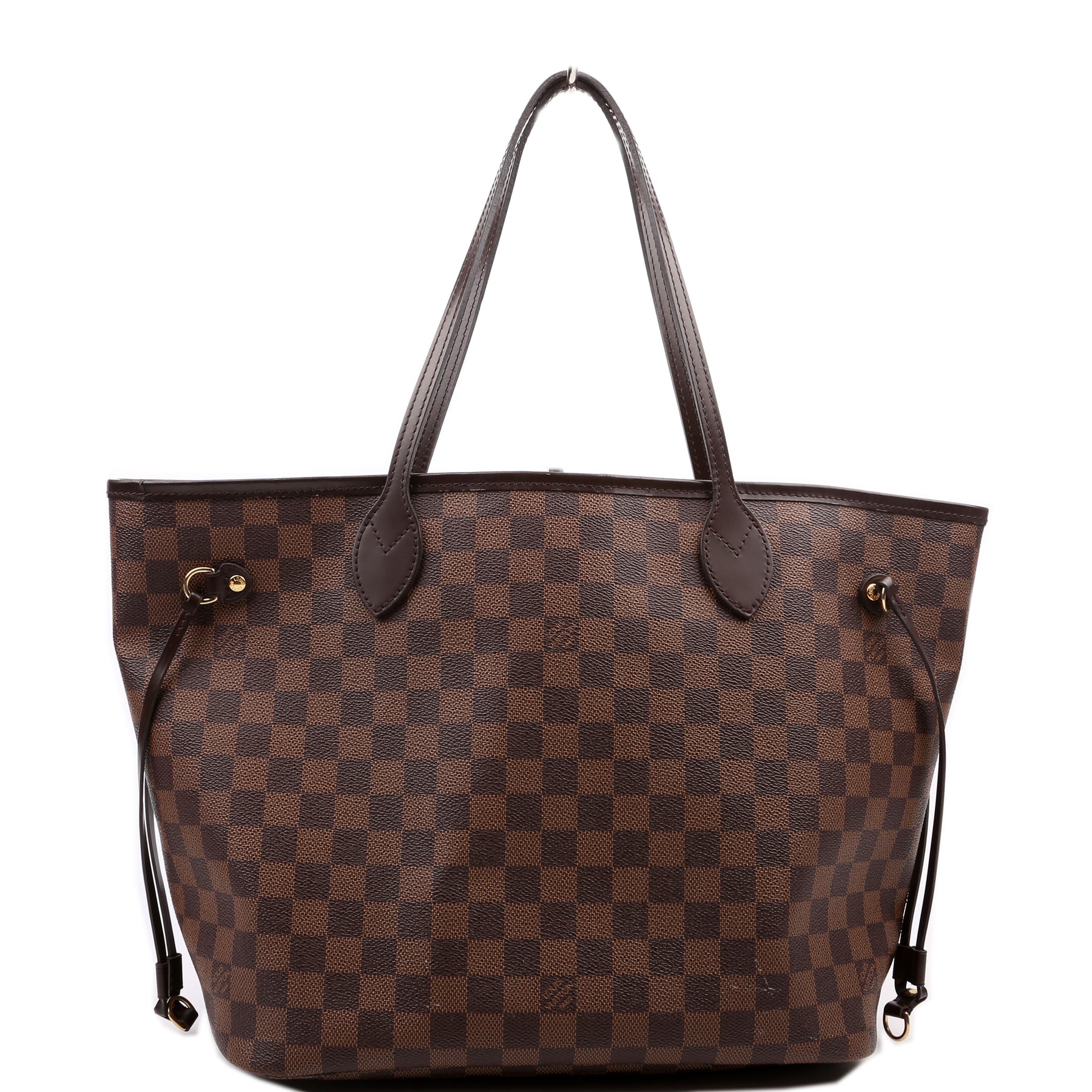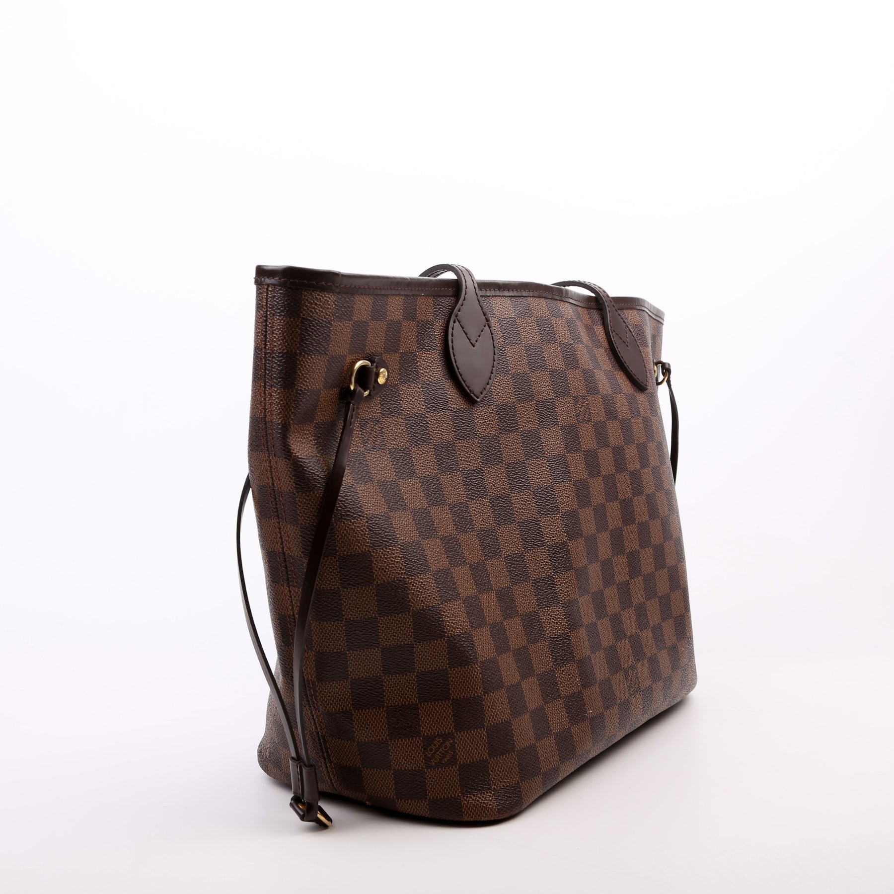 This pre-owned Louis Vuitton Neverfull MM is guaranteed 100% authentic. The exterior is in the classic Louis Vuitton Damier Ebene coated canvas.