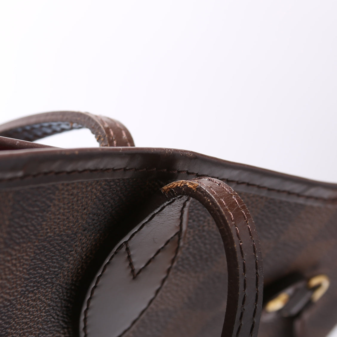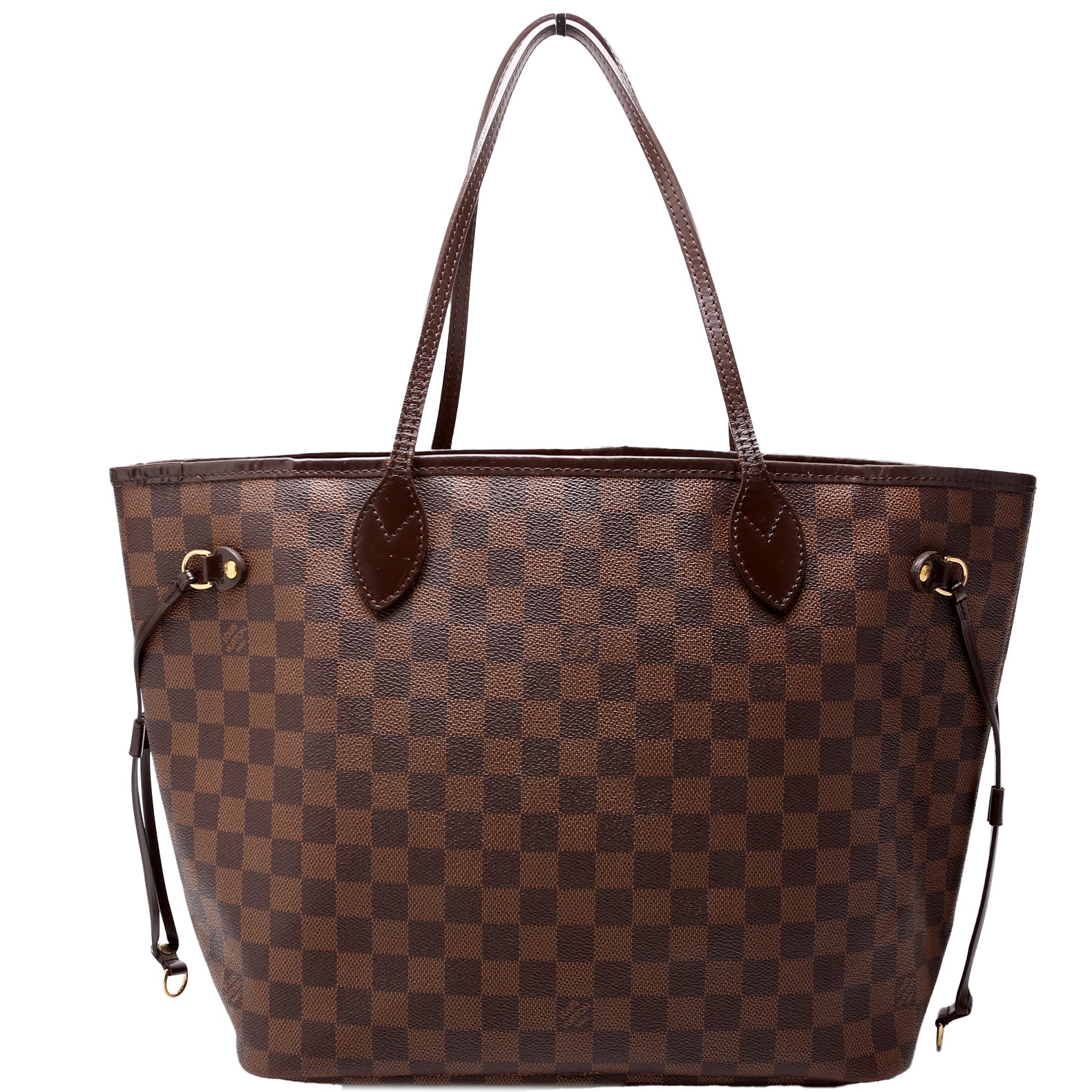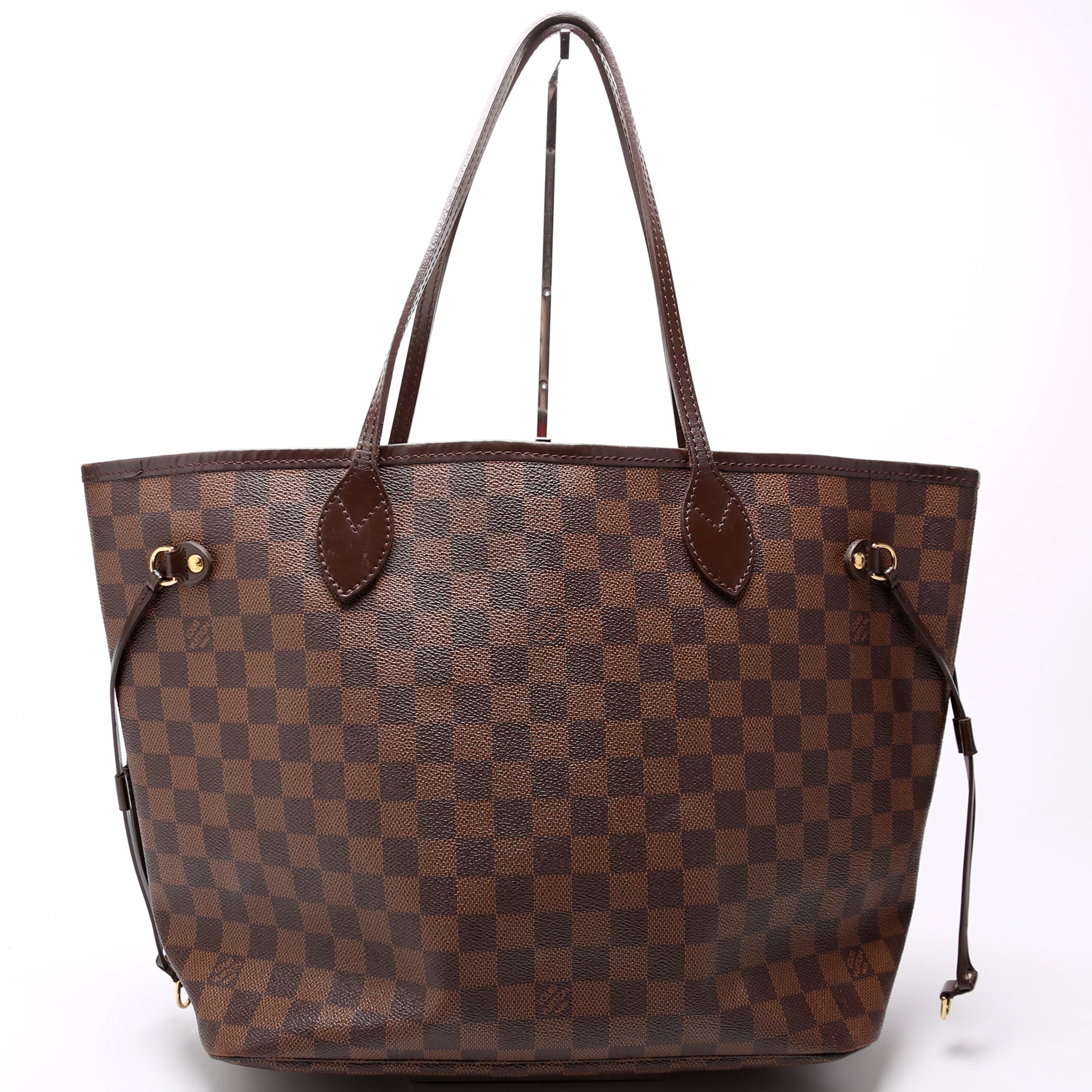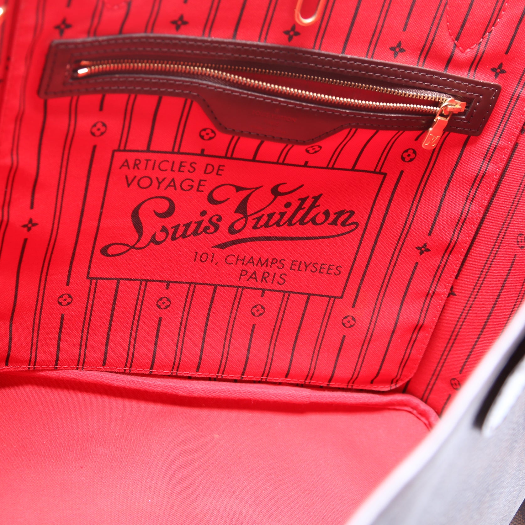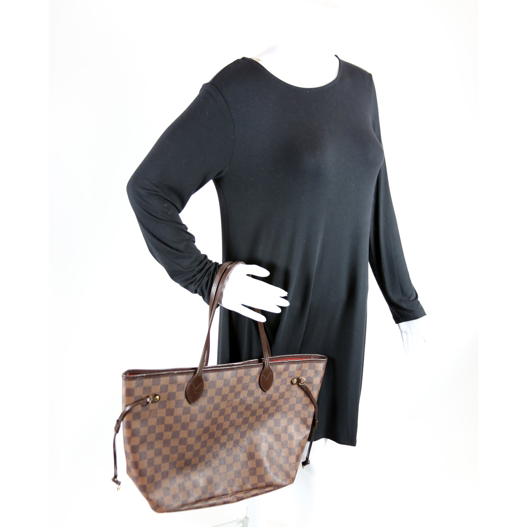 This pre-owned Louis Vuitton Neverfull MM is guaranteed 100% authentic. The exterior is in the classic Louis Vuitton Damier Ebene coated canvas.