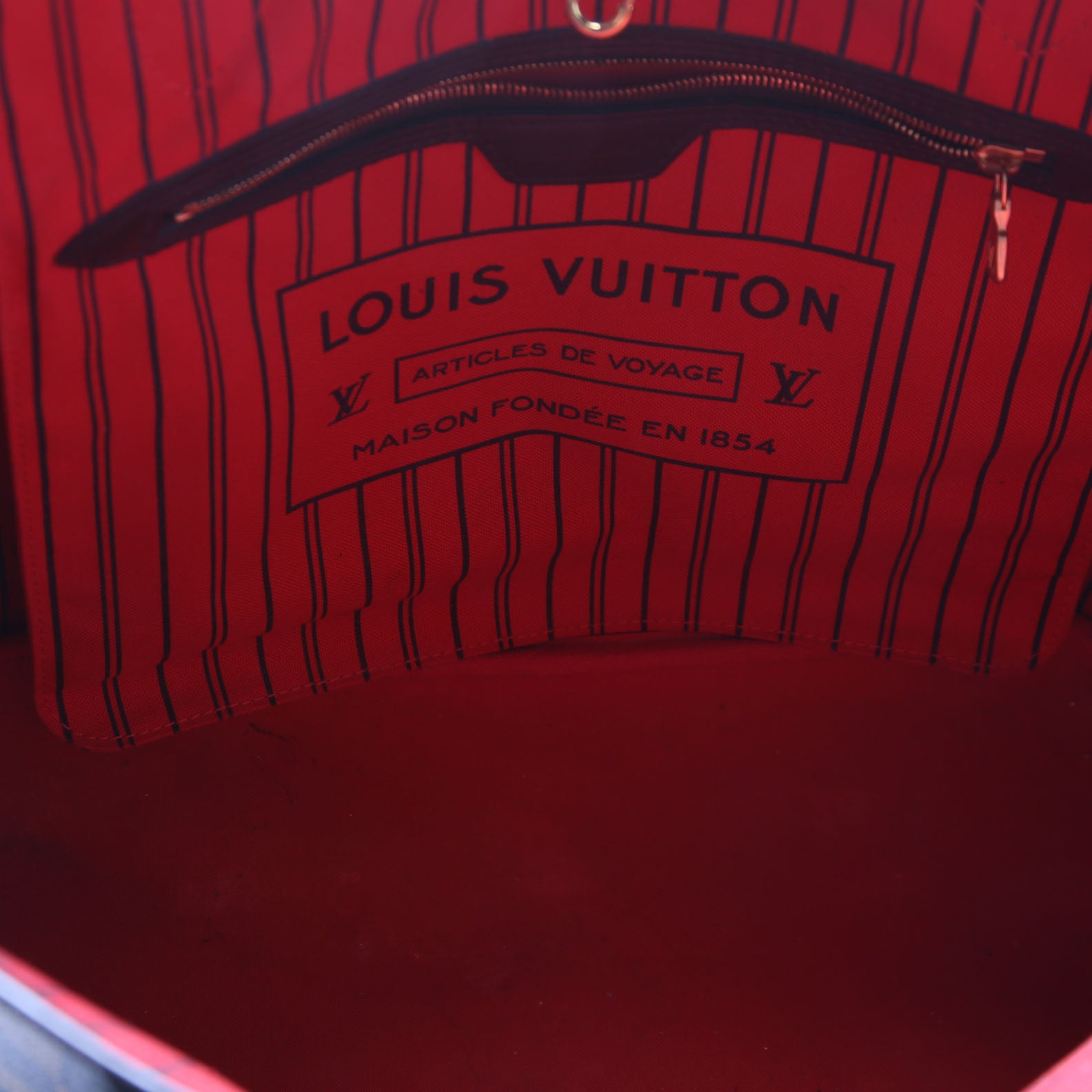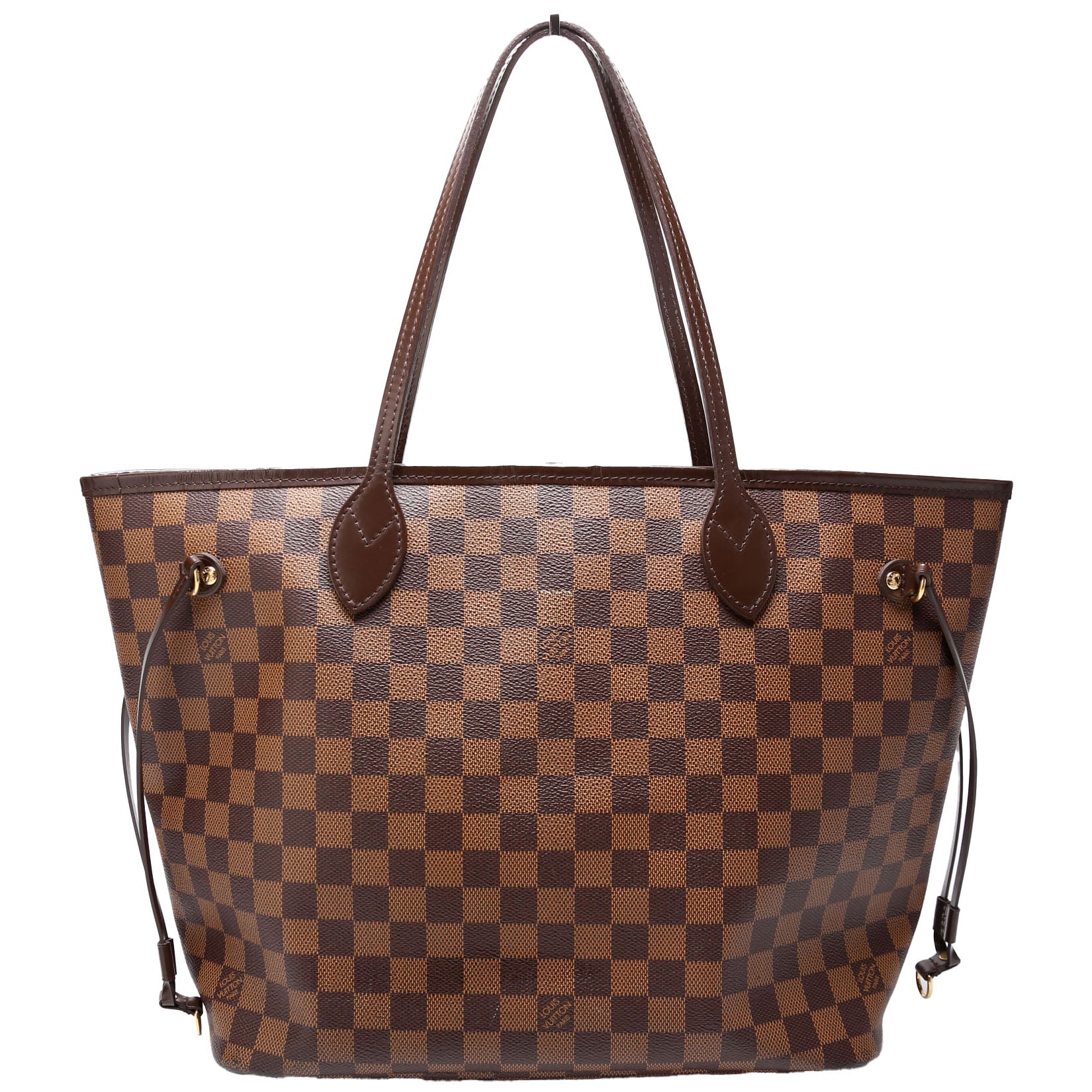 This pre-owned Louis Vuitton Neverfull MM is guaranteed 100% authentic. The exterior is in the classic Louis Vuitton Damier Ebene coated canvas.