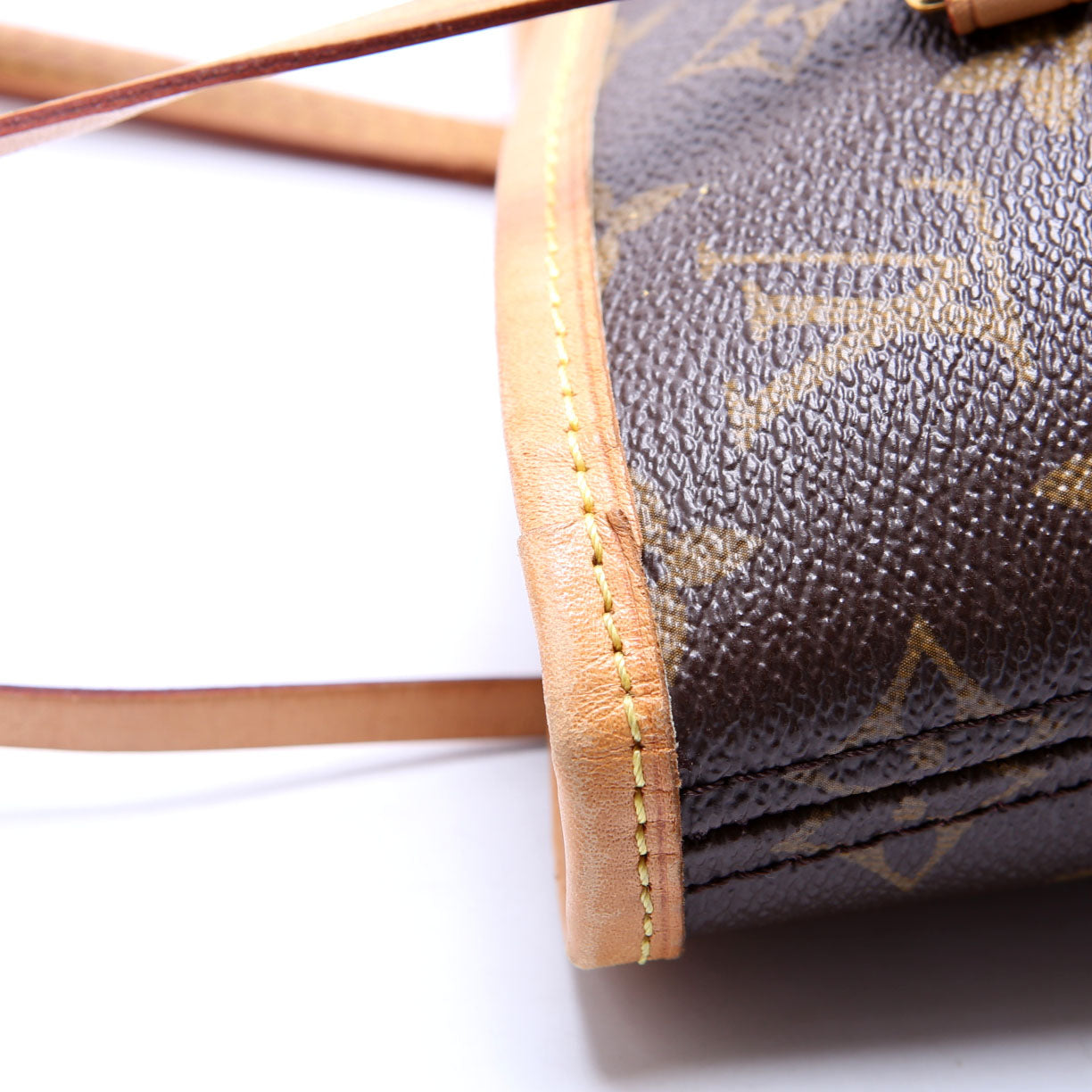 Exterior: The exterior coated canvas shows fading. The corners show light wear and rubbing. The leather detail shows wear, discoloration, and rubbing.