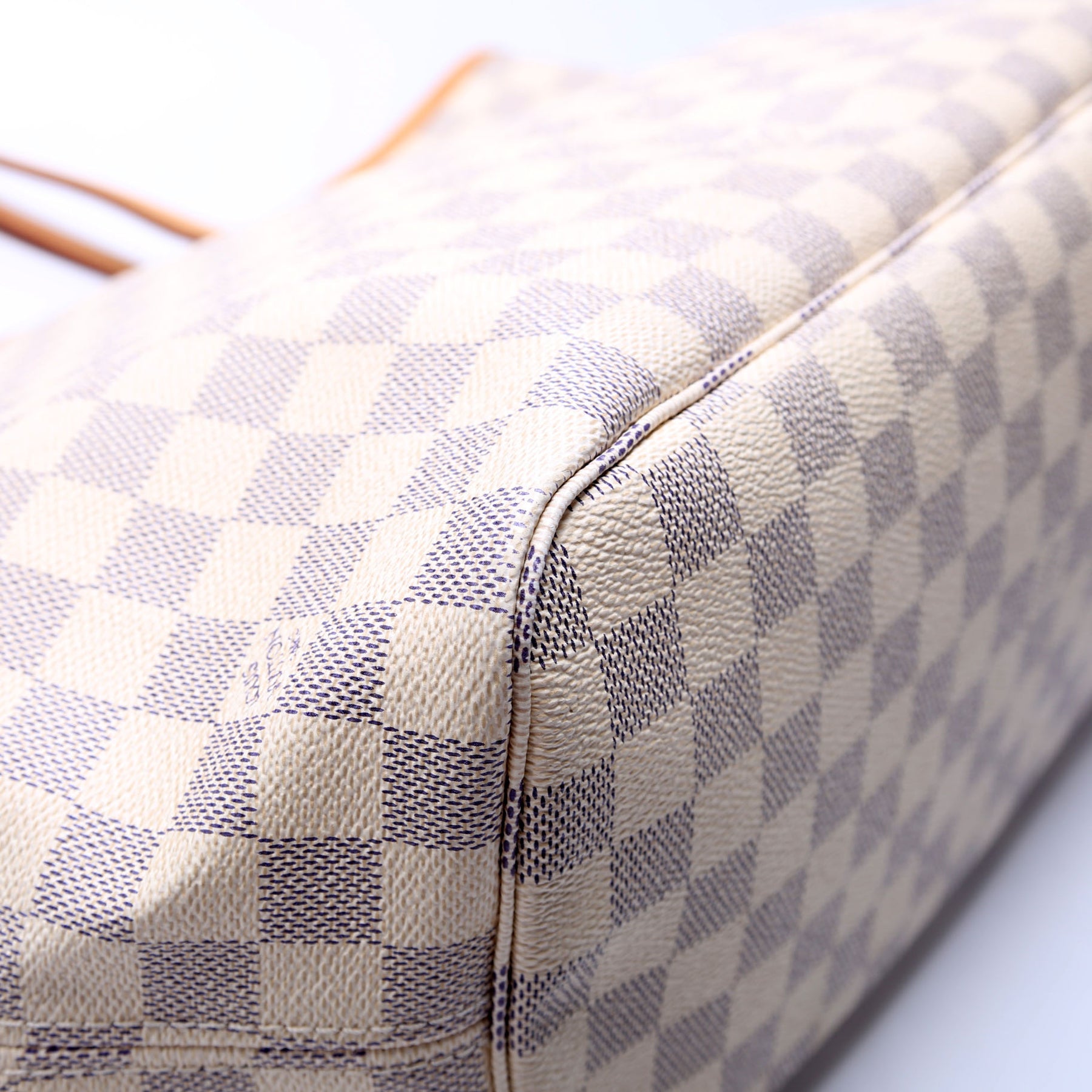 This pre-owned Louis Vuitton Neverfull MM W/Wallet is guaranteed 100% authentic. The exterior is in the classic Louis Vuitton Damier Azur coated canvas.