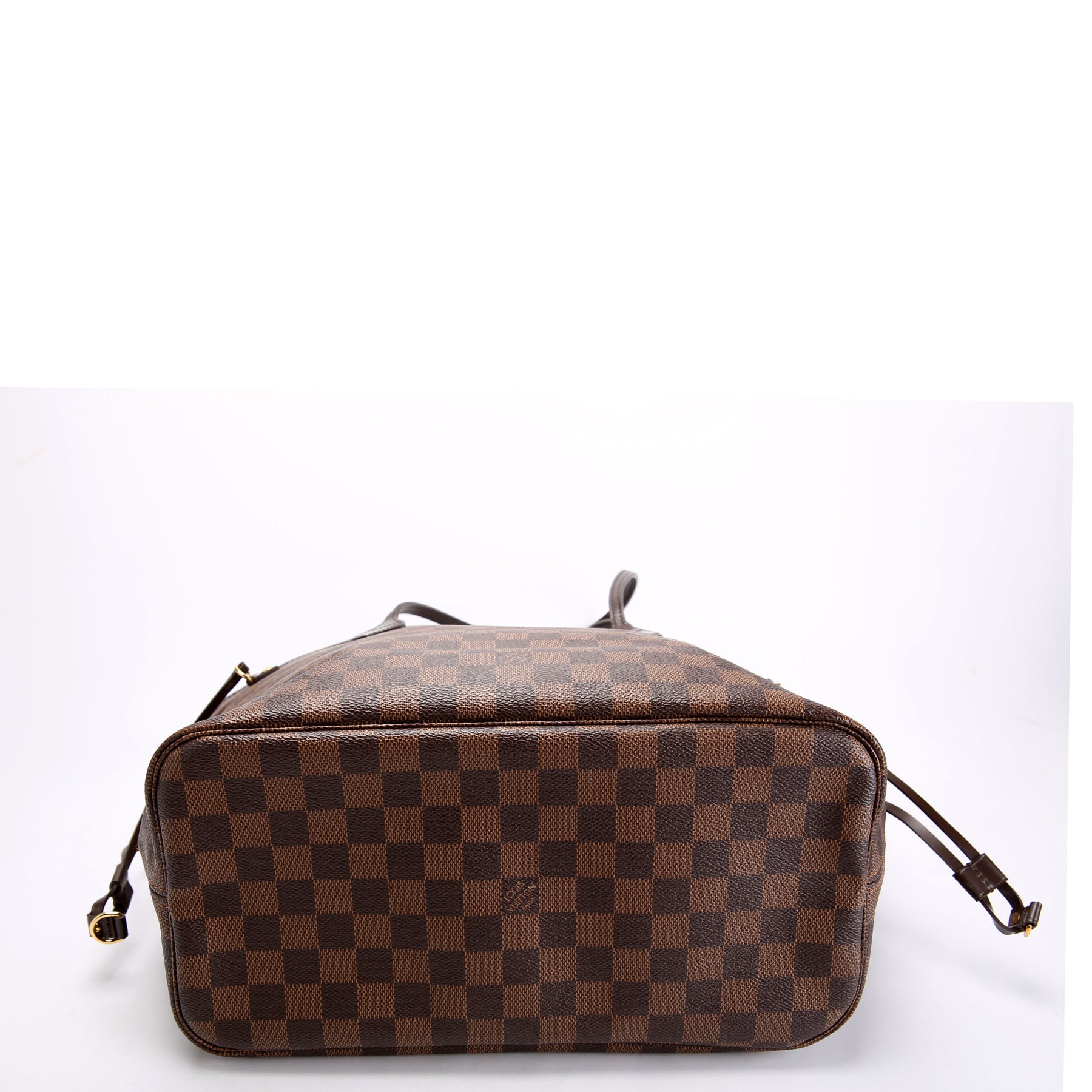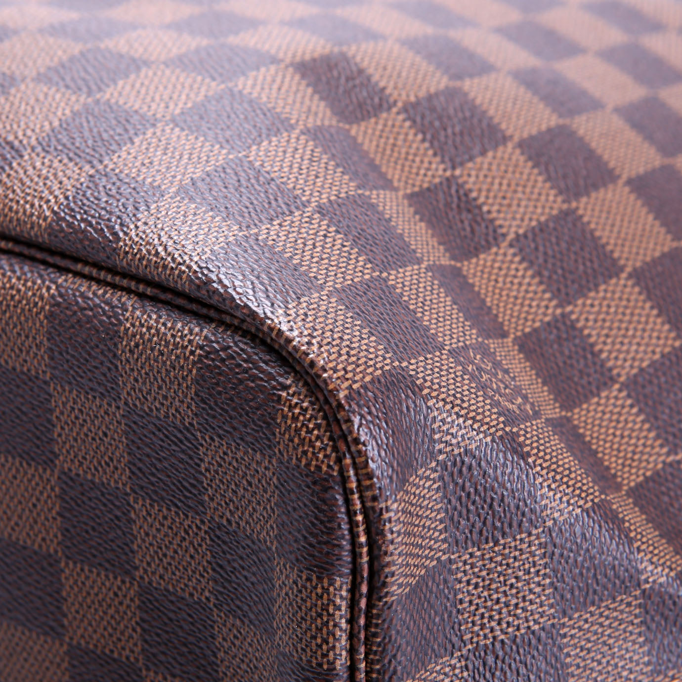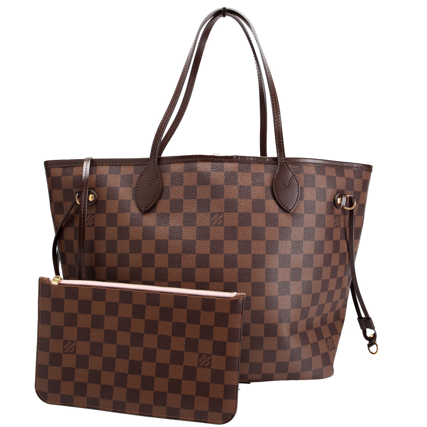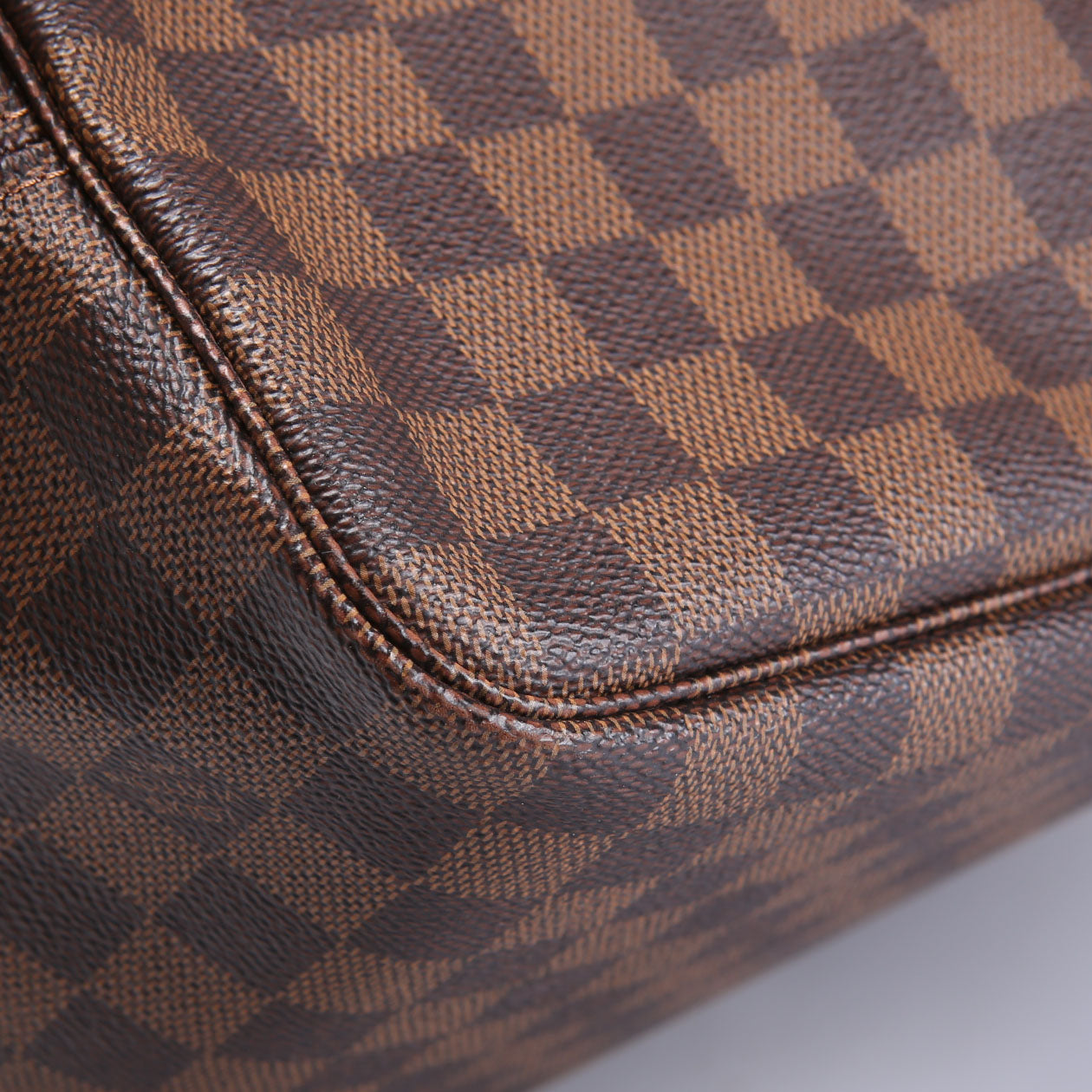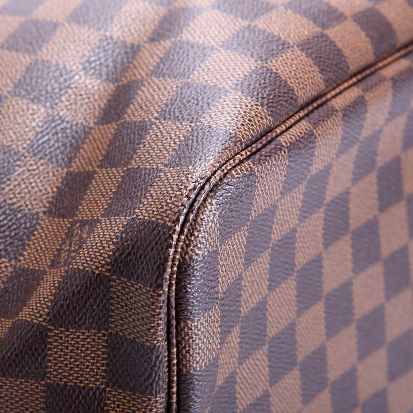 This pre-owned Louis Vuitton Neverfull With Wallet MM is guaranteed 100% authentic. The exterior is in the classic Louis Vuitton Damier Ebene coated canvas.