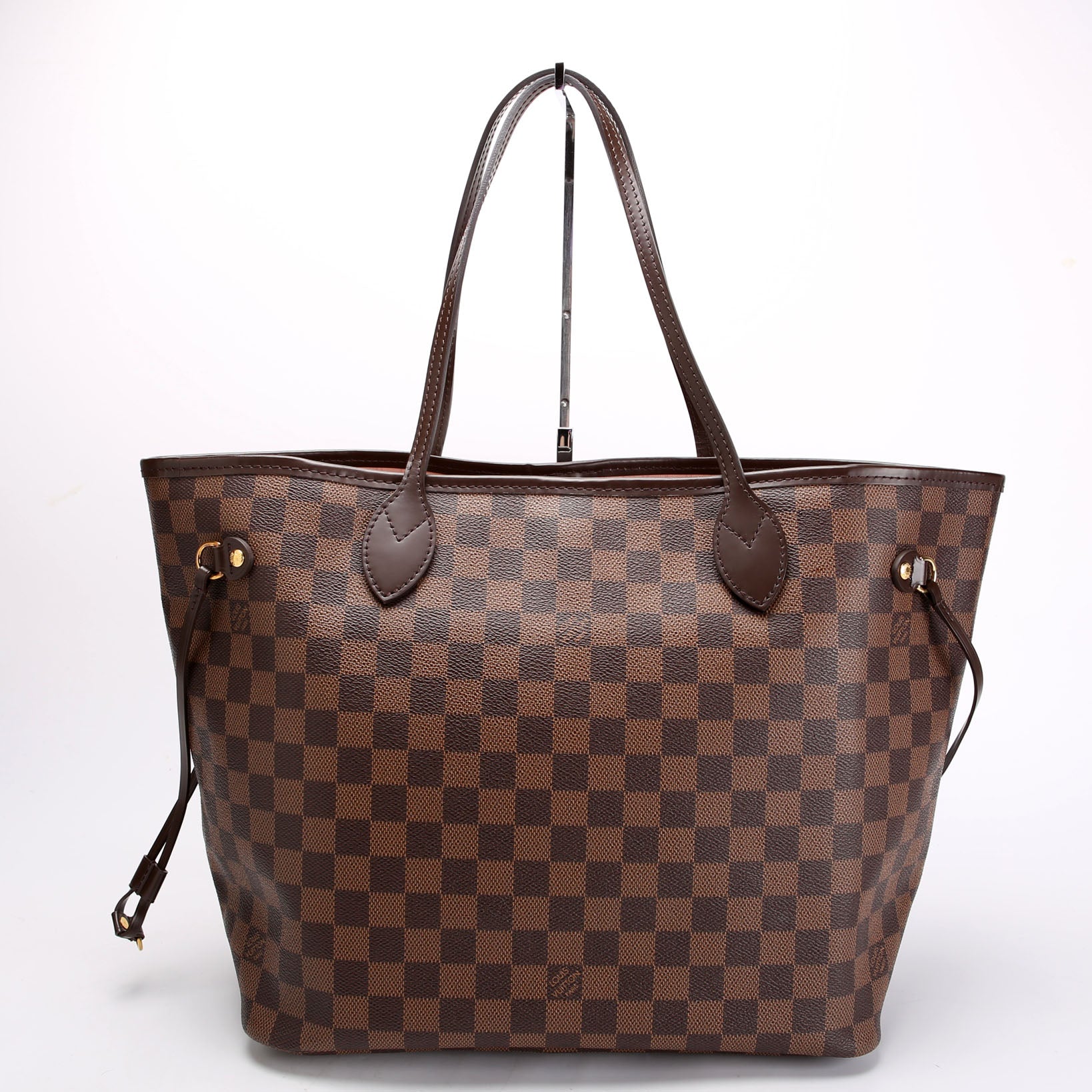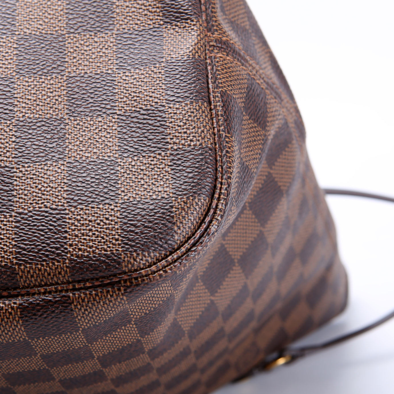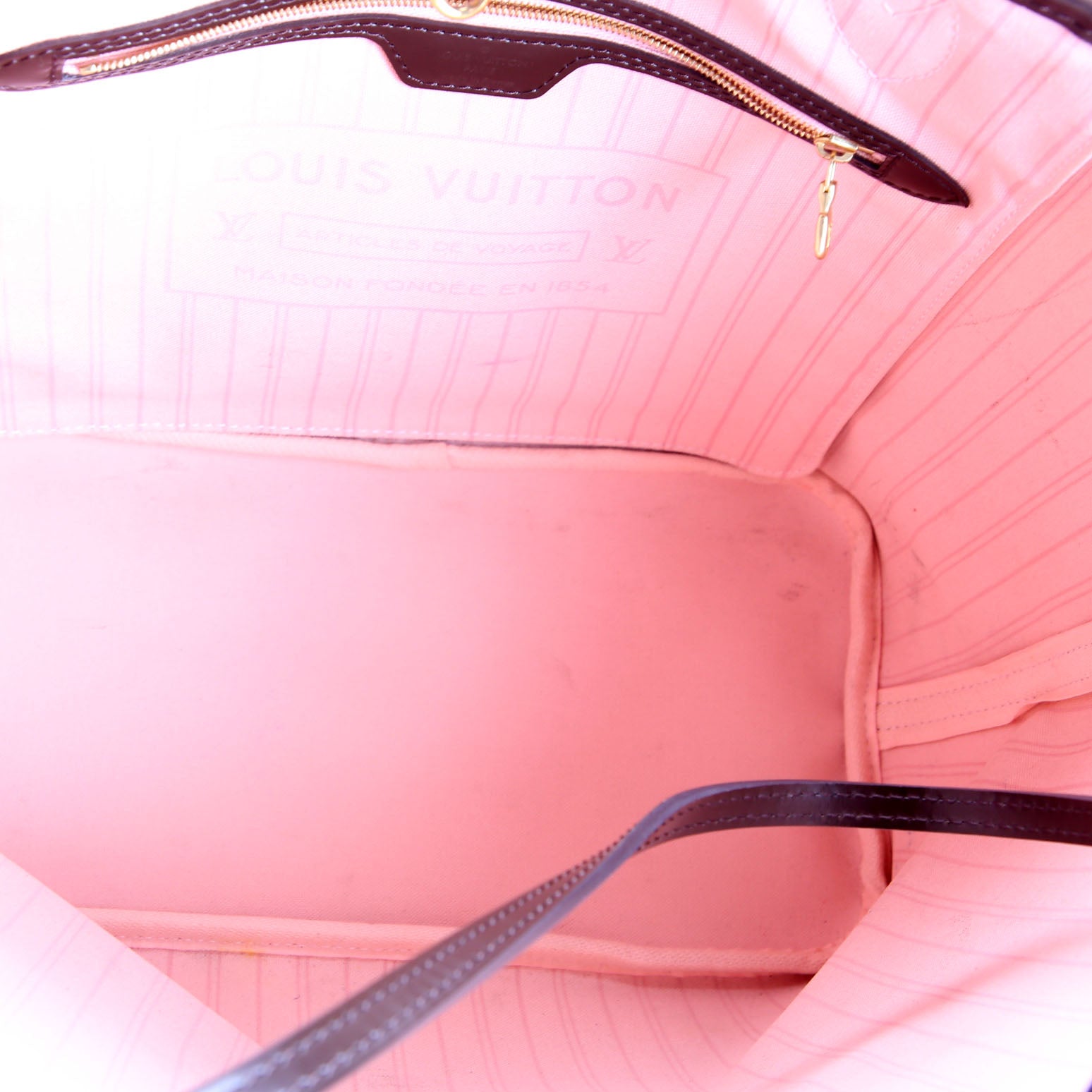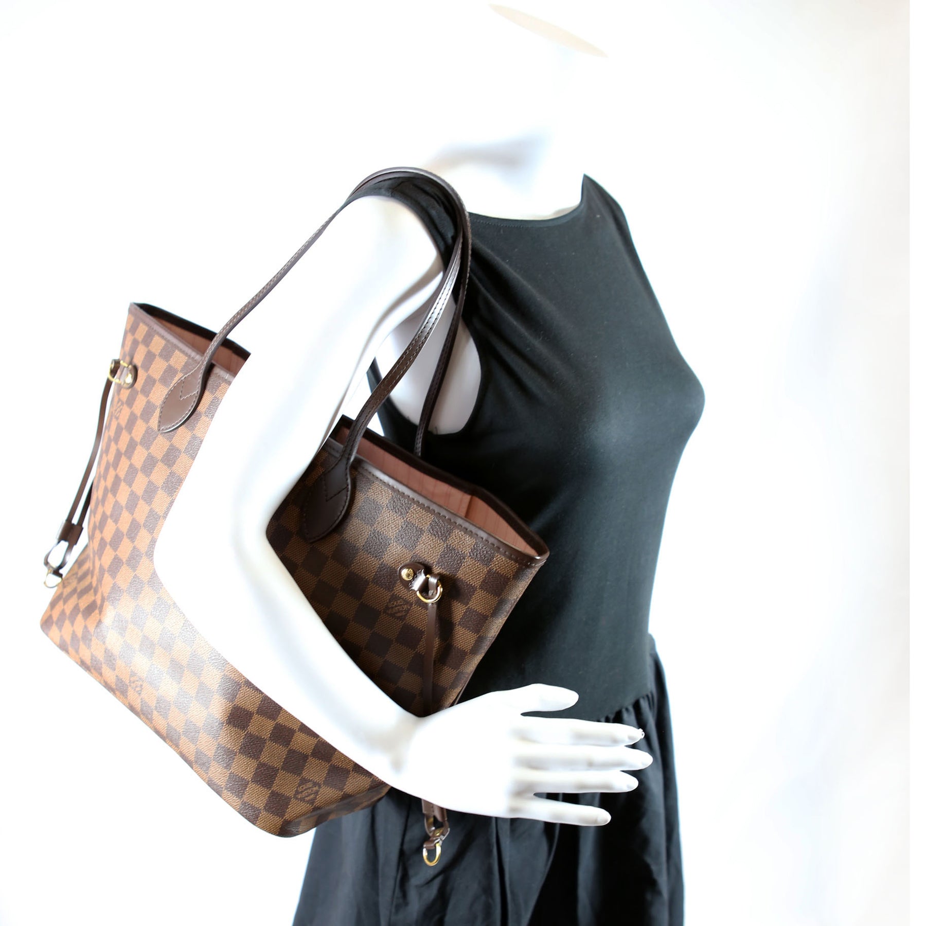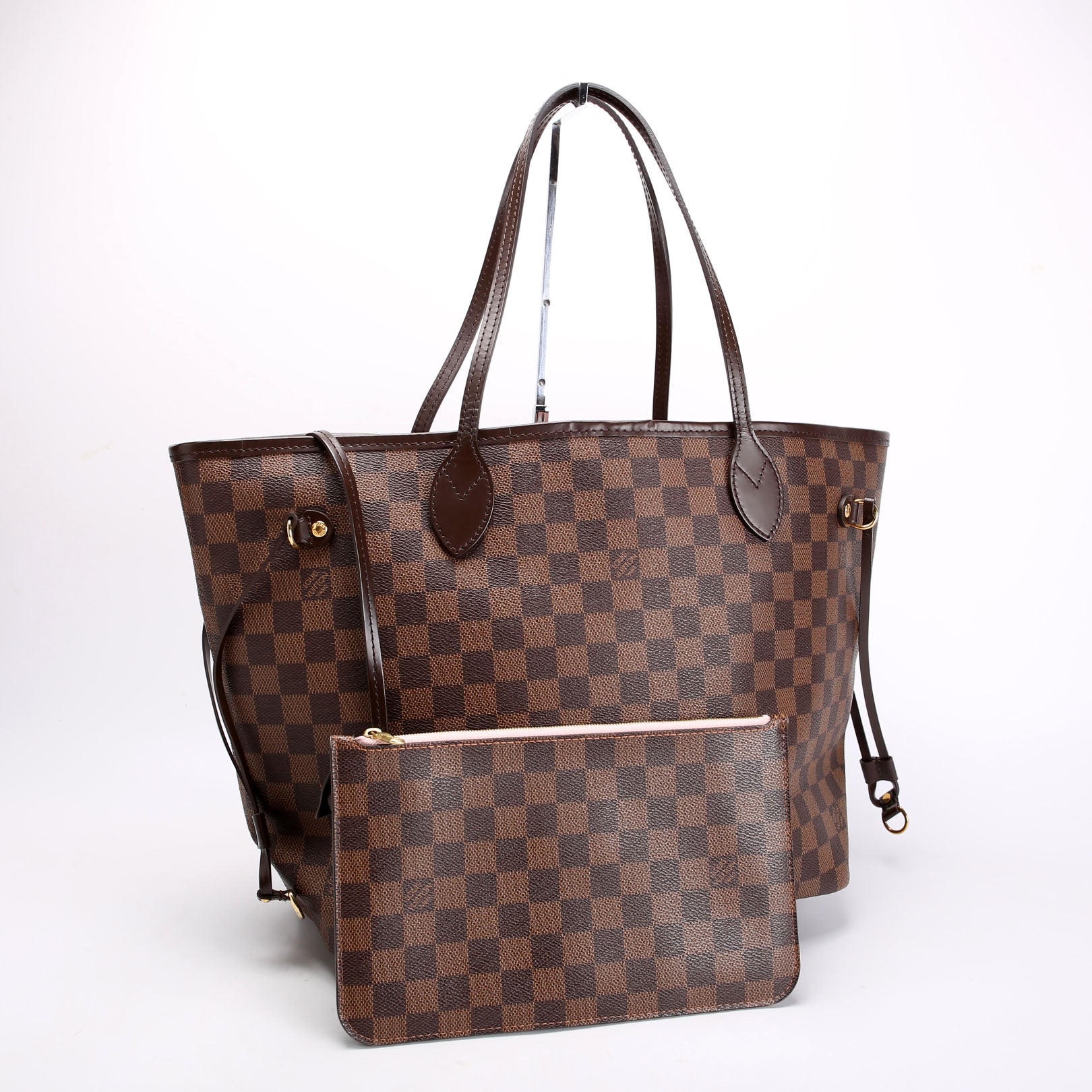 This pre-owned Louis Vuitton Neverfull With Wallet MM is guaranteed 100% authentic. The exterior is in the classic Louis Vuitton Damier Ebene coated canvas.