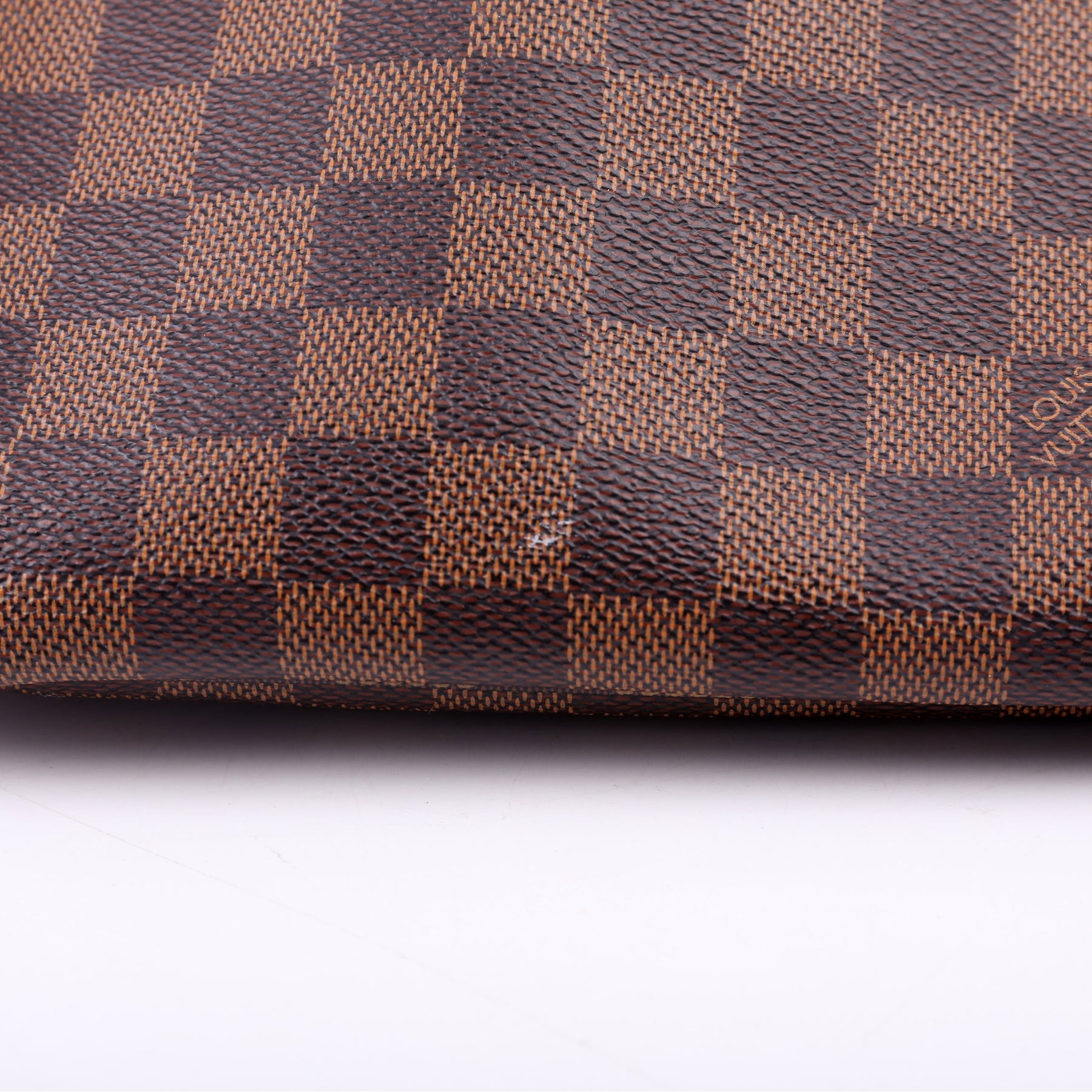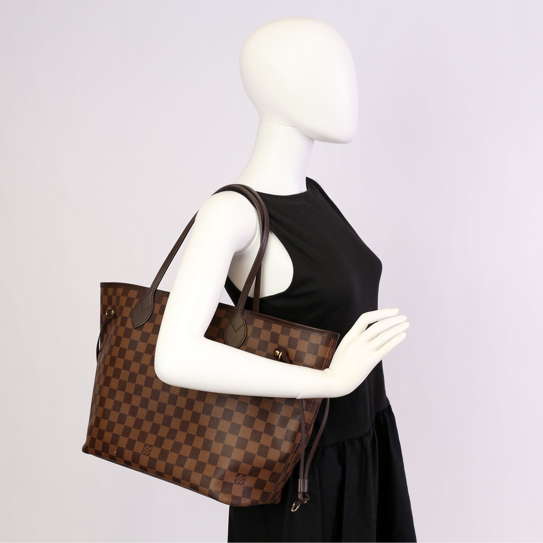 This pre-owned Louis Vuitton Neverfull MM is guaranteed 100% authentic. The exterior is in the classic Louis Vuitton Damier Ebene coated canvas.