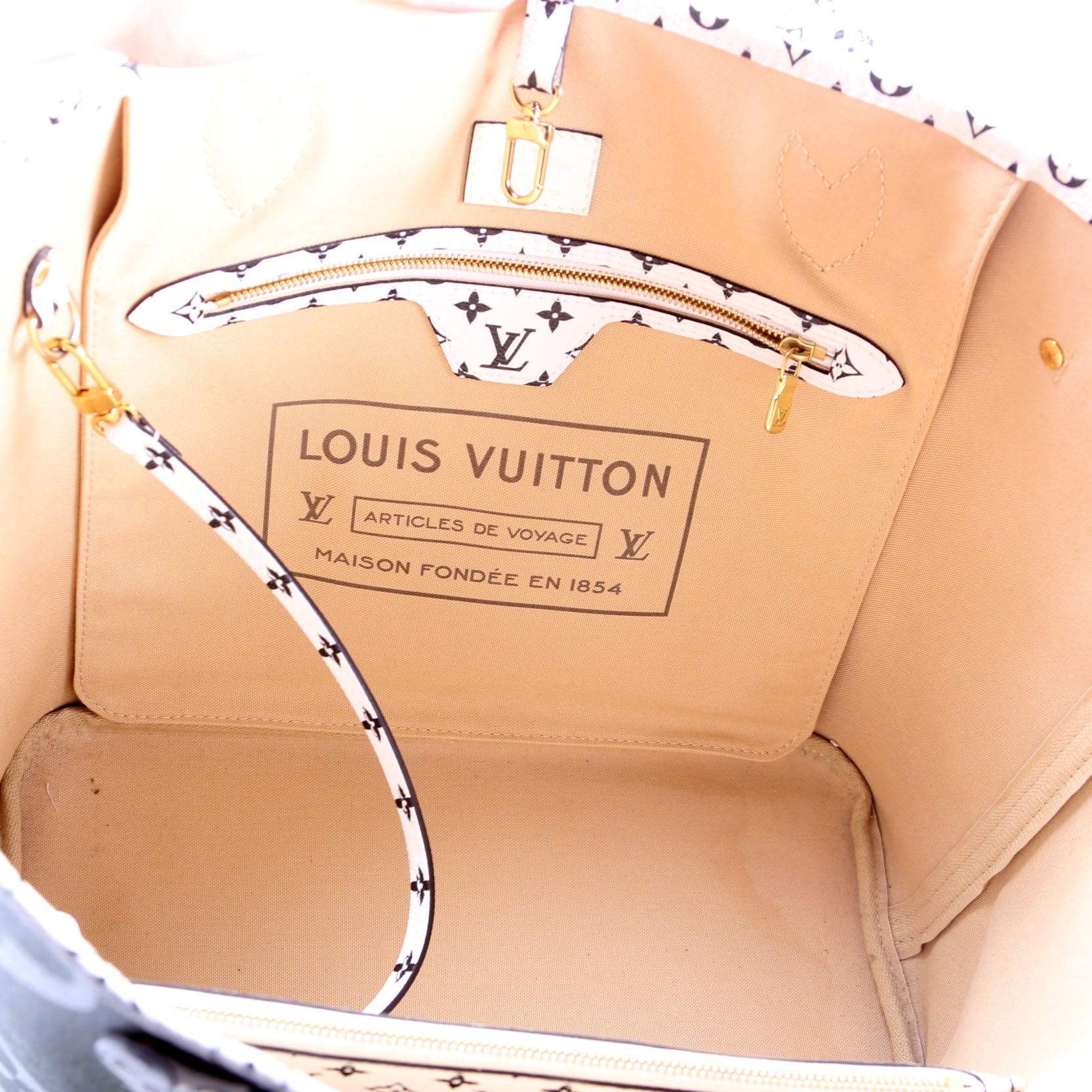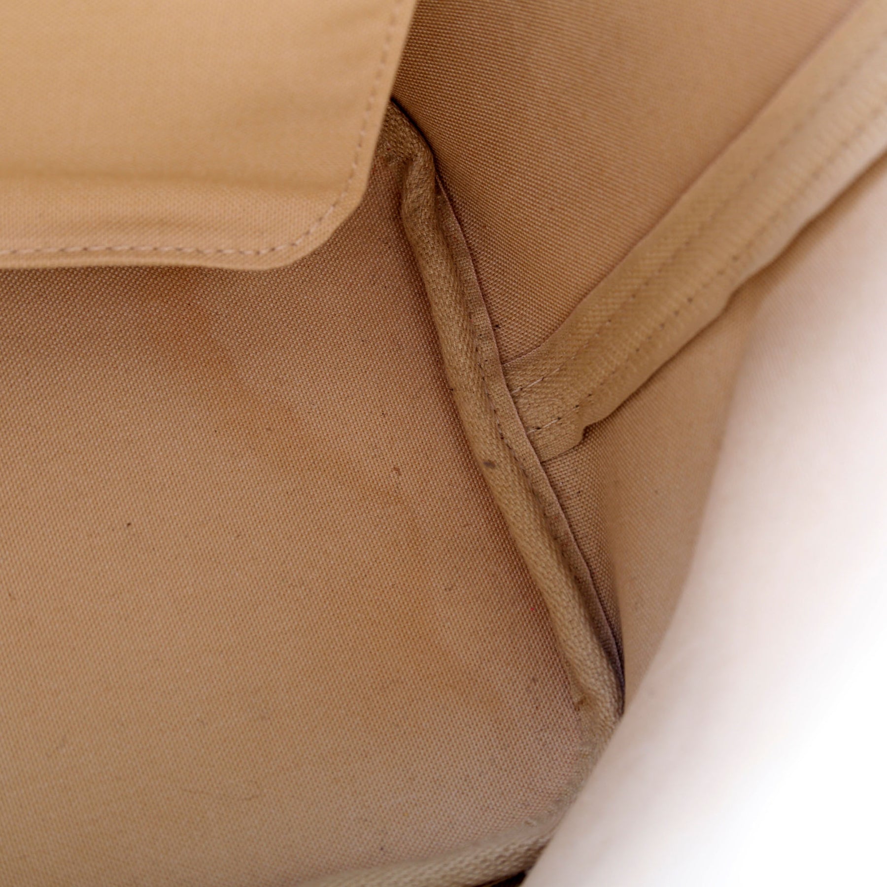 Interior: The interior shows light staining throughout the fabric. The interior features one zip closure pocket and one removable pochette.